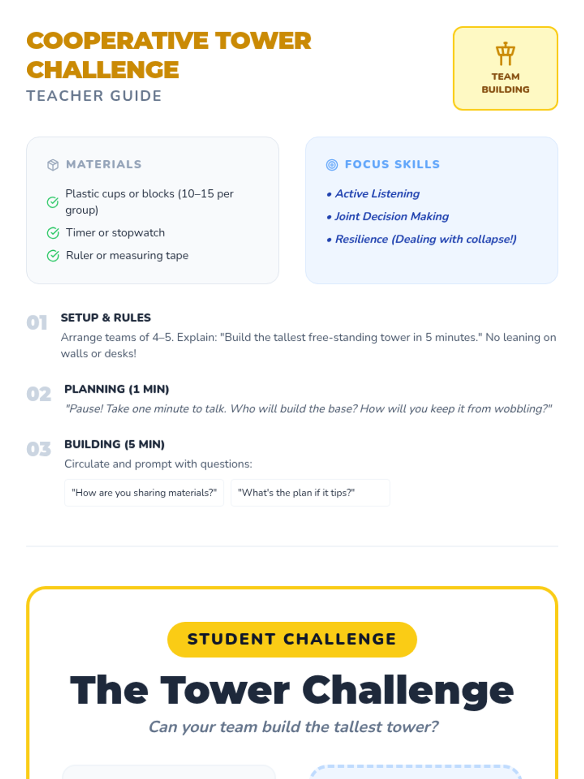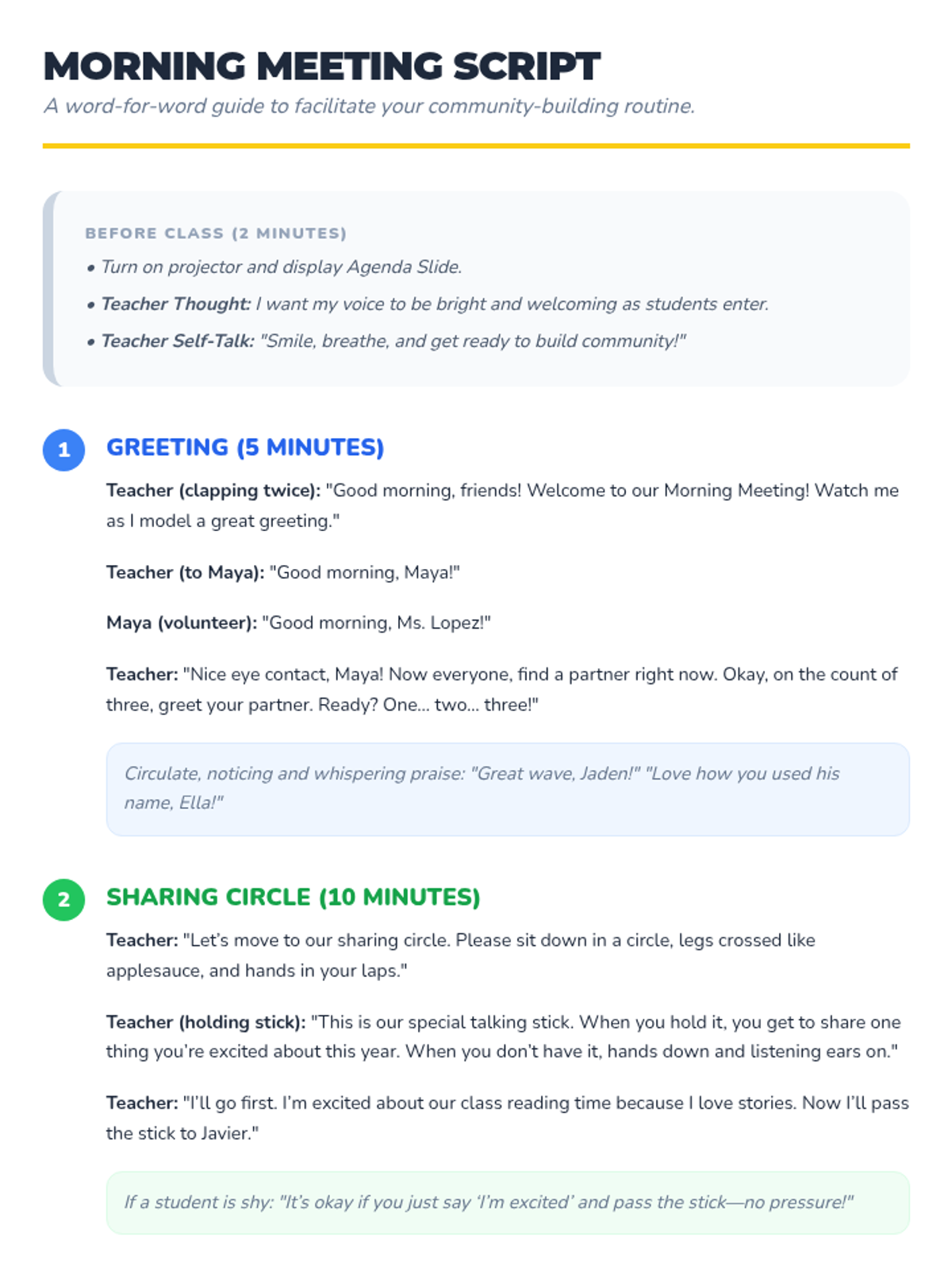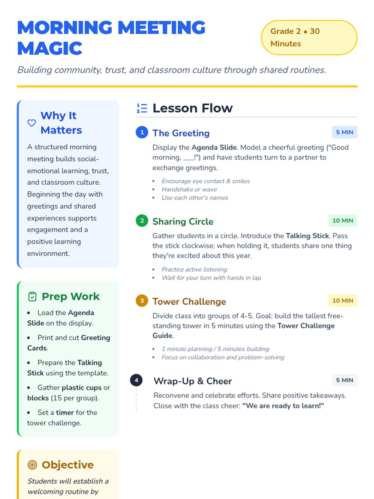 A 30-minute Tier 1 morning meeting for 2nd graders to build community through structured greetings, sharing circles, and collaborative team challenges.