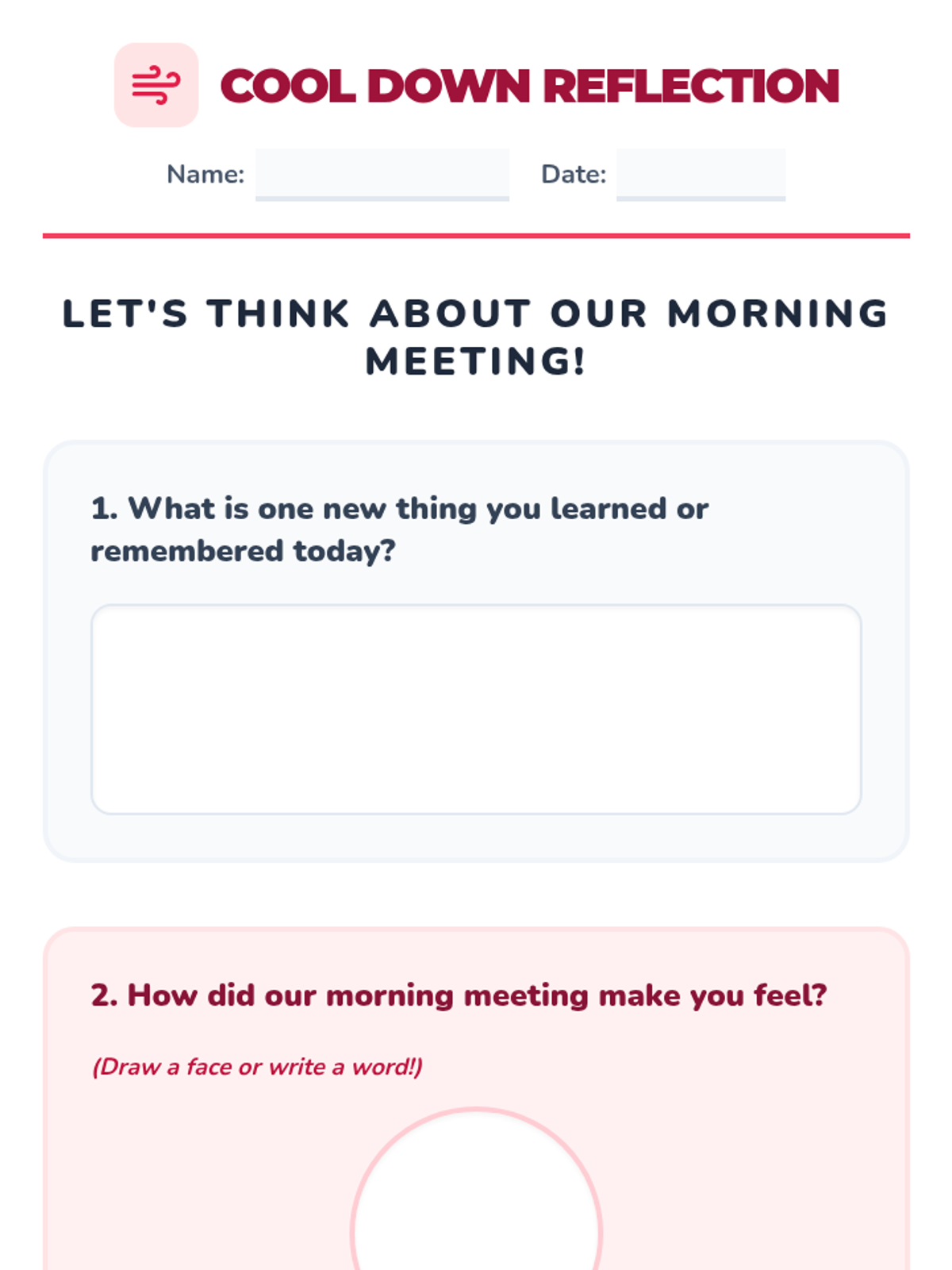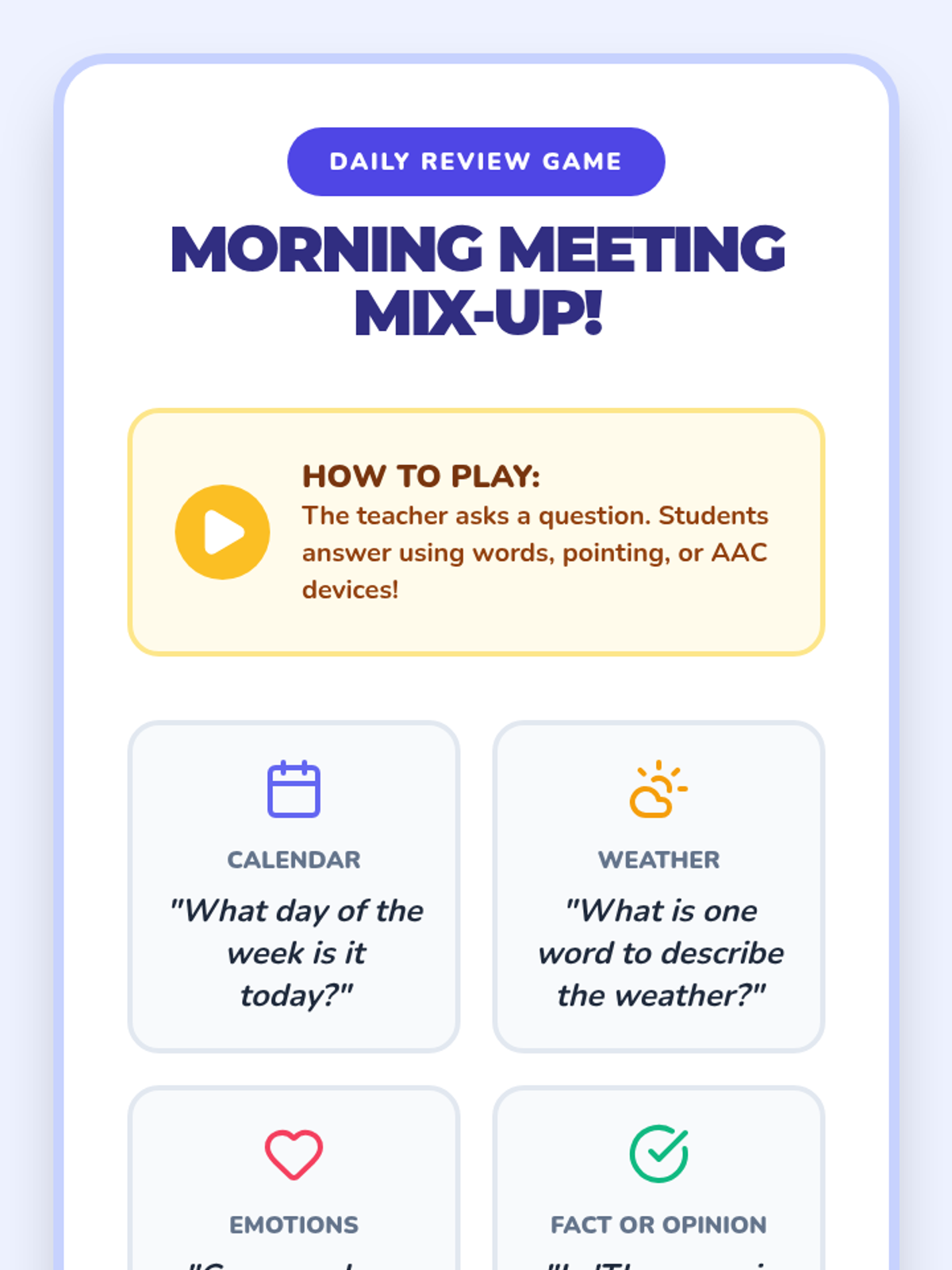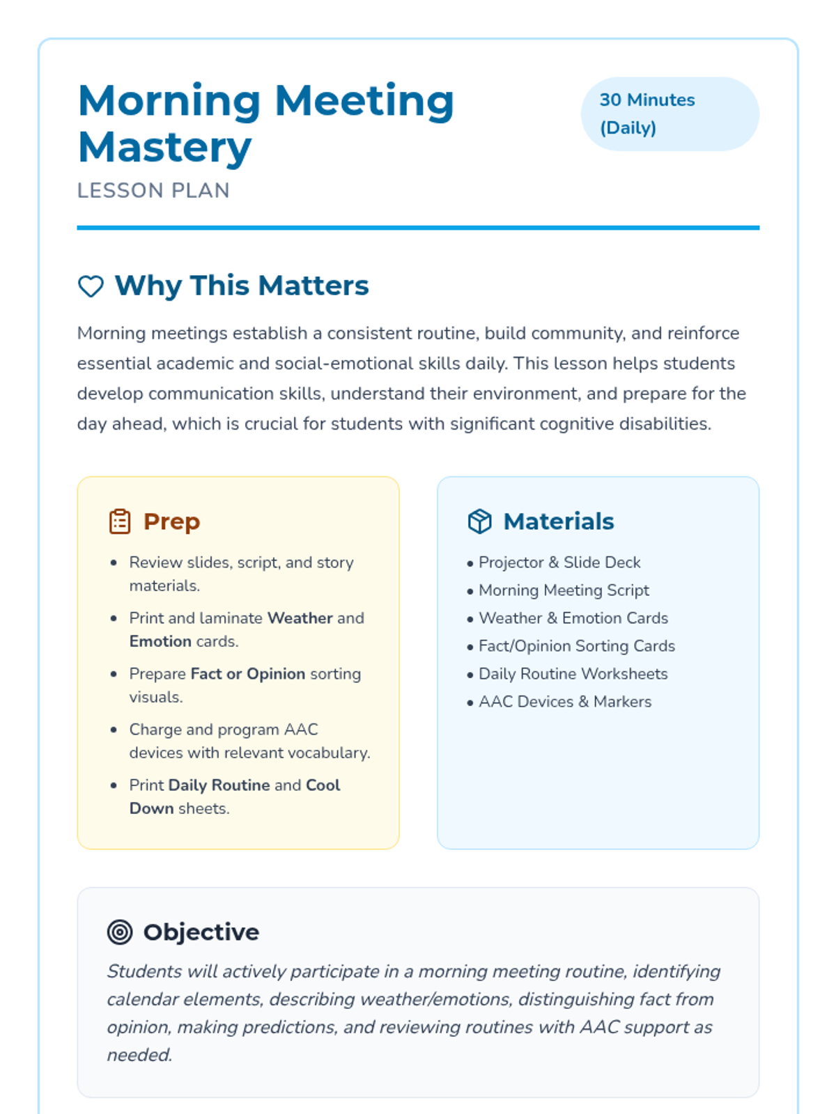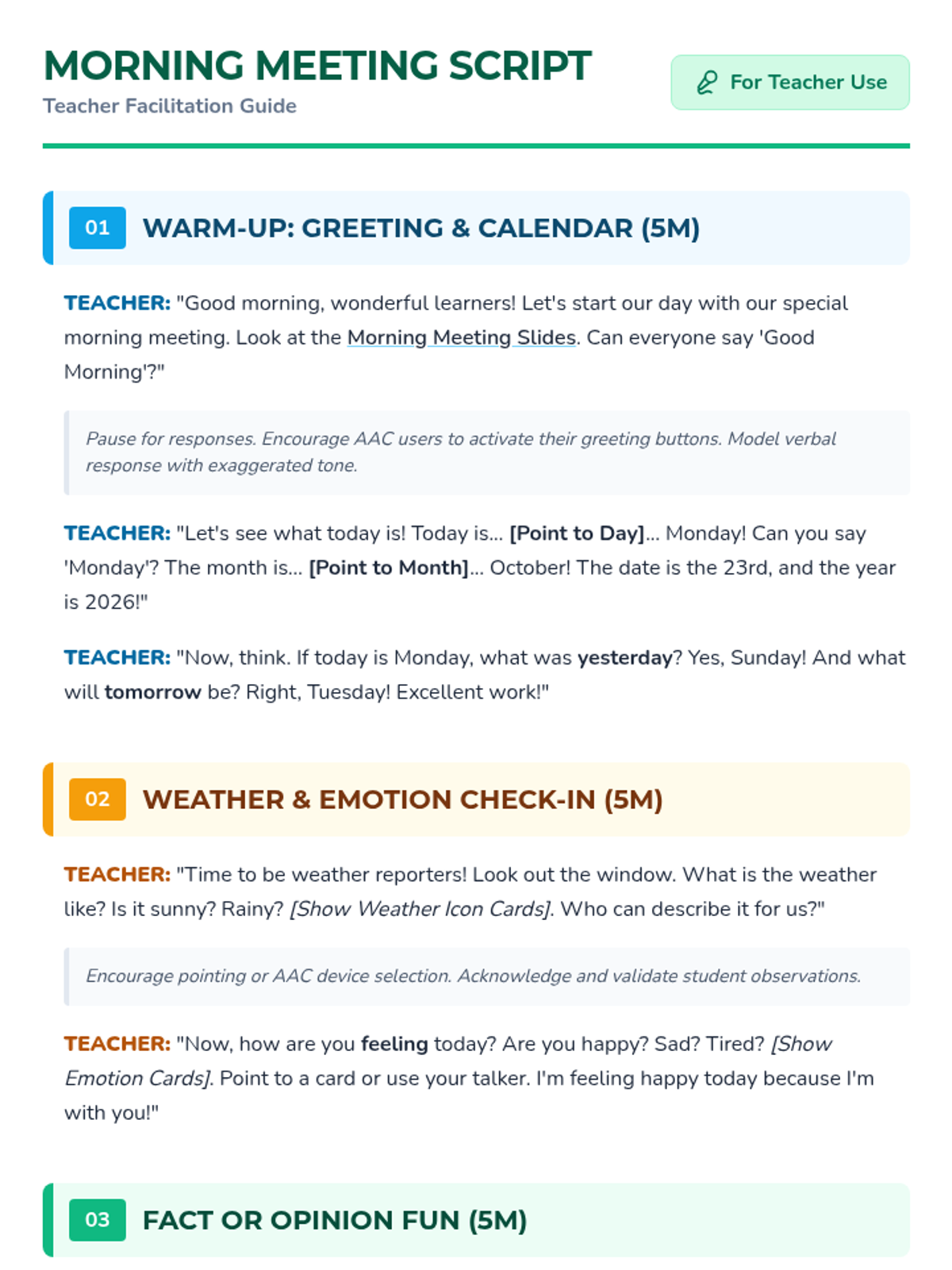 A structured, interactive morning meeting routine for middle school students with significant cognitive disabilities, focusing on communication, temporal concepts, and social-emotional check-ins.
