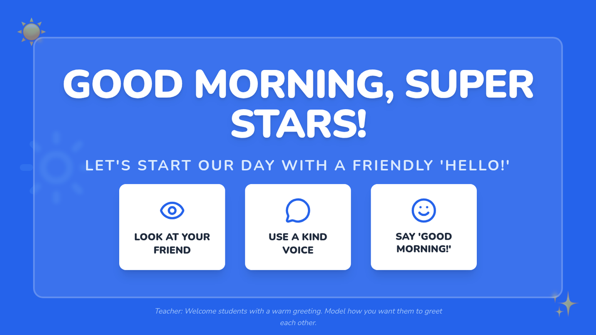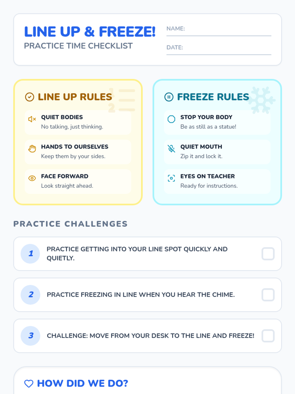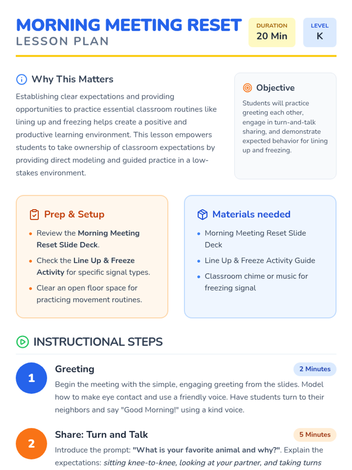 A 20-minute morning meeting for Kindergarten students focused on resetting expectations for line order and freezing through interactive practice and discussion.