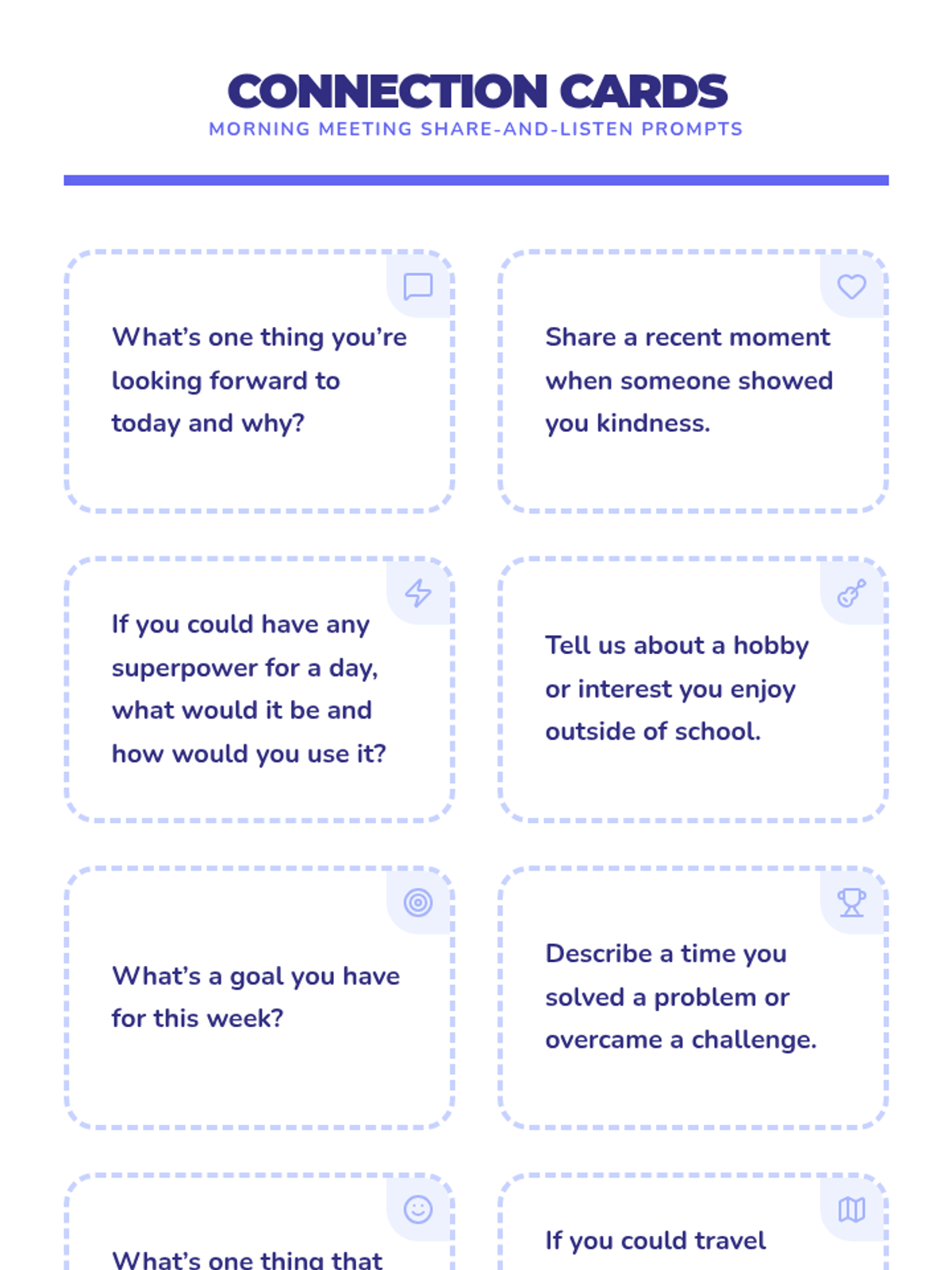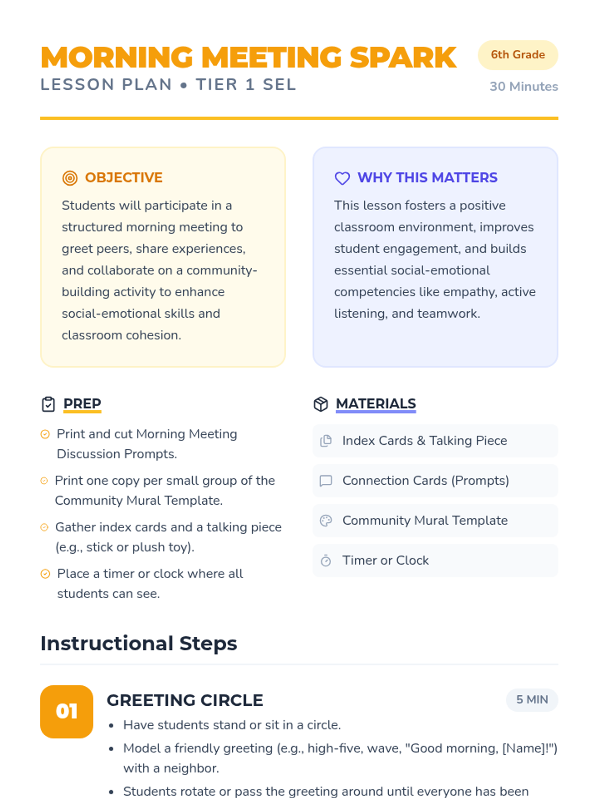 A 30-minute Tier 1 morning meeting lesson for 6th graders designed to build community, boost social-emotional skills, and set a positive tone for the day through structured greetings, sharing, and collaboration.