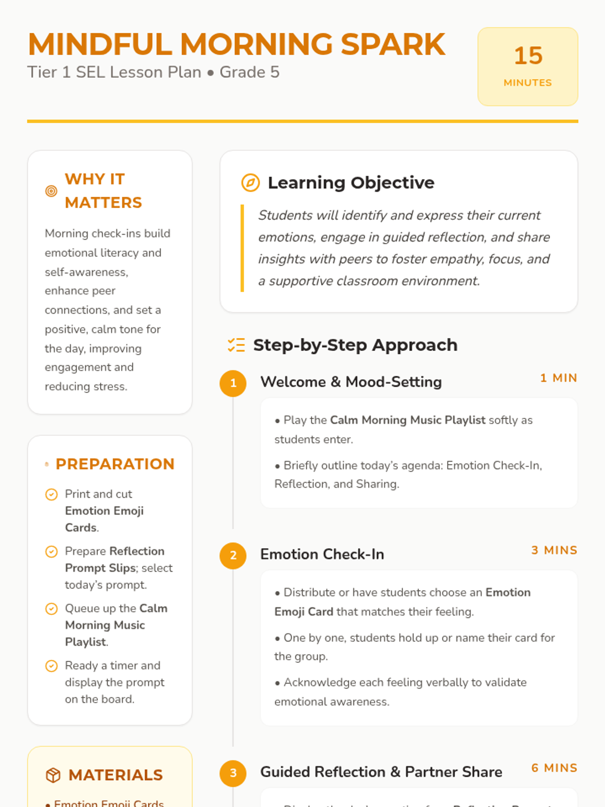 A 15-minute SEL-focused morning meeting session for 5th graders to build emotional awareness, self-regulation, and community connection. This Tier 1 lesson helps students start the day positively, fostering a supportive classroom environment.