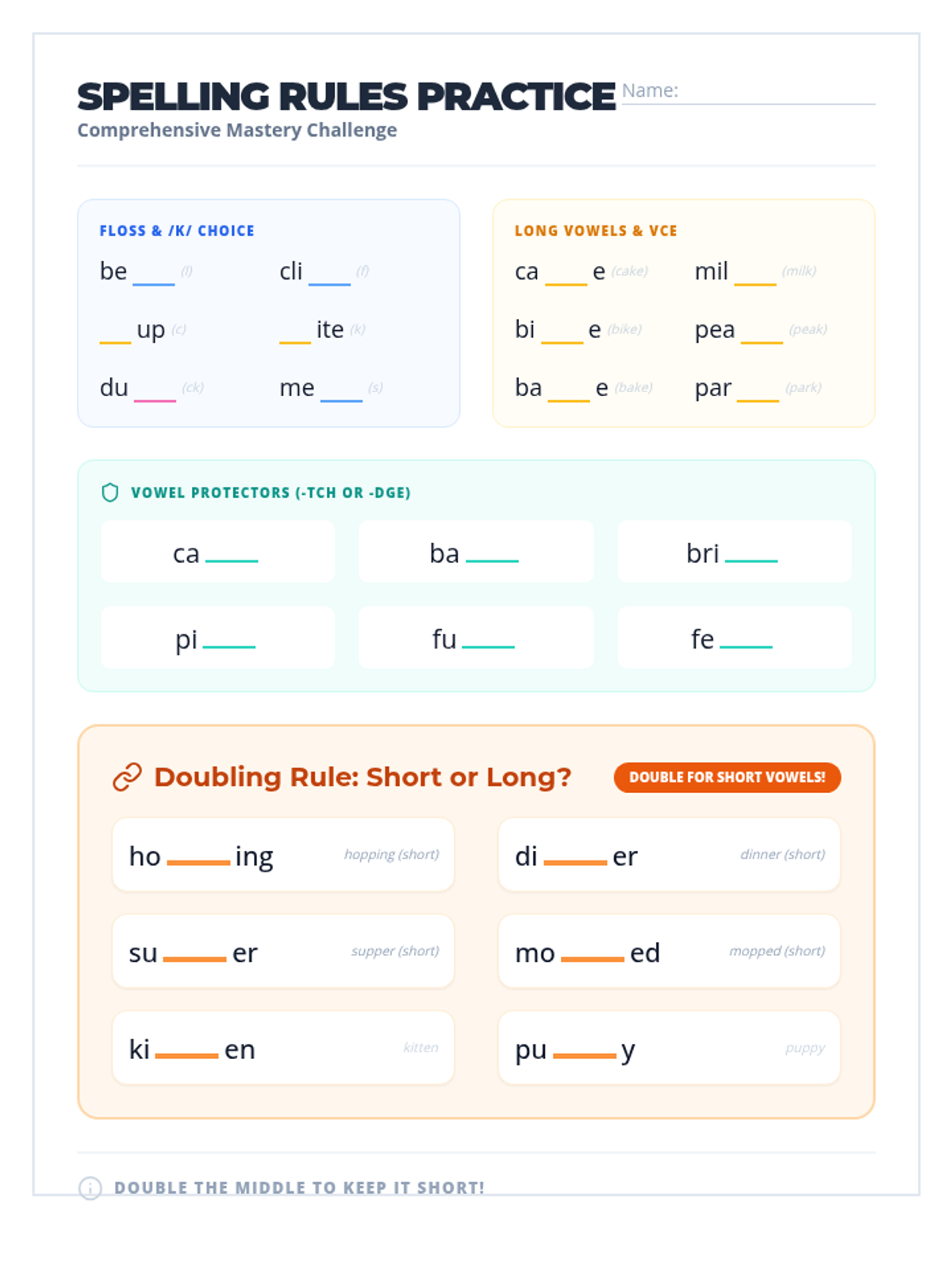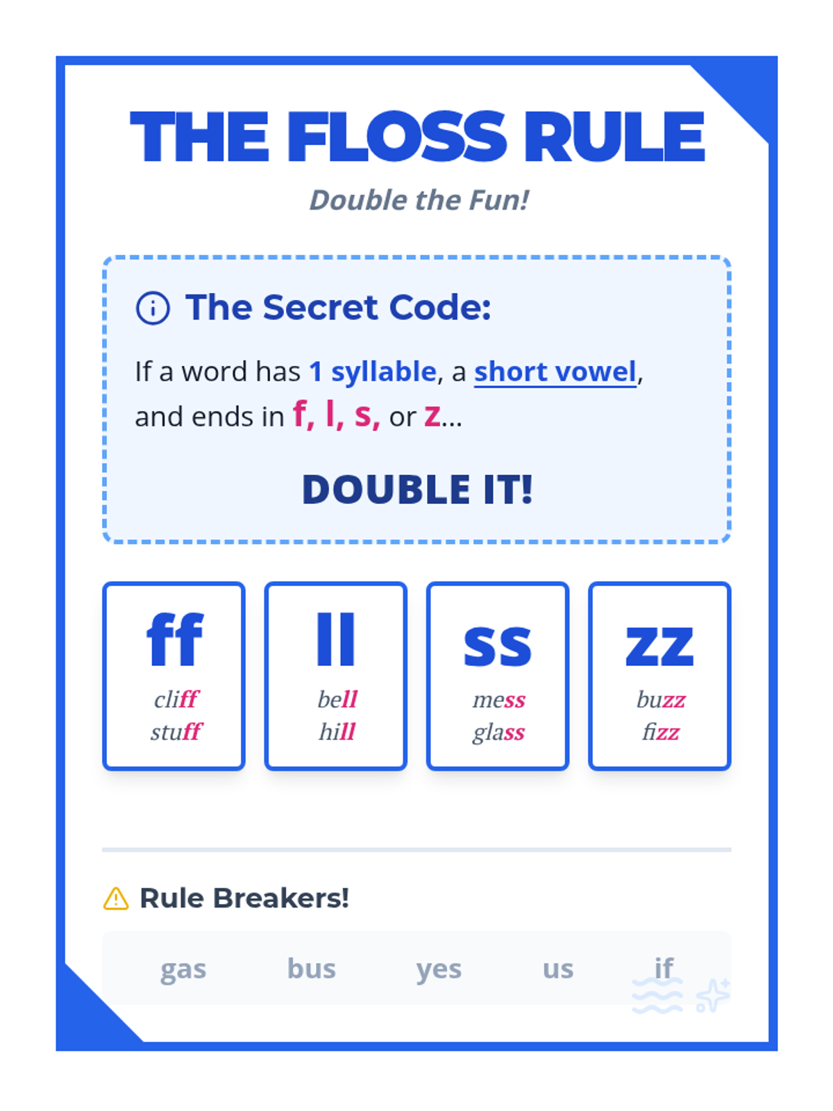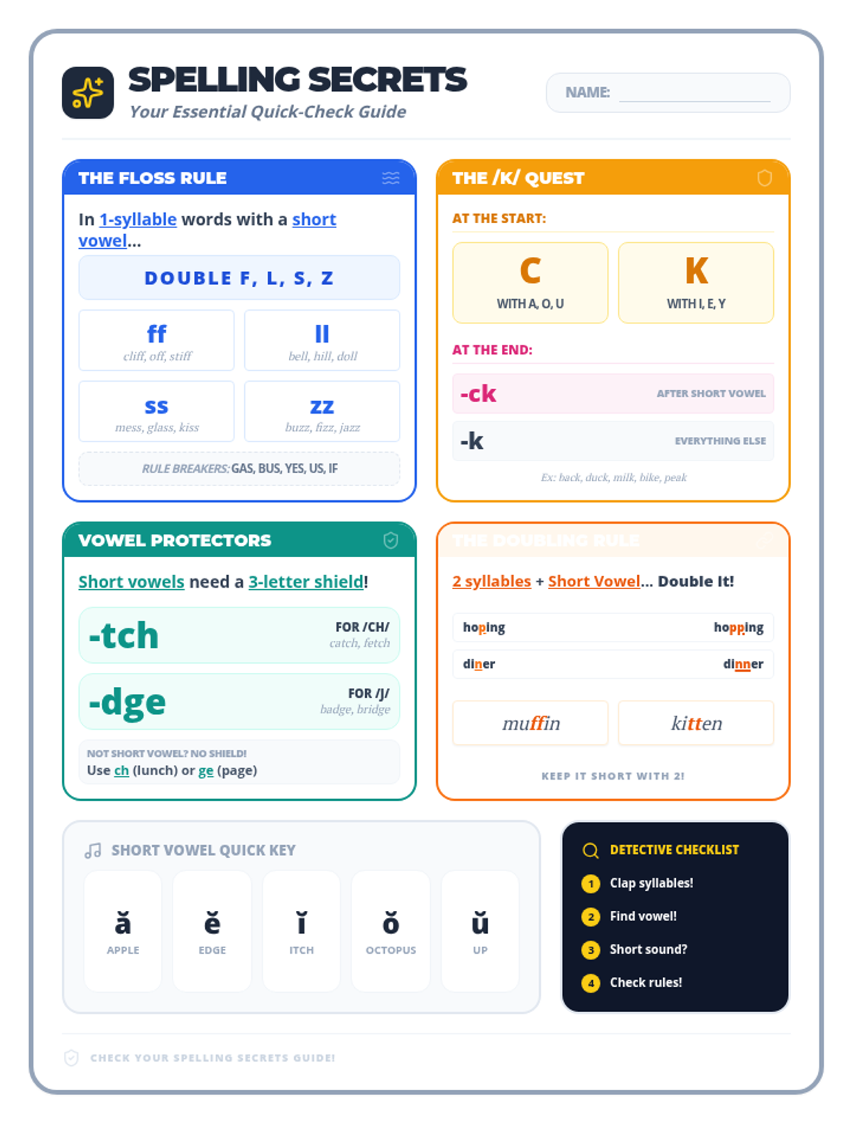 A collection of visual anchor charts and notebook inserts to help students master common spelling rules including the FLOSS rule and the C/K/CK spelling choice.