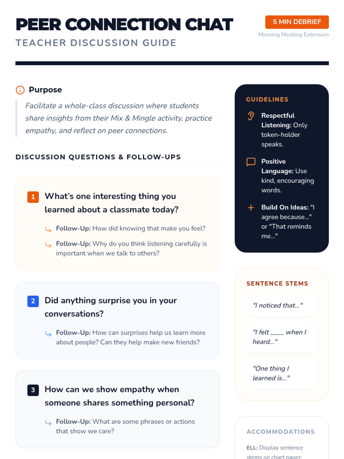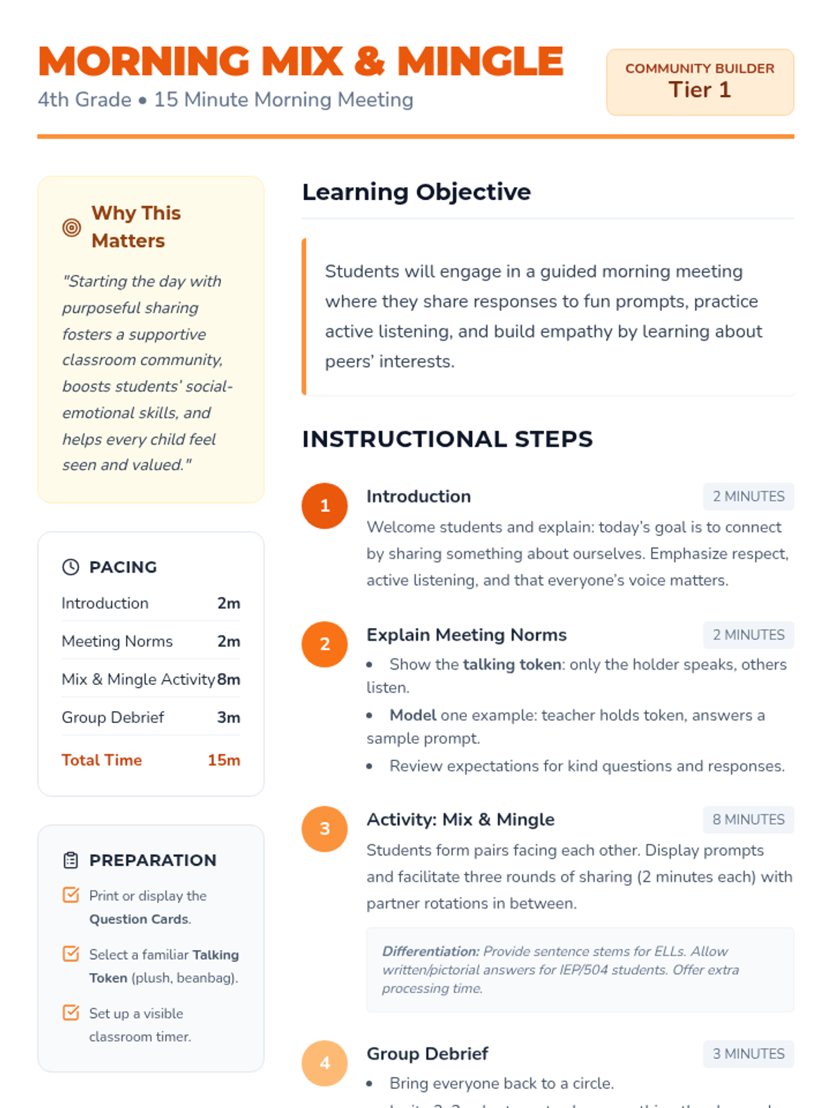 A high-energy 15-minute morning meeting lesson for 4th graders designed to build community through structured peer sharing and active listening. Students rotate through partners to answer fun prompts and then participate in a whole-class reflection.