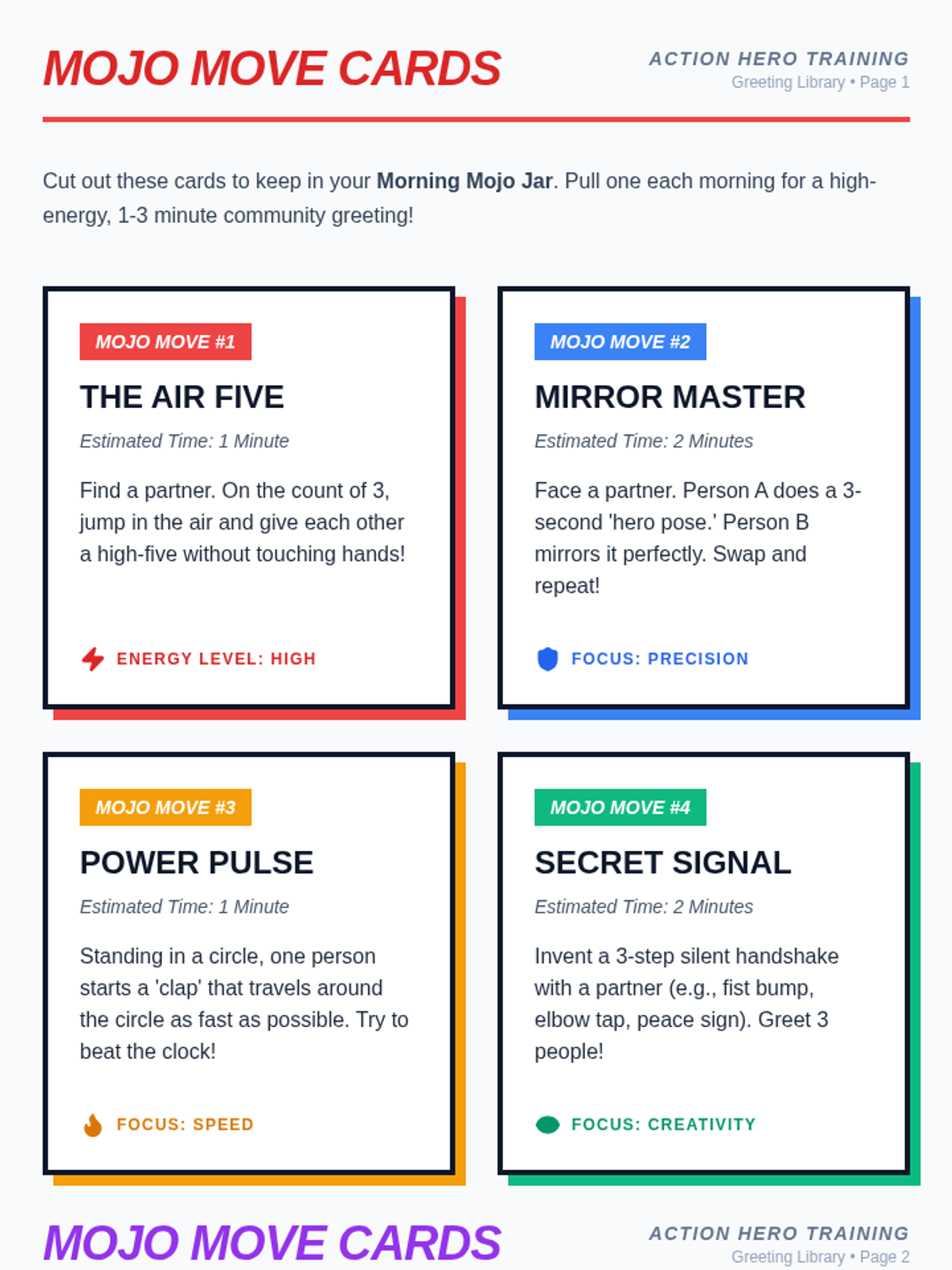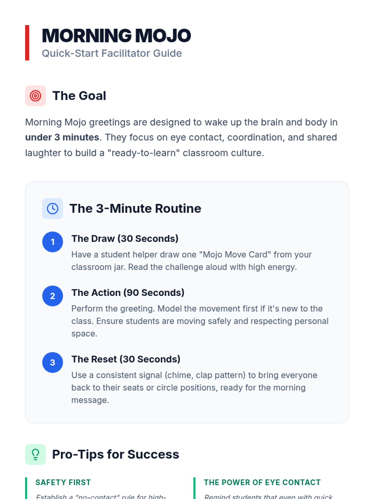 A collection of high-energy, movement-based morning meeting greetings designed to be completed in under 3 minutes. These greetings help build community through shared actions and quick physical engagement.