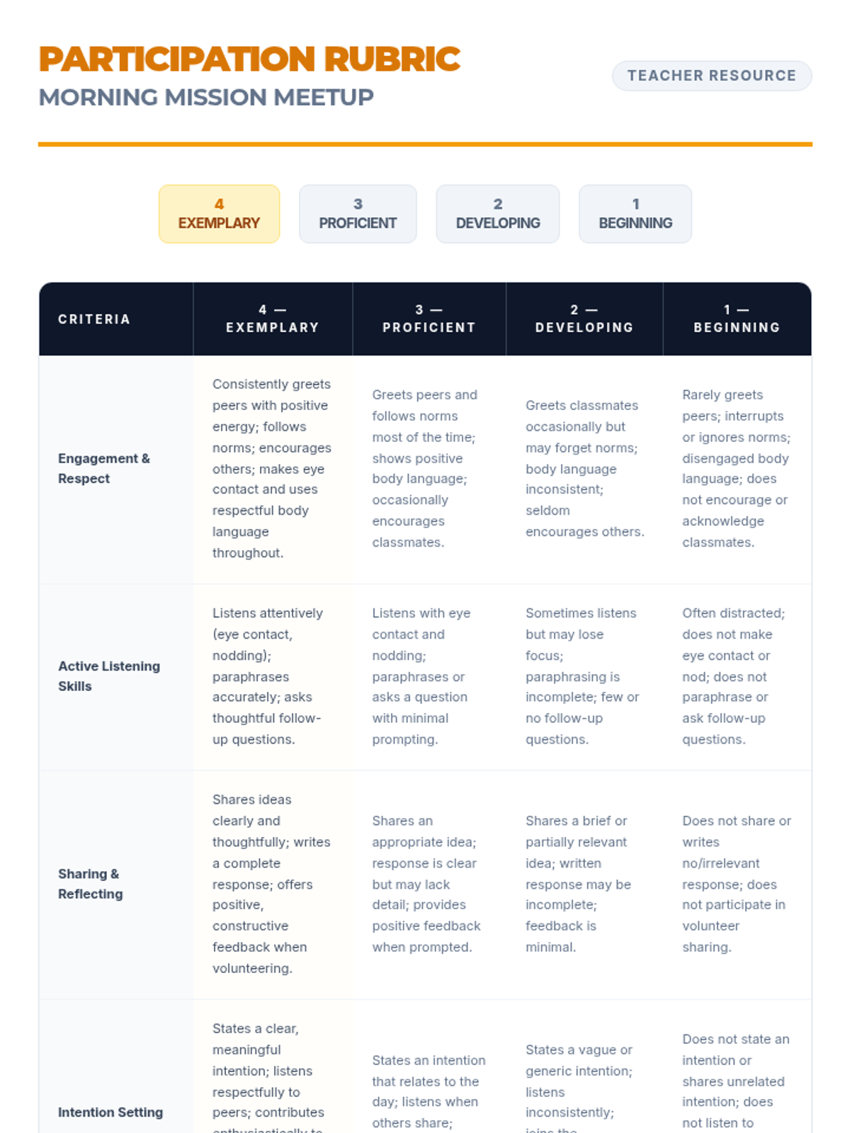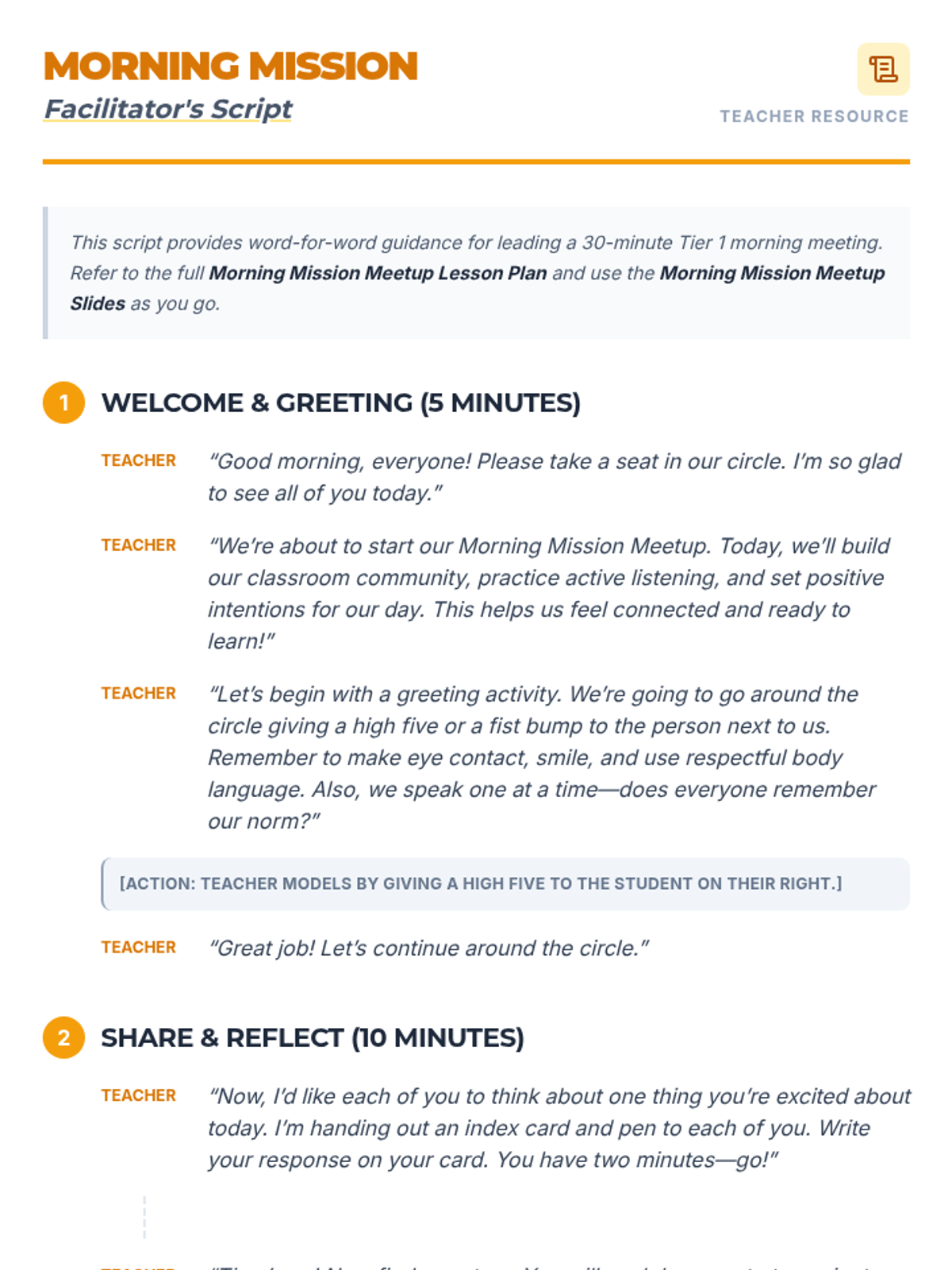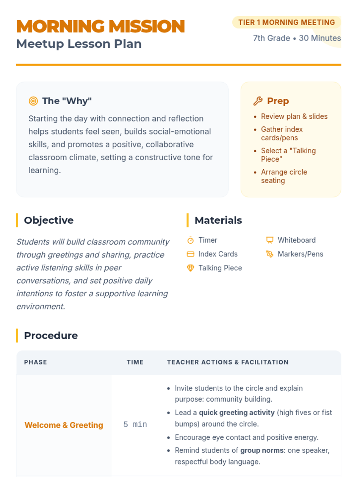 A 30-minute Tier 1 Morning Meeting designed for 7th-grade students to build community, practice active listening, and set daily intentions. This lesson fosters a positive classroom climate through structured sharing and reflection.