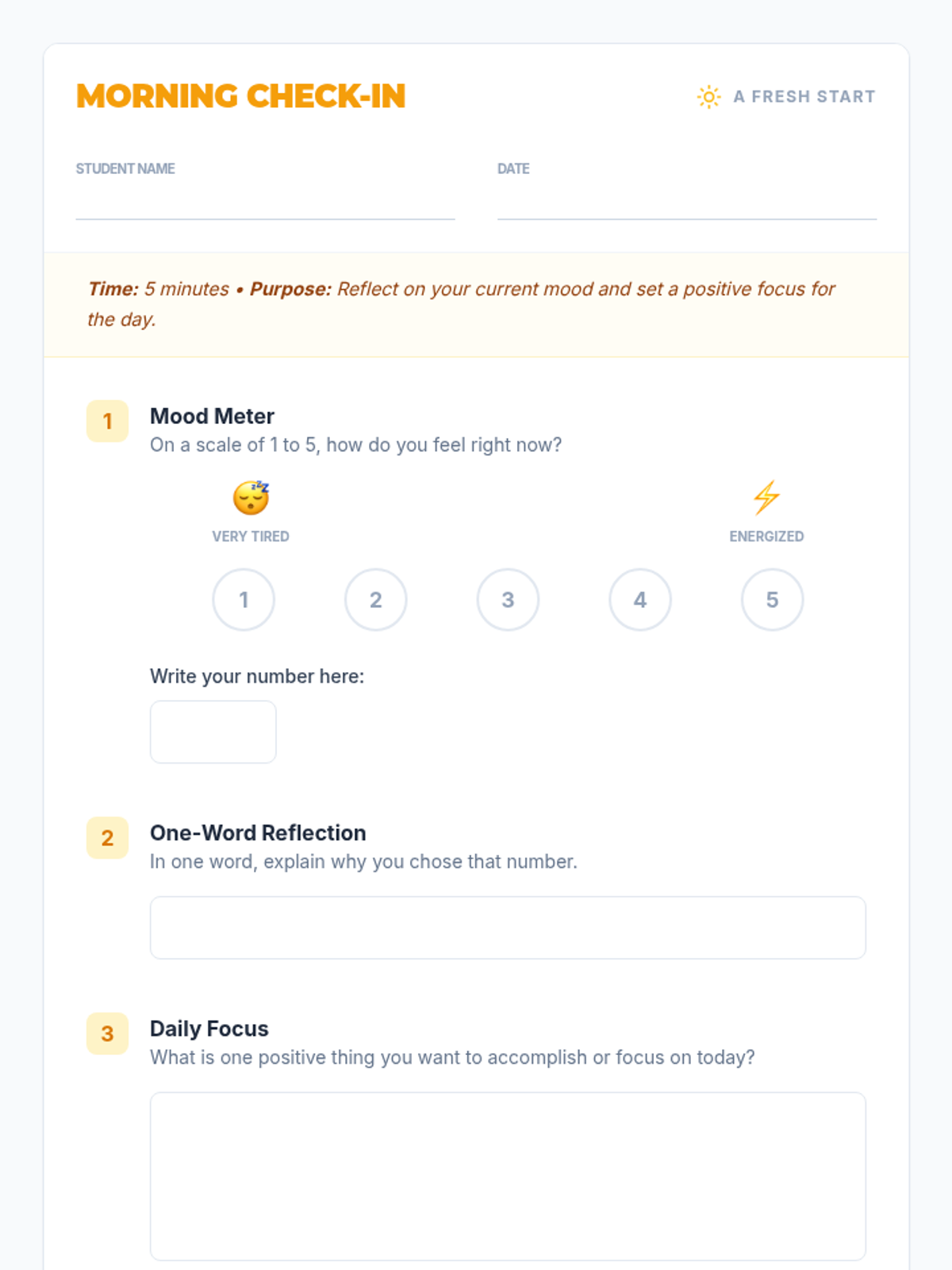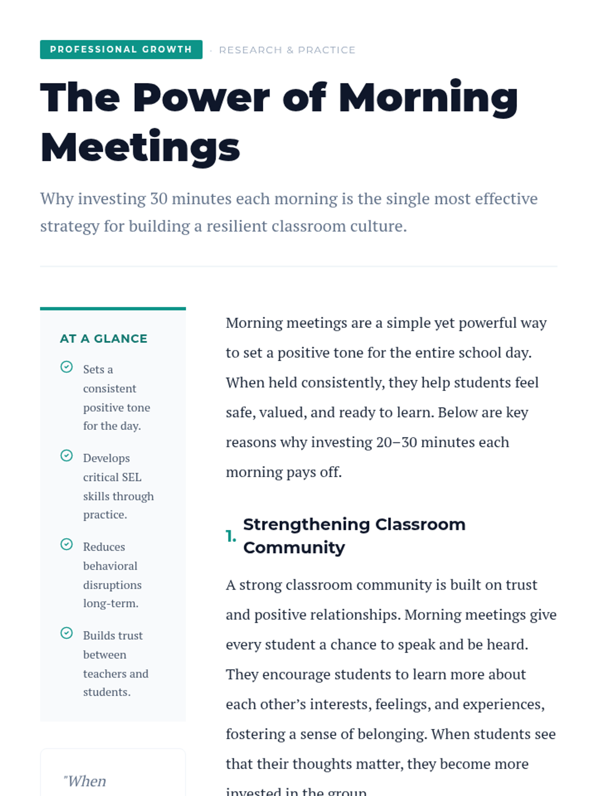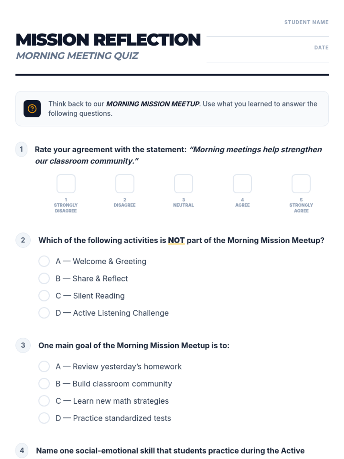 A 30-minute Tier 1 Morning Meeting designed for 7th-grade students to build community, practice active listening, and set daily intentions. This lesson fosters a positive classroom climate through structured sharing and reflection.