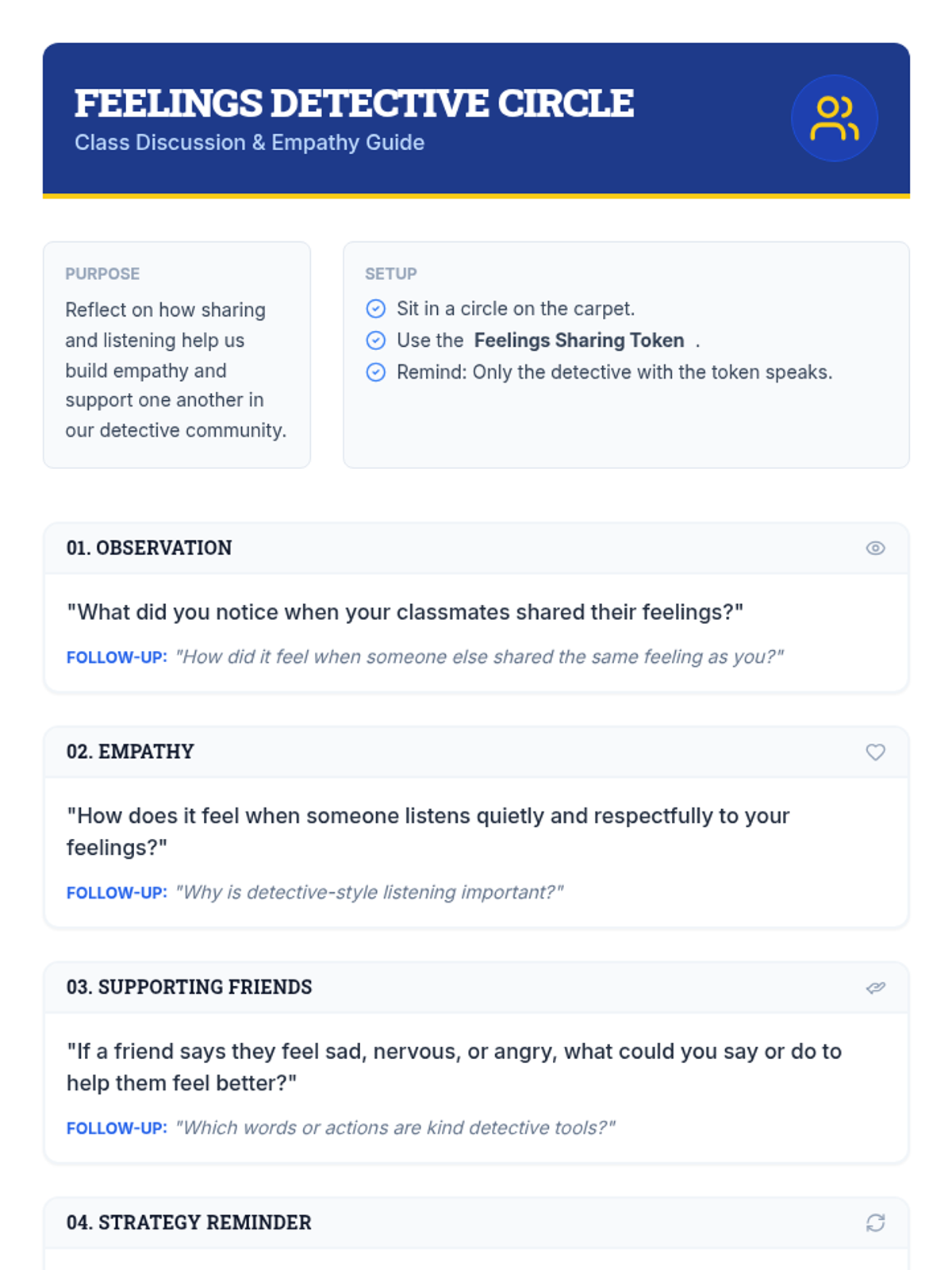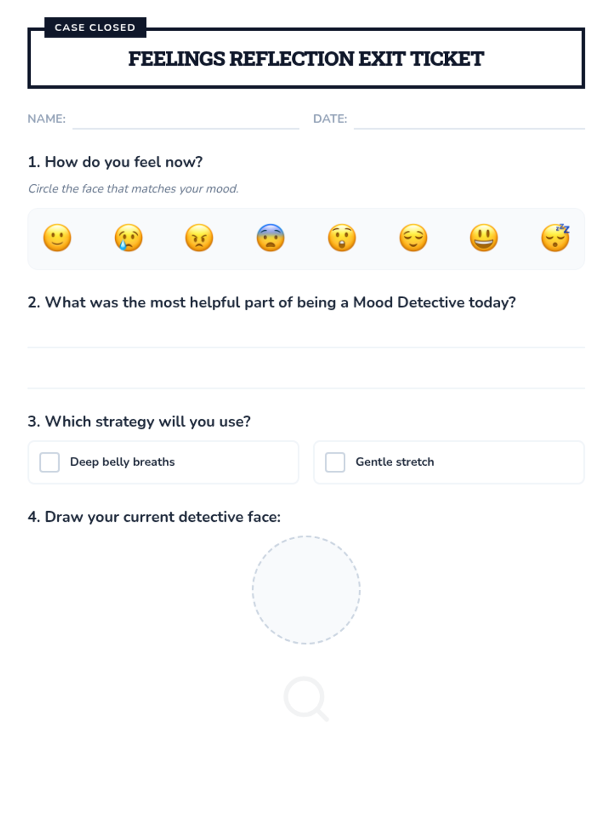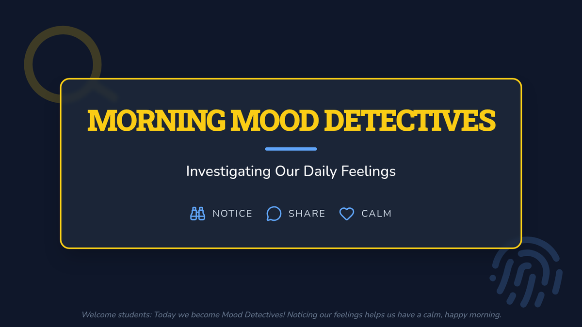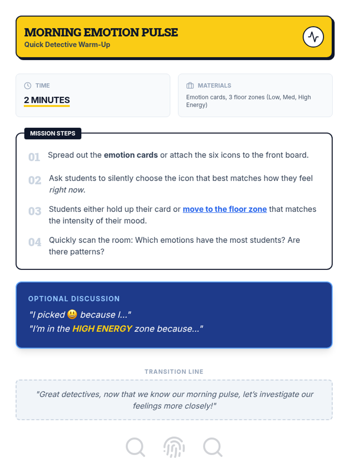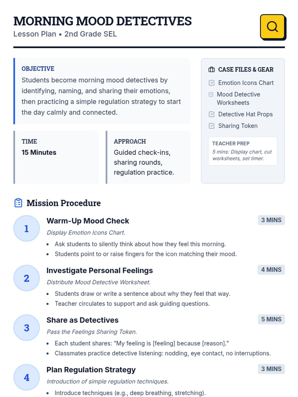 A 15-minute SEL morning meeting where 2nd graders practice identifying and sharing their emotions through a detective-themed investigation to build self-awareness and empathy.