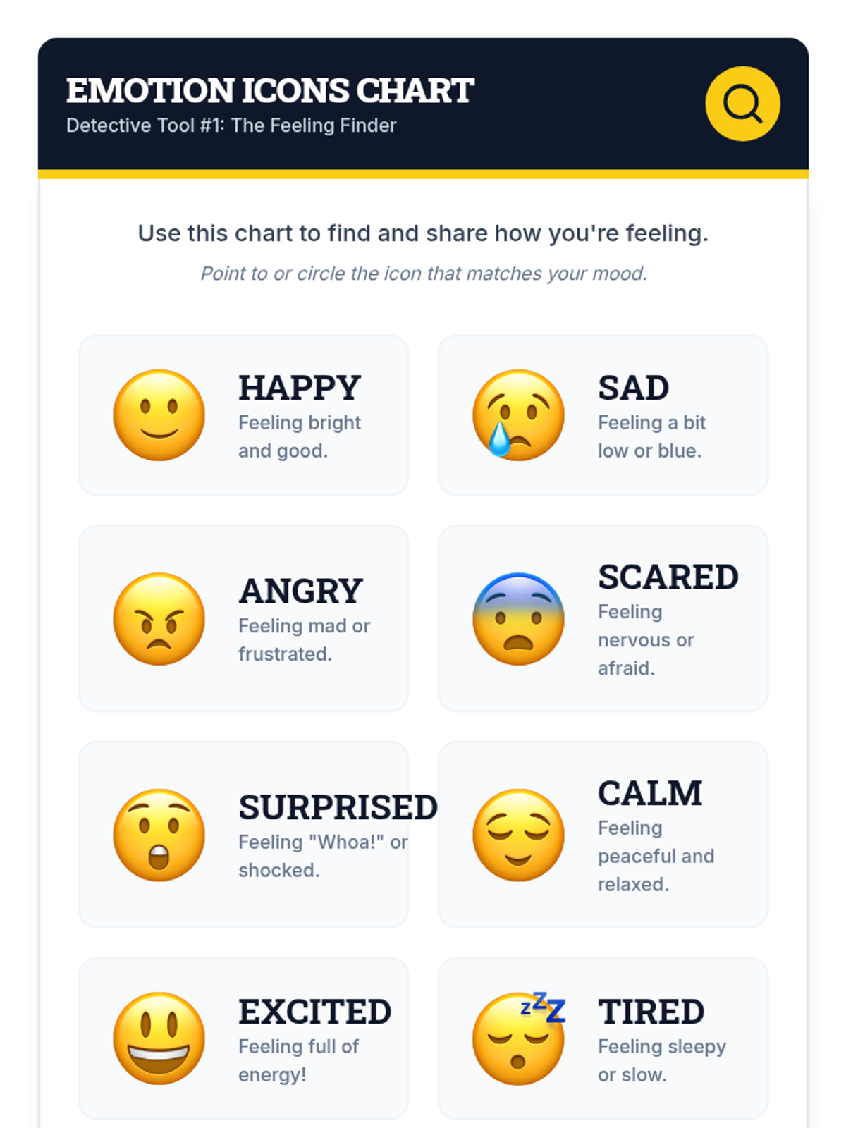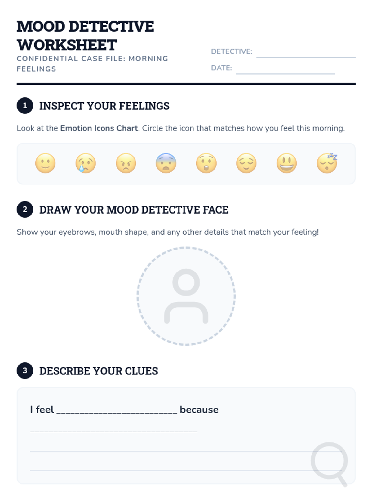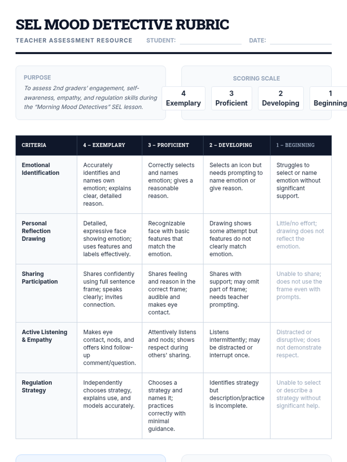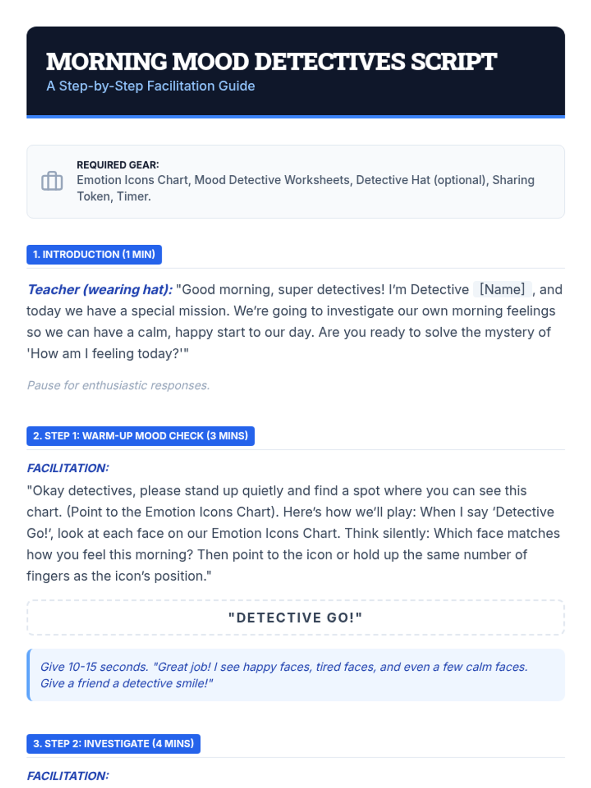 A 15-minute SEL morning meeting where 2nd graders practice identifying and sharing their emotions through a detective-themed investigation to build self-awareness and empathy.
