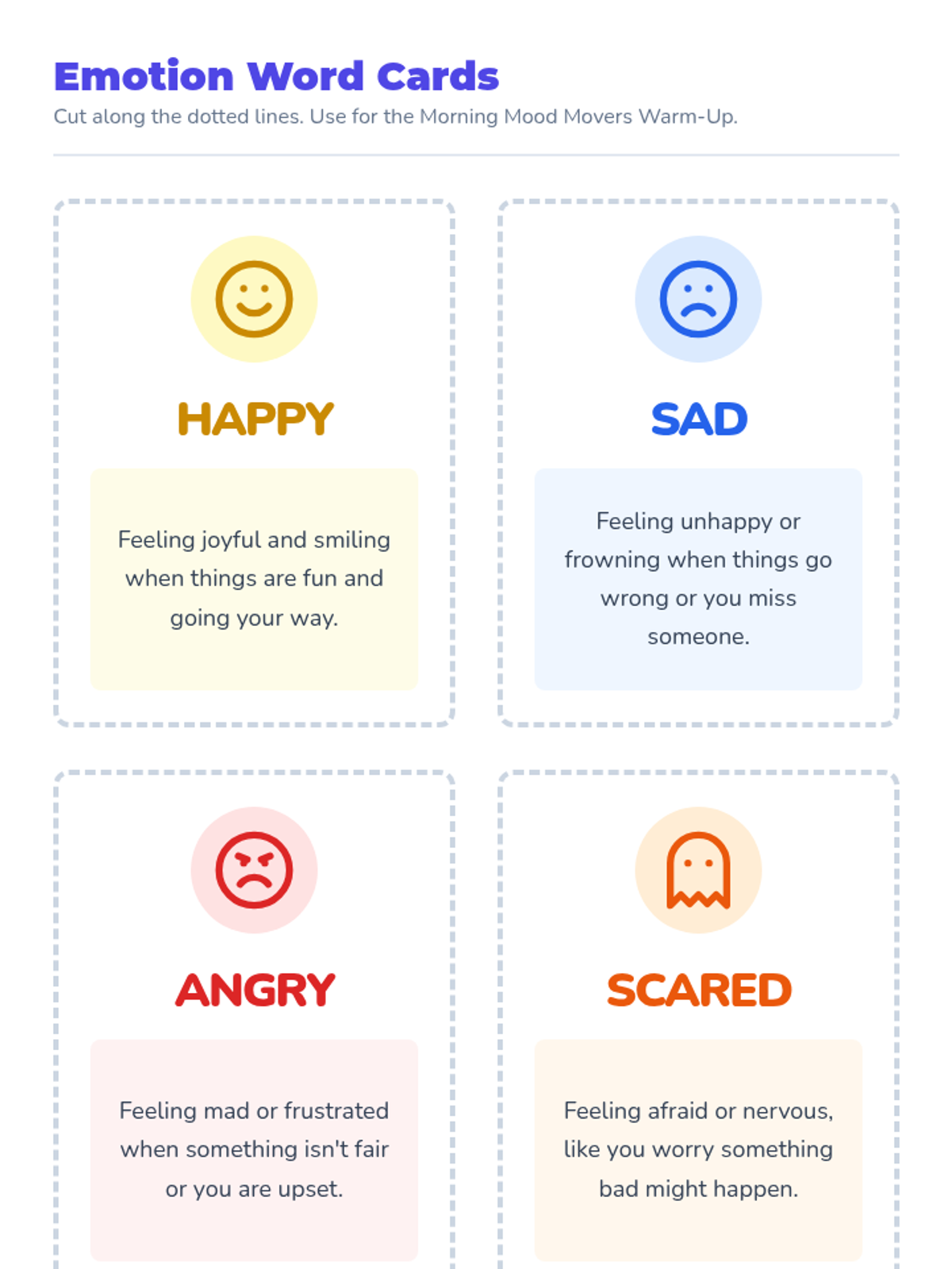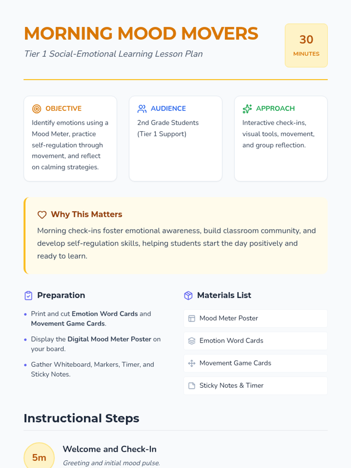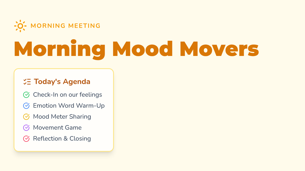 A 30-minute SEL morning meeting for 2nd graders focused on emotional awareness, self-regulation, and community connection through interactive check-ins and movement games.