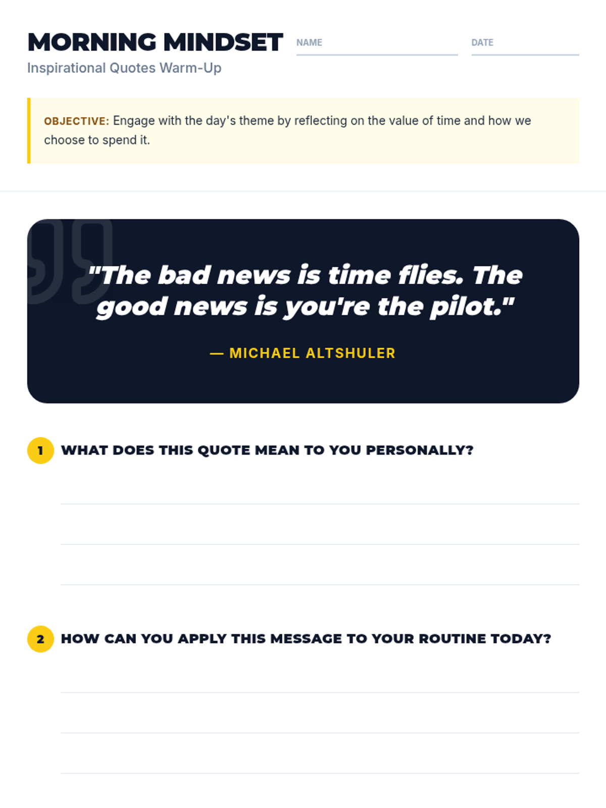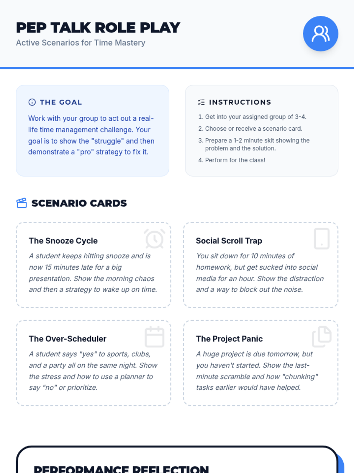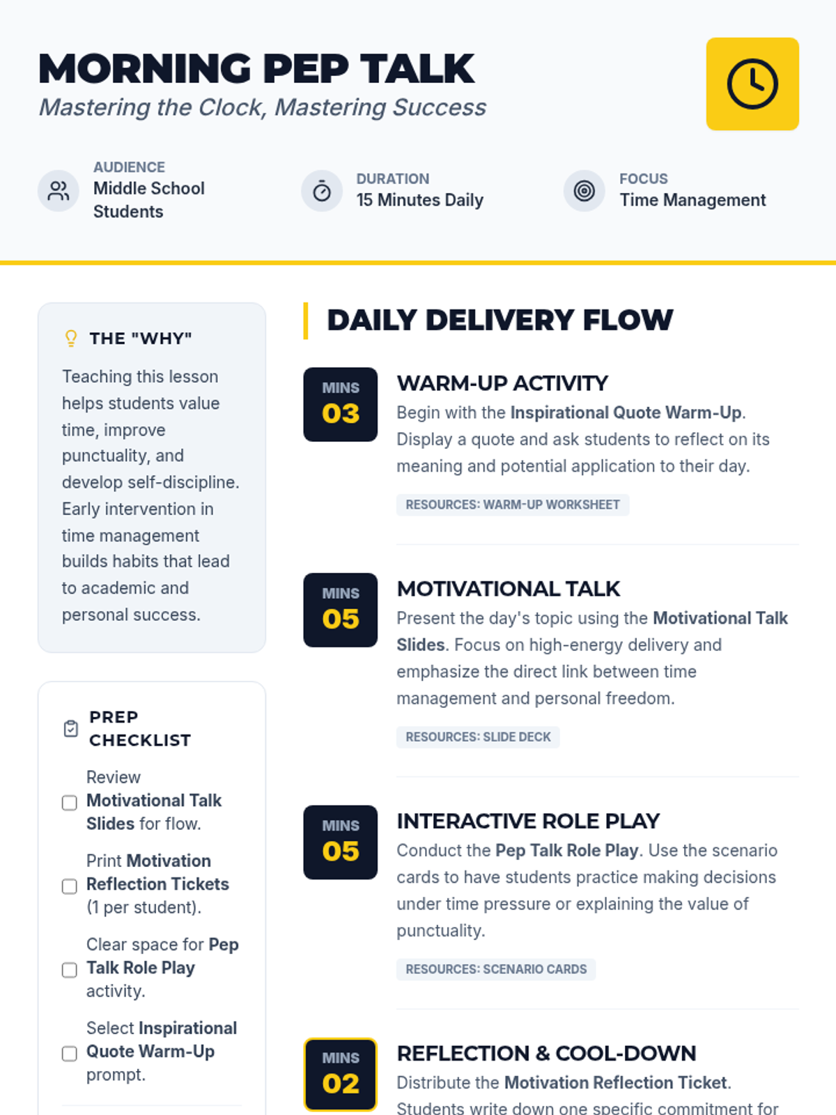 A series of short, high-energy morning sessions designed to help middle school students master their time, improve punctuality, and build self-discipline through motivational talks and interactive role play.