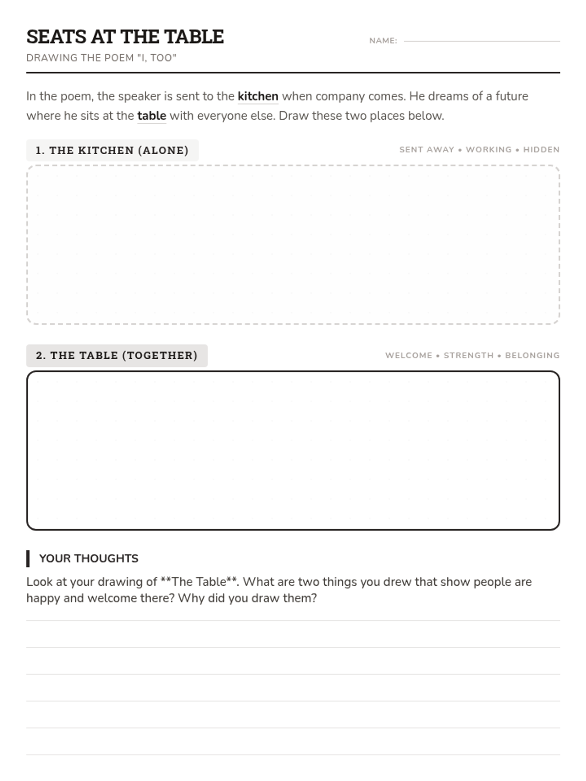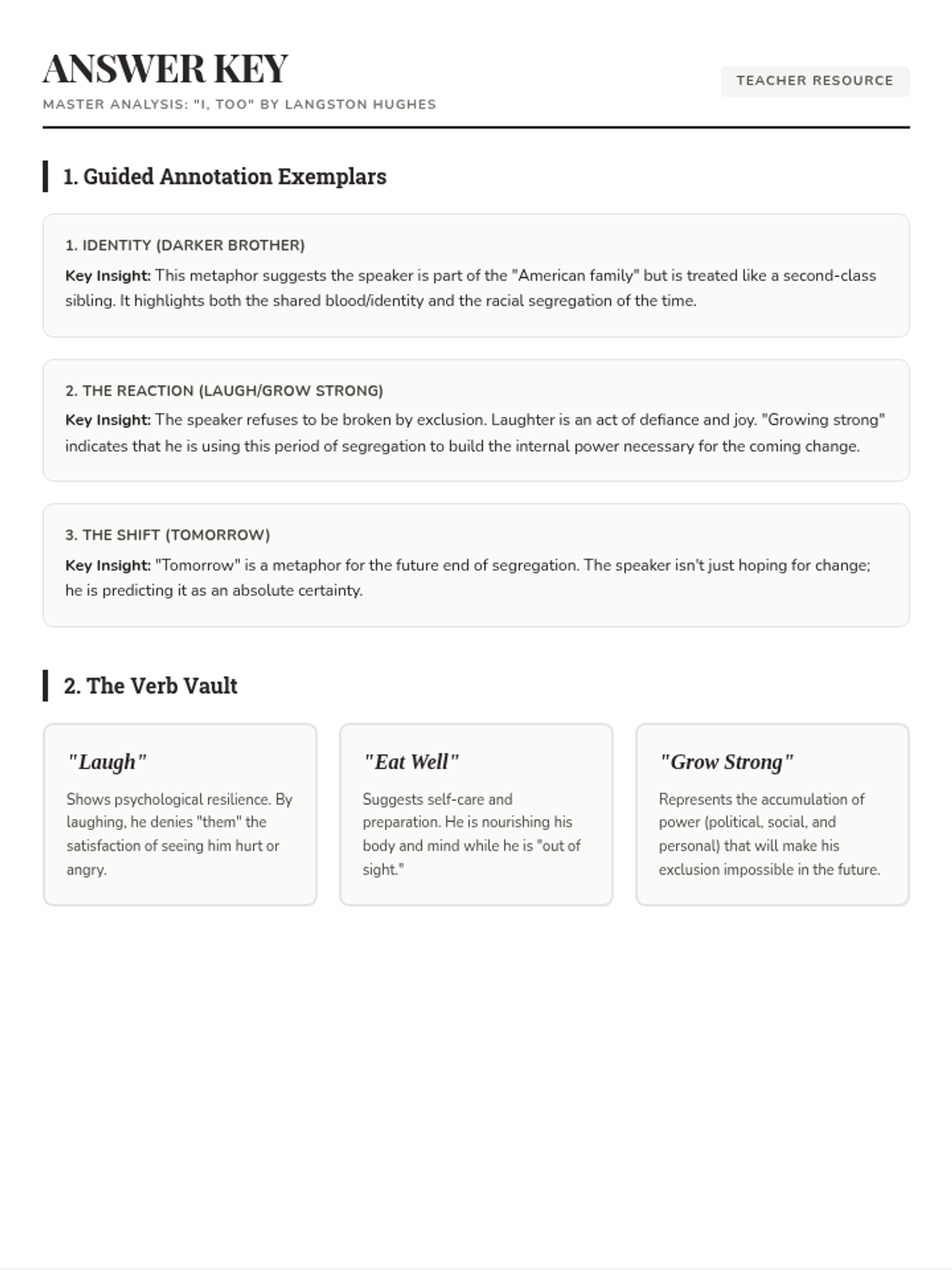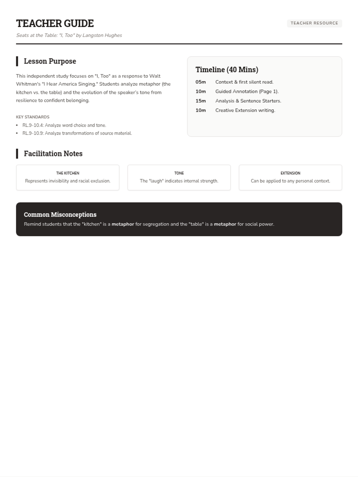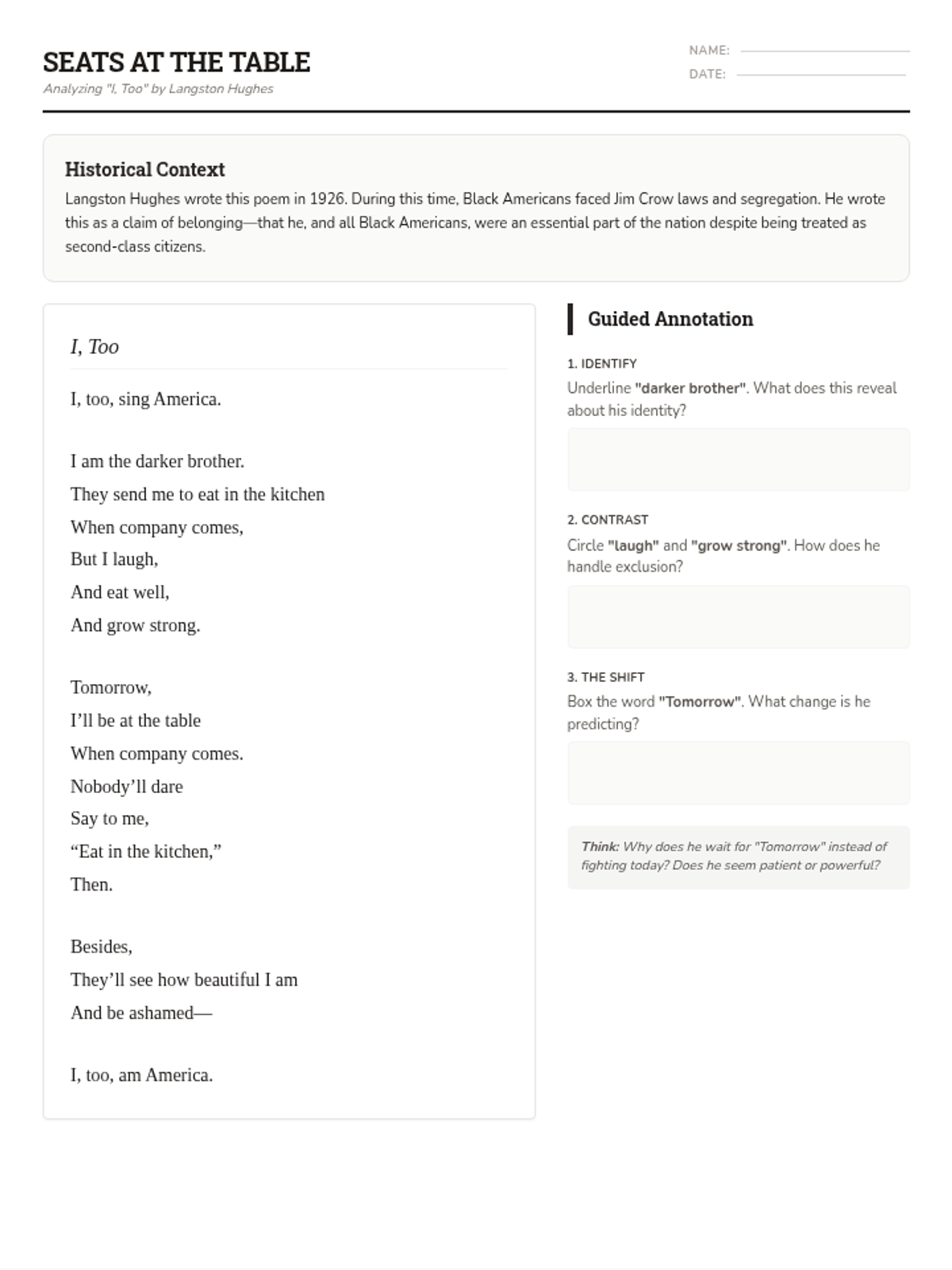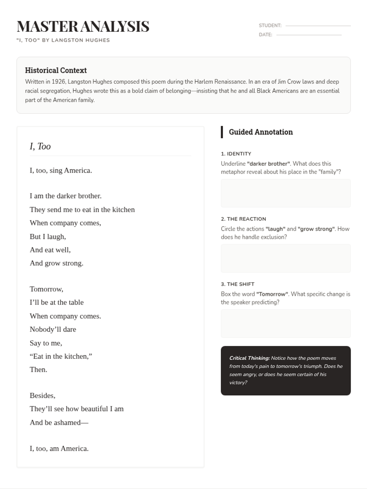 An independent study lesson on Langston Hughes's poem 'I, Too', focusing on imagery, metaphor, and the theme of resilience. Designed for a 40-minute class period with guided supports for 9th-grade students.