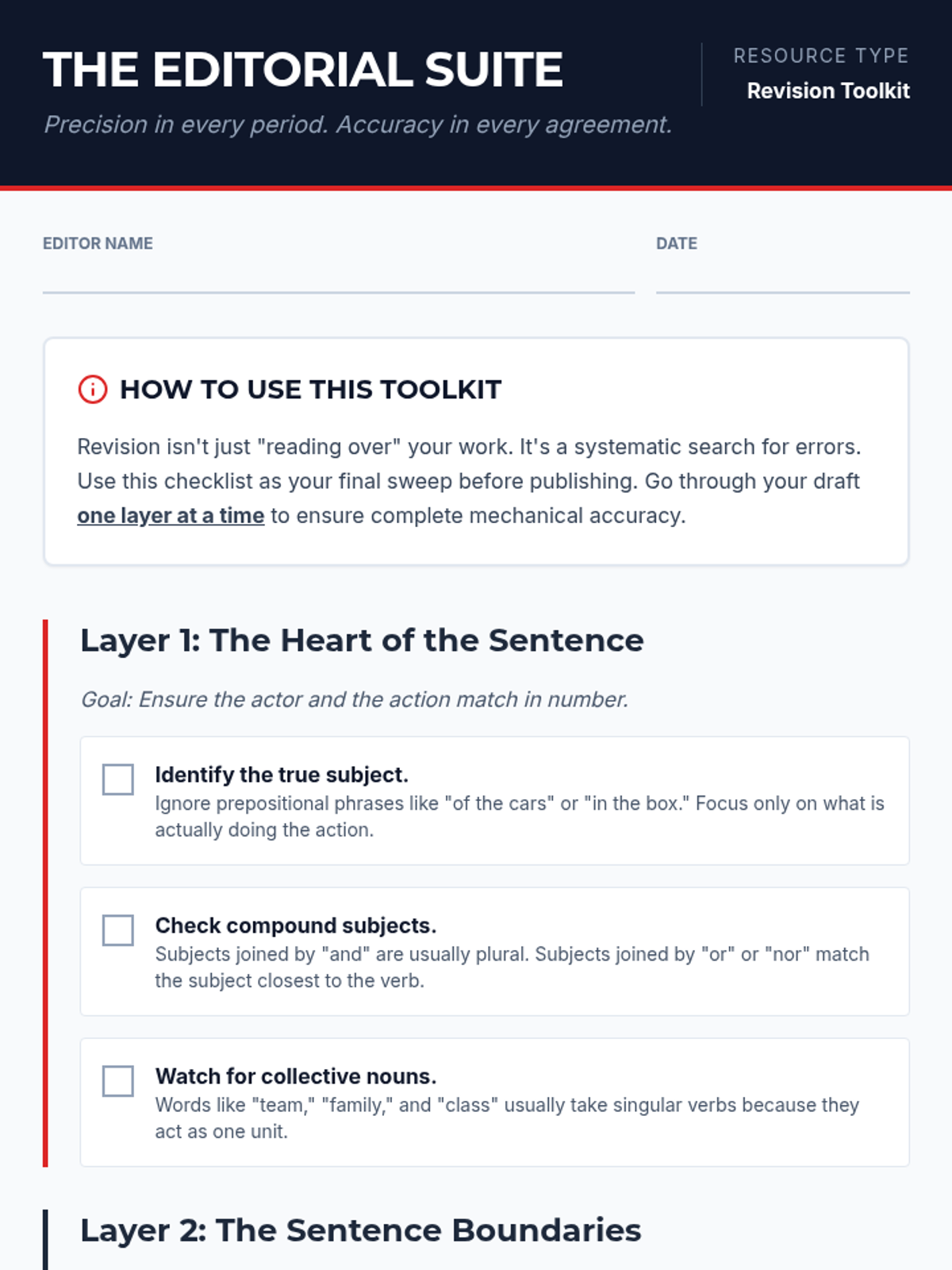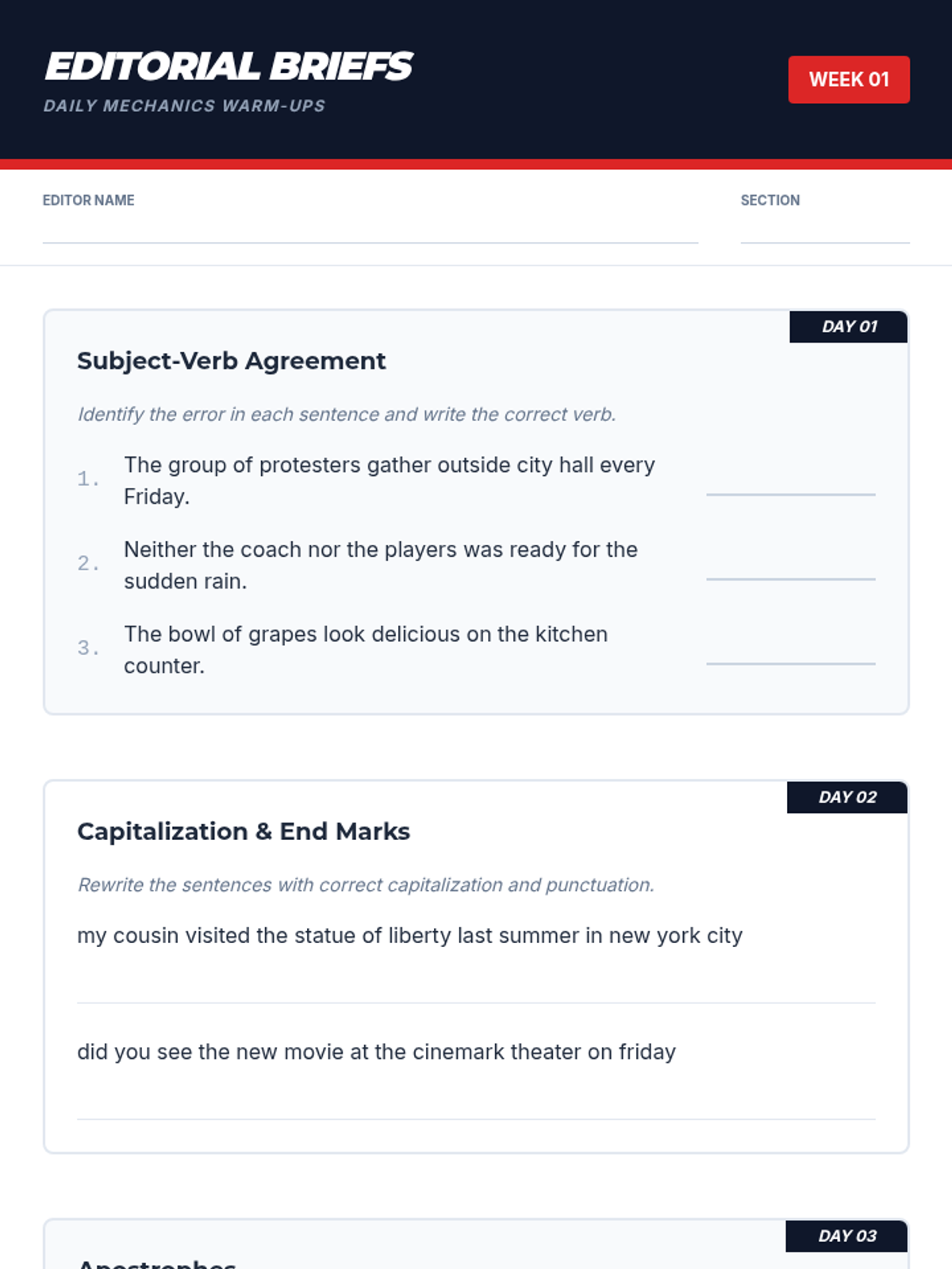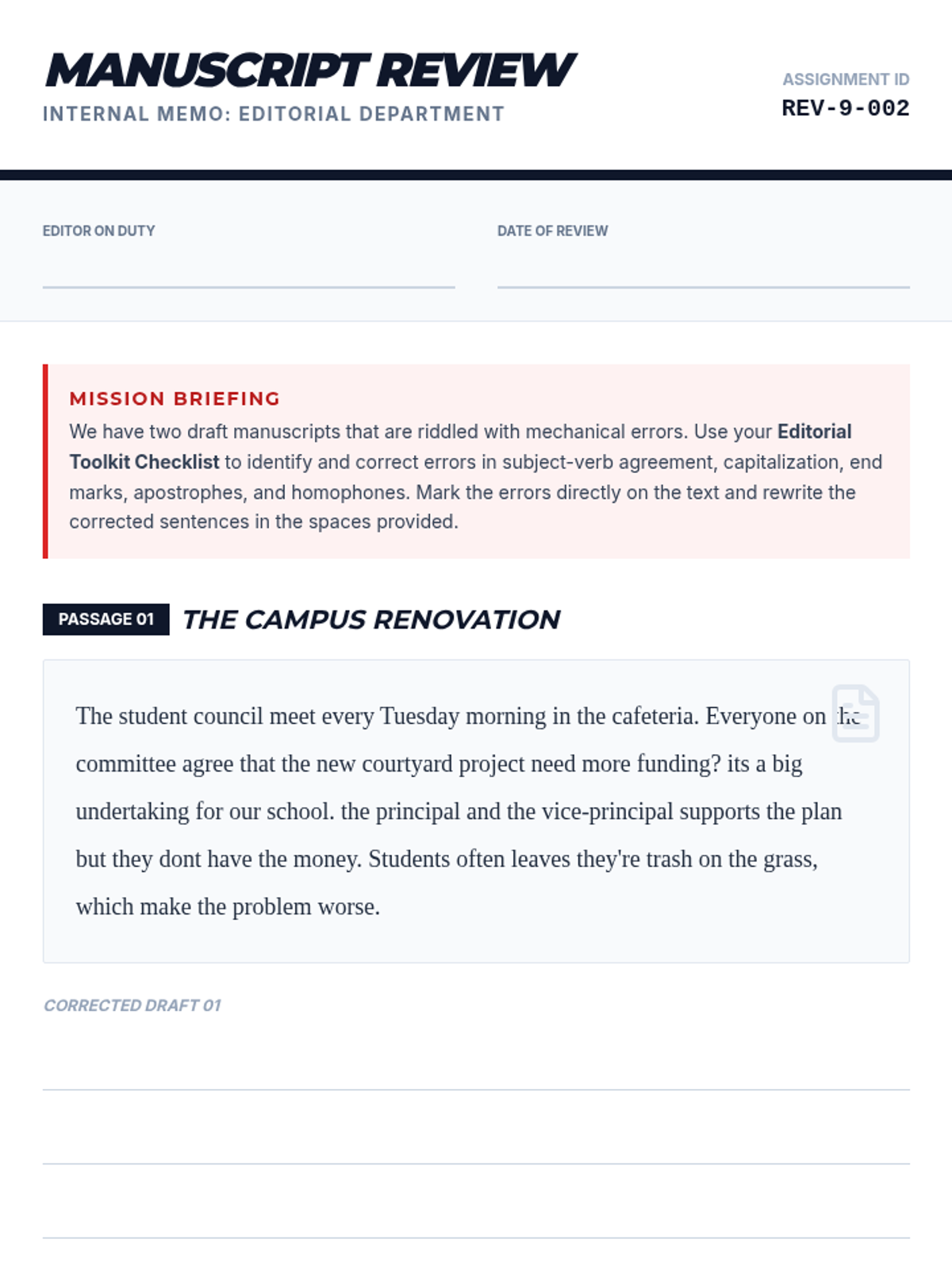 A comprehensive grammar and mechanics lesson designed for high school freshmen to master subject-verb agreement, punctuation, and word choice through professional editing simulations.