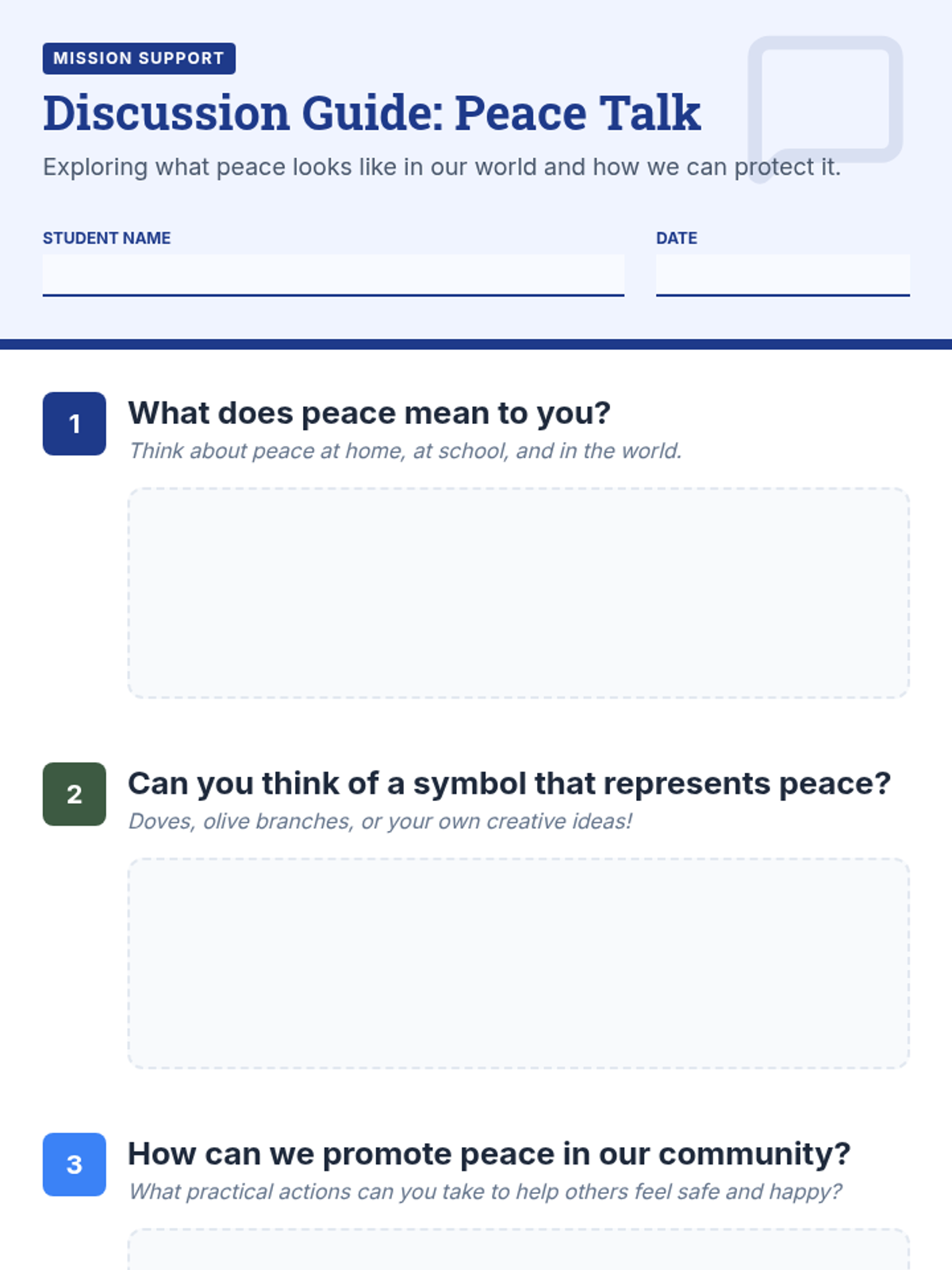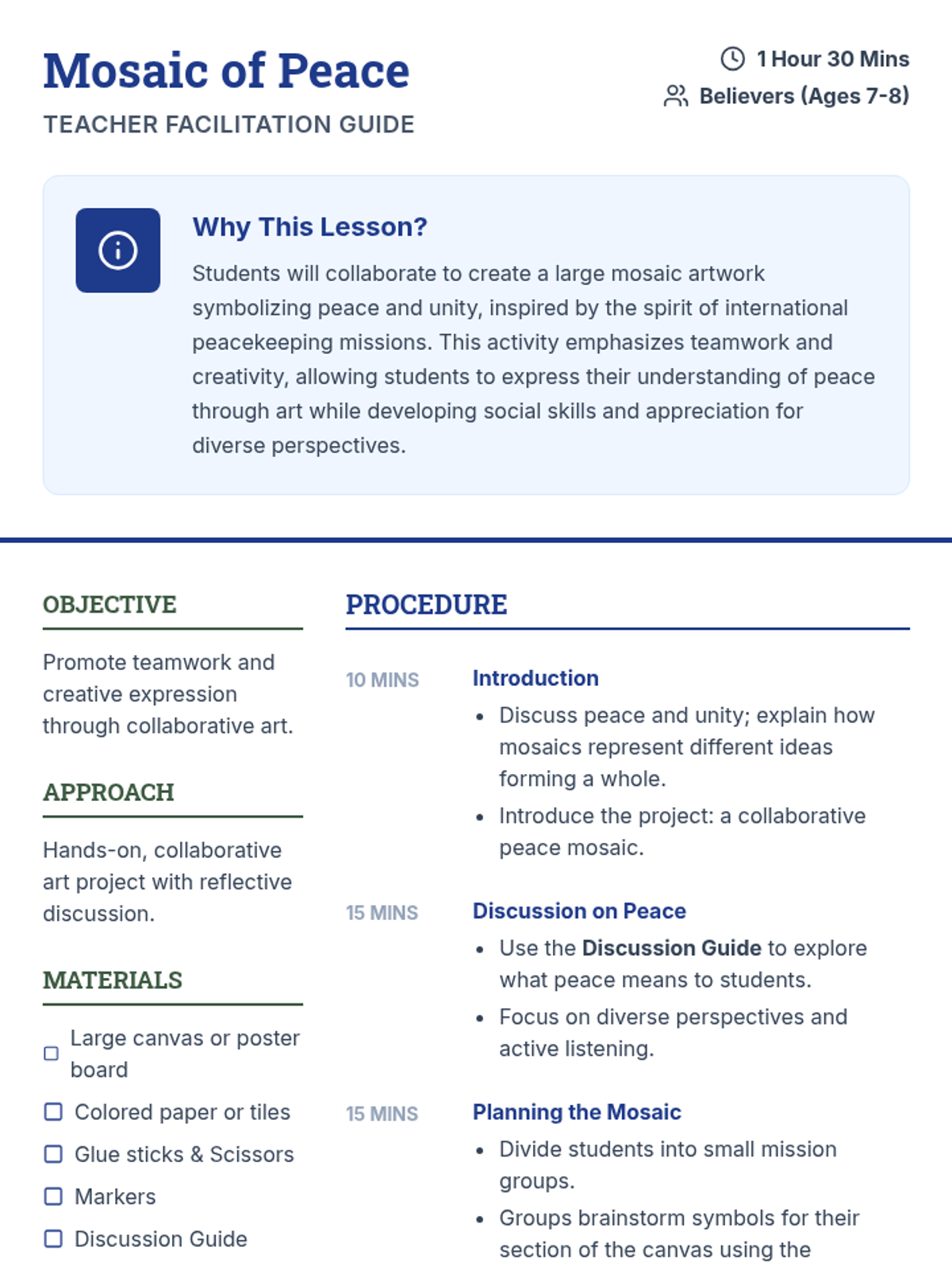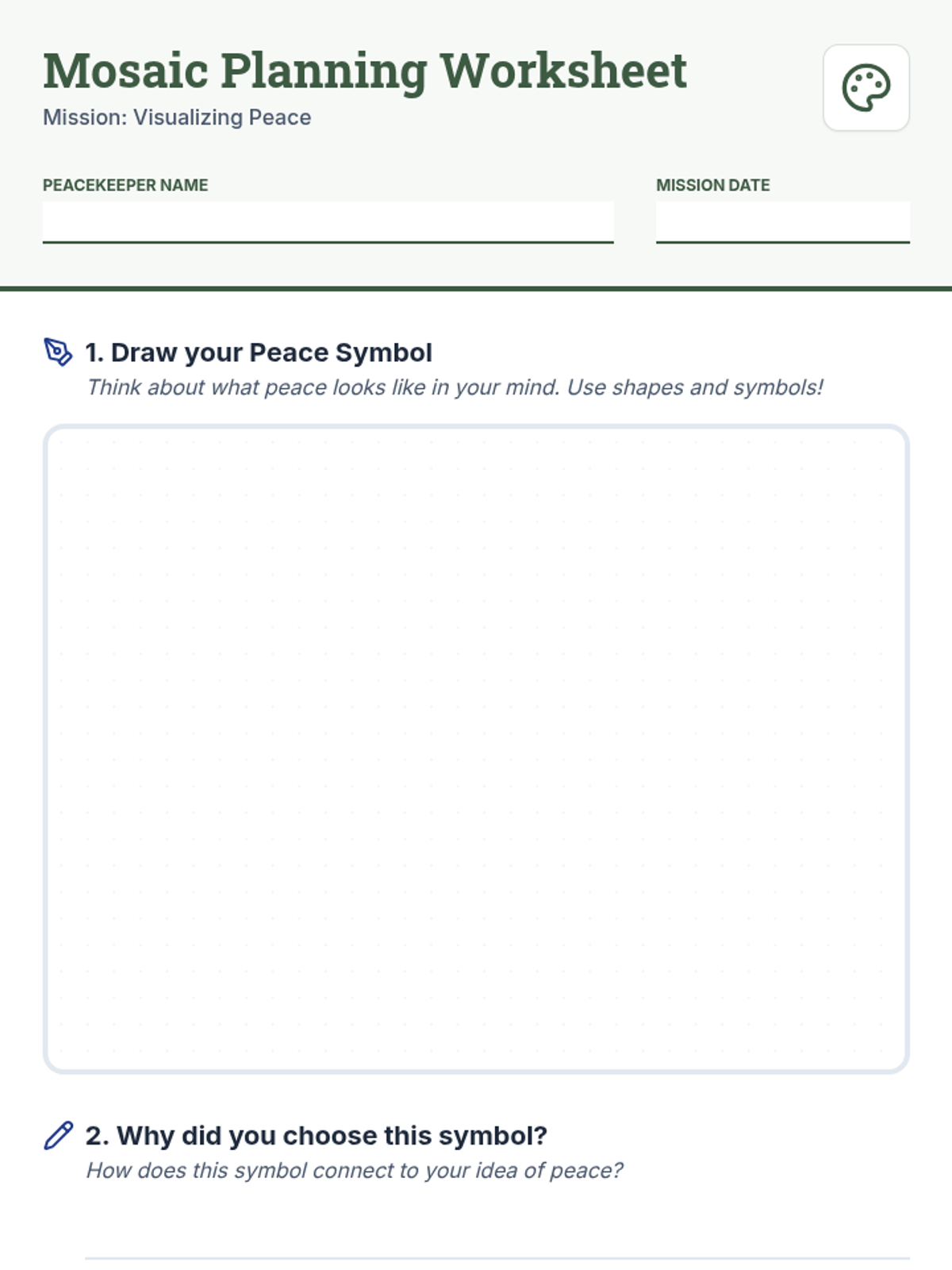 A collaborative art lesson where students create a mosaic symbolizing peace and unity, inspired by the spirit of international peacekeeping missions.