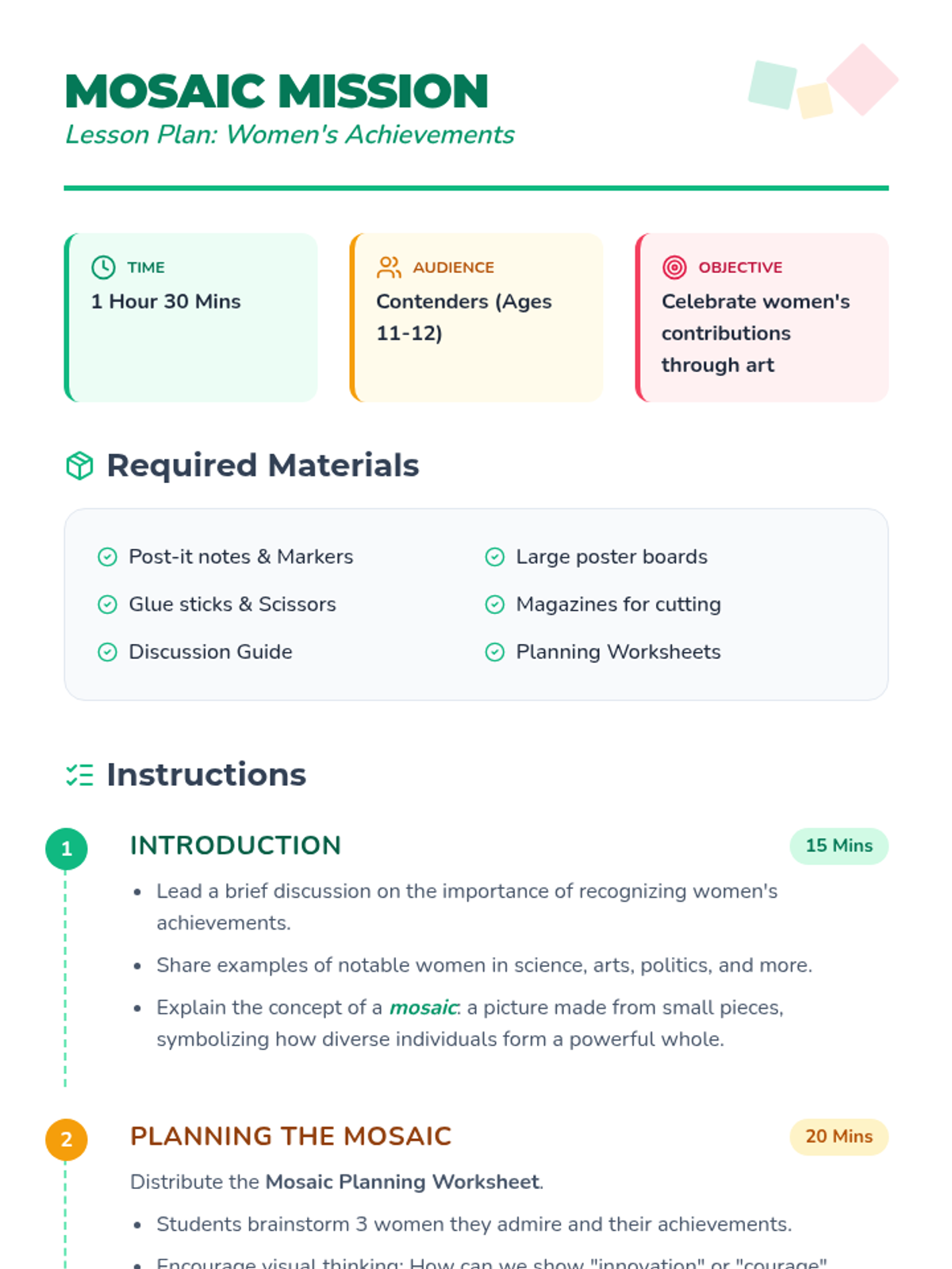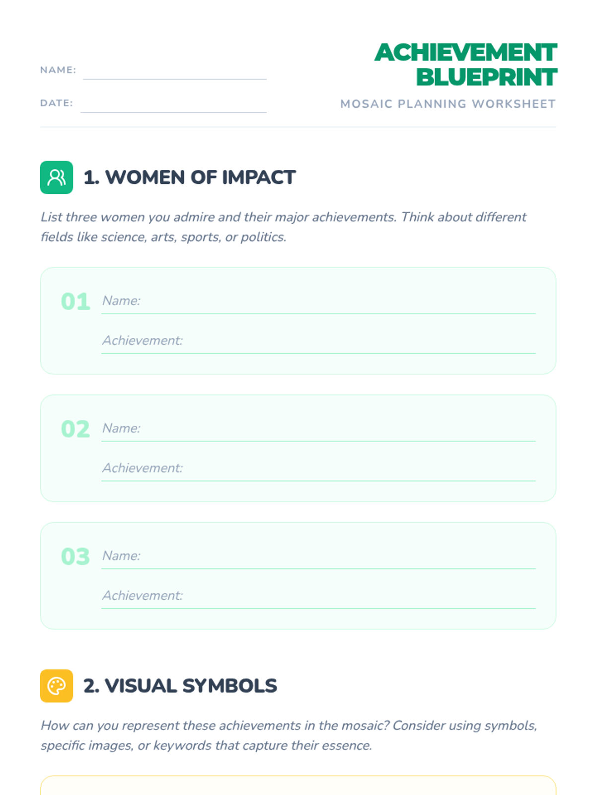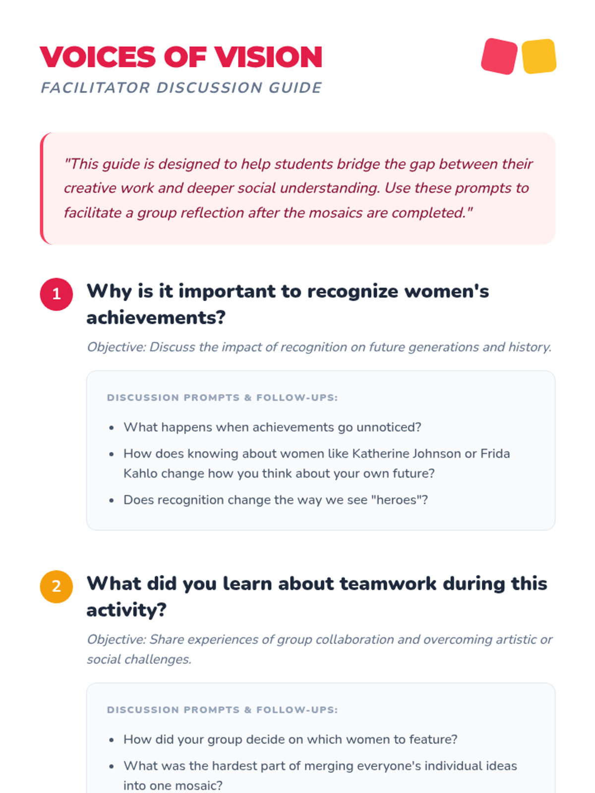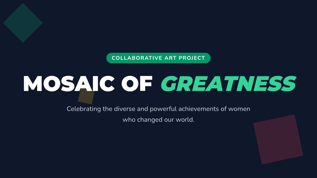 A collaborative art project where students learn about and celebrate the contributions of influential women throughout history by creating a collective mosaic. Students engage in brainstorming, creative visual representation, and group reflection on diversity and teamwork.