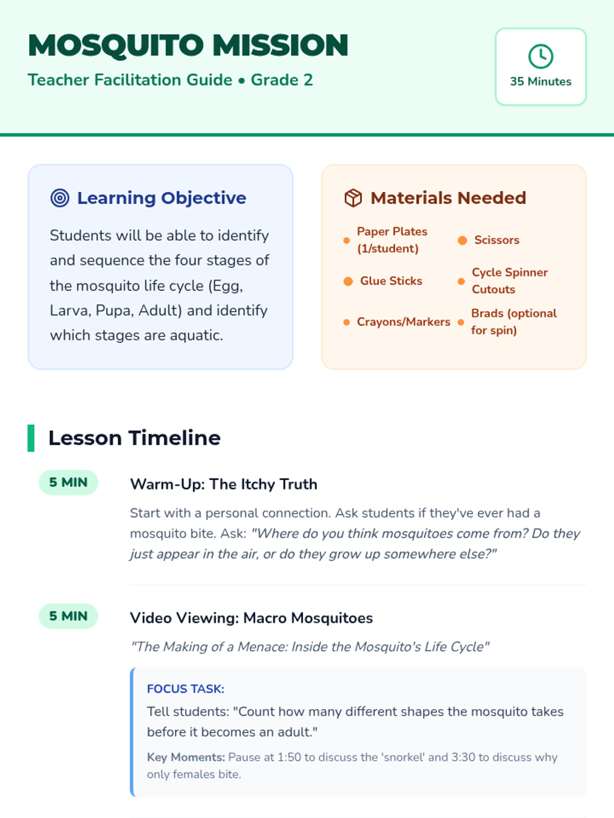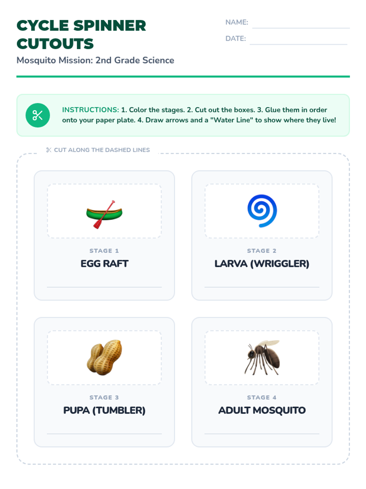A 2nd-grade science lesson where students explore the four stages of the mosquito life cycle through a video observation and a hands-on 'Life Cycle Wheel' craft.