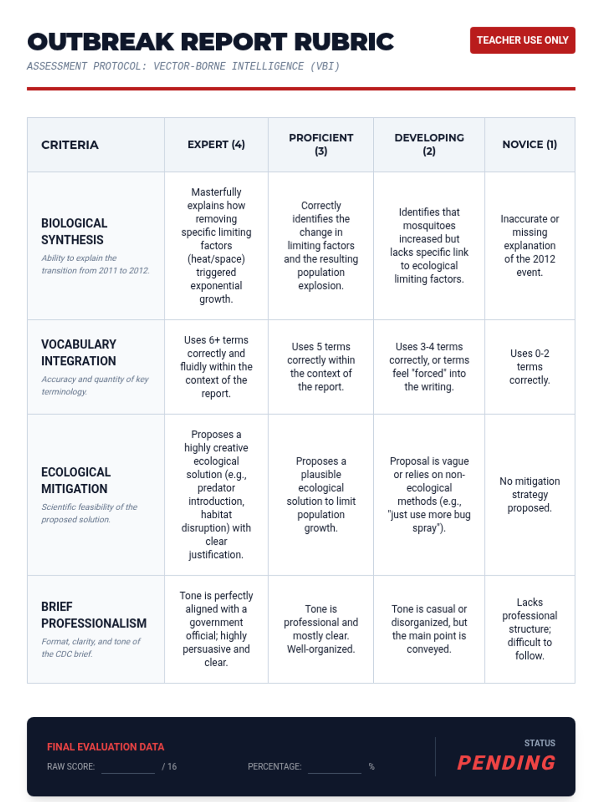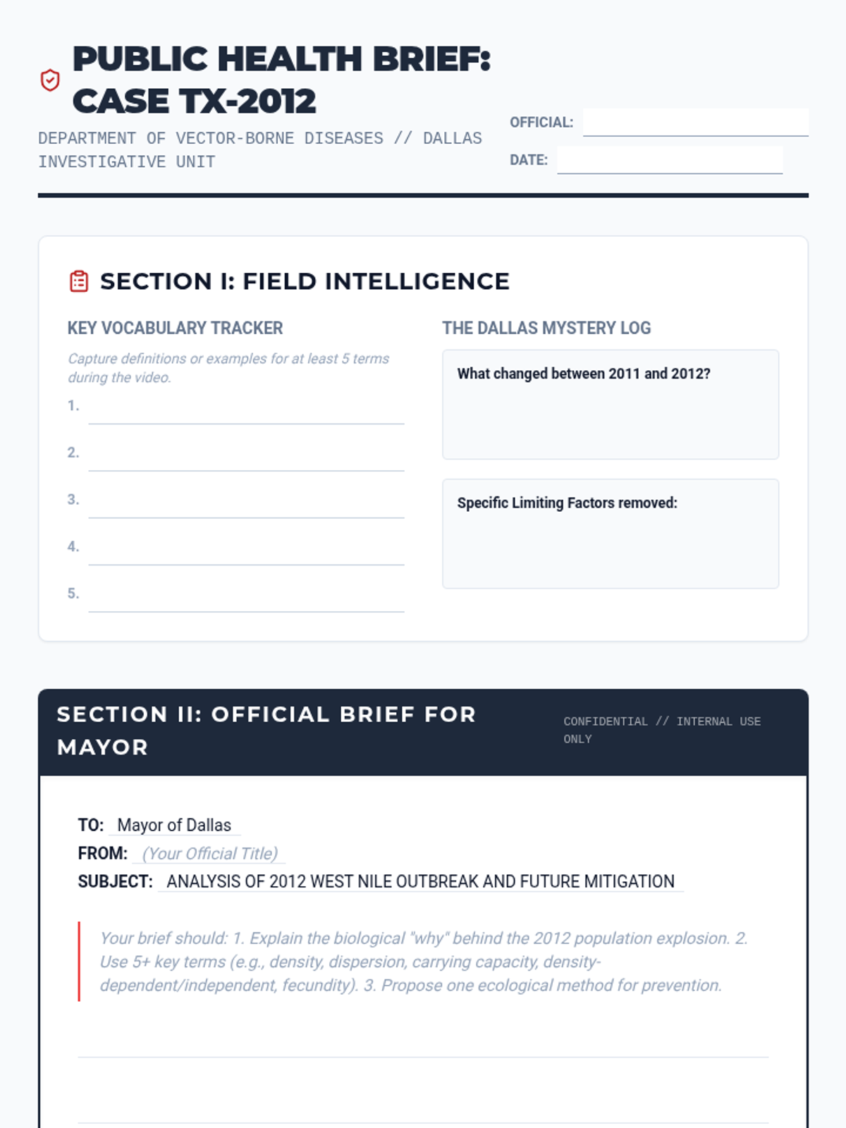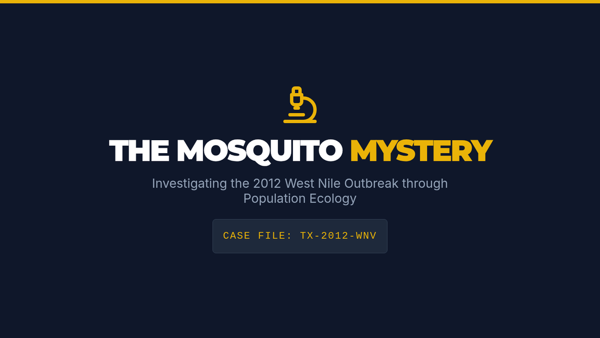 A high school biology lesson investigating the 2012 West Nile Virus outbreak in Dallas through the lens of population ecology. Students analyze limiting factors, growth models, and density-dependent variables to write a public health brief.