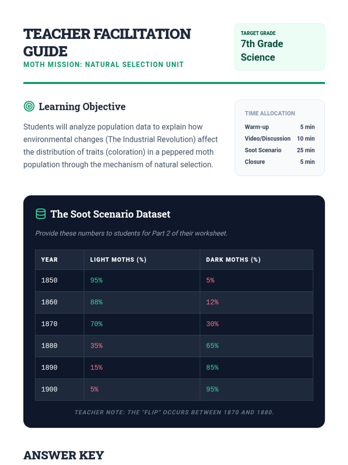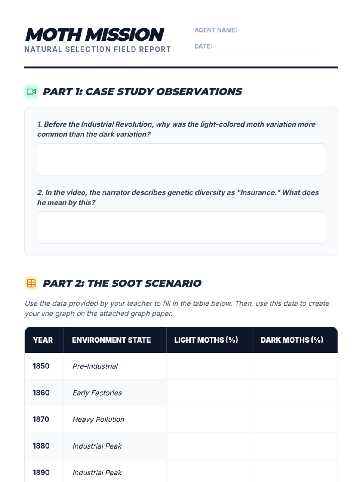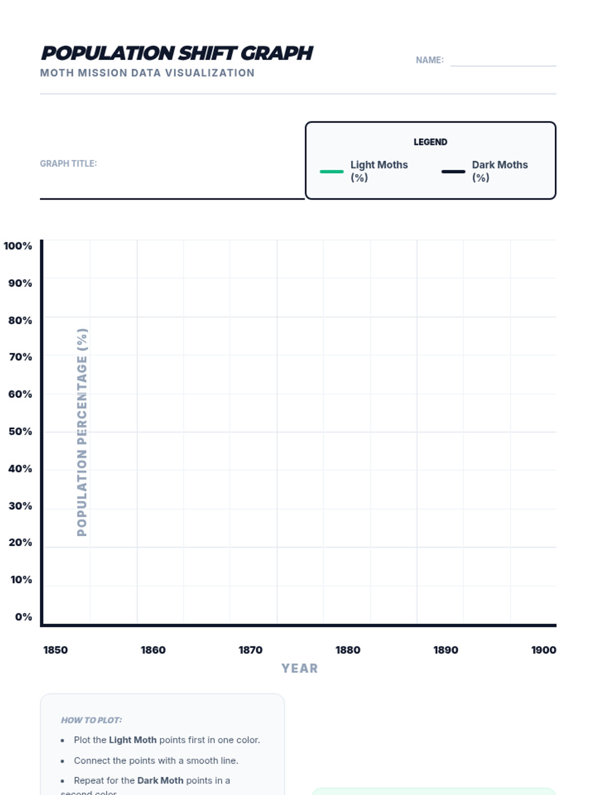 Students explore how environmental changes drive natural selection using the classic peppered moth case study. They will analyze population data, create a line graph showing the shift in traits, and write a scientific explanation using key biological terms.