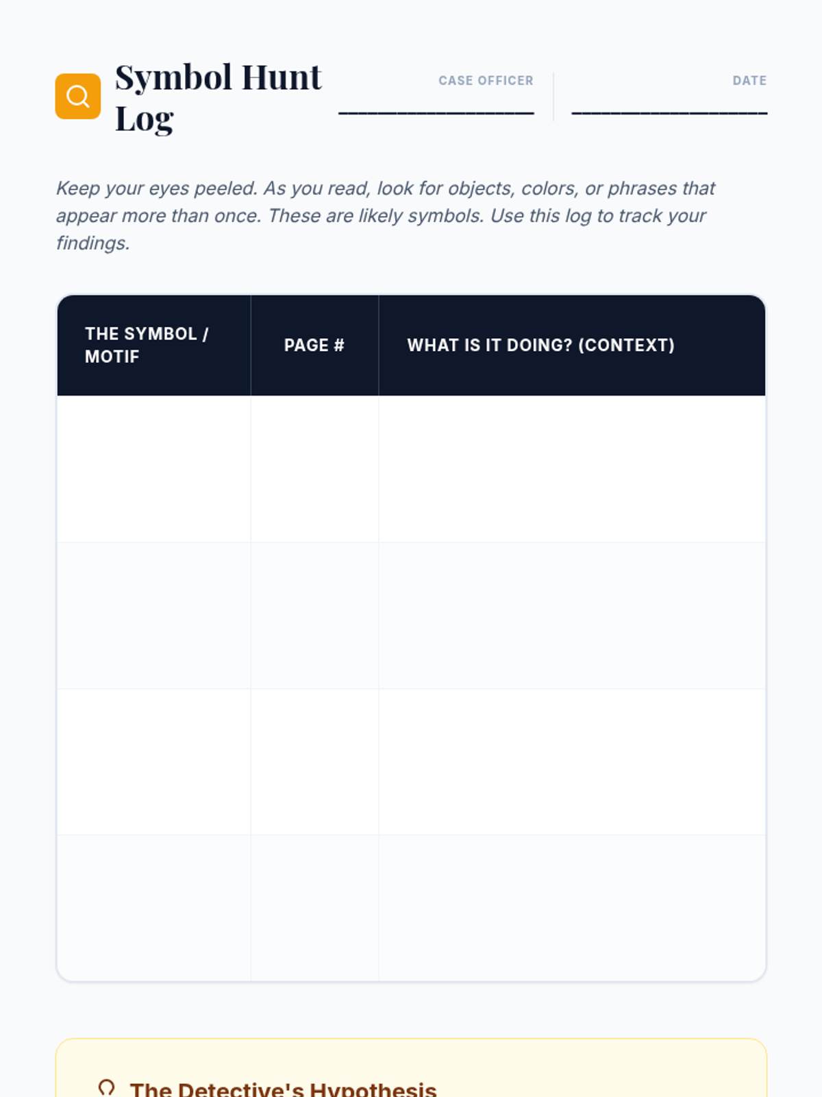 Students track recurring symbols and motifs within their novel to hypothesize deeper meanings.