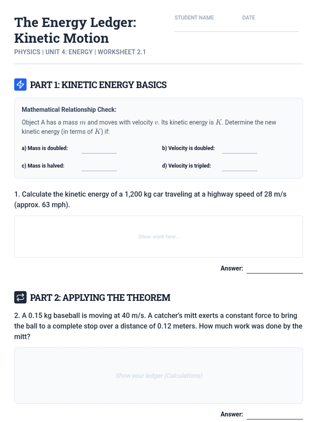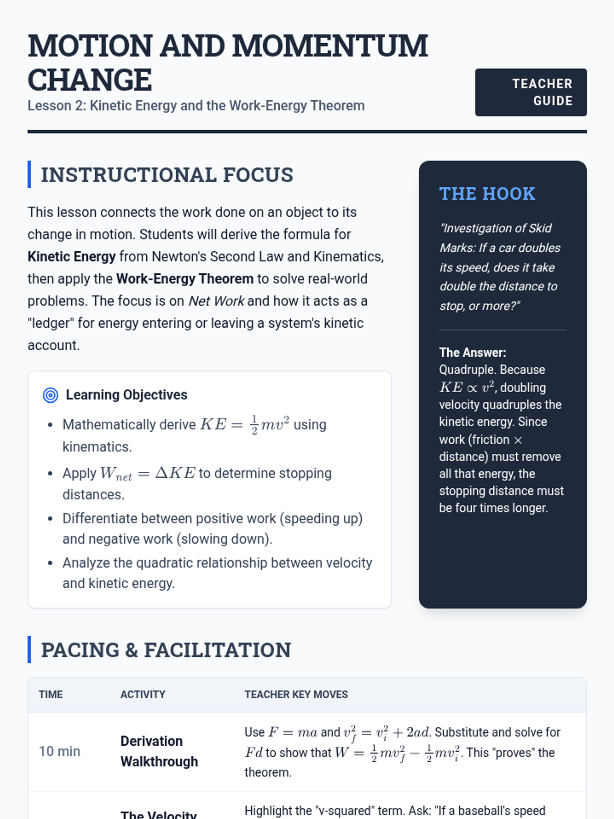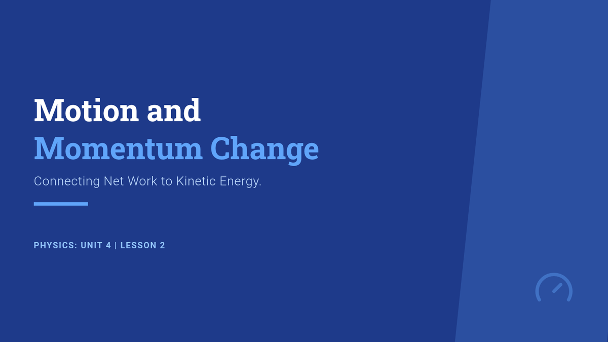 Introduces the relationship between net work and the change in kinetic energy, focusing on derivations and practical applications like braking distances.