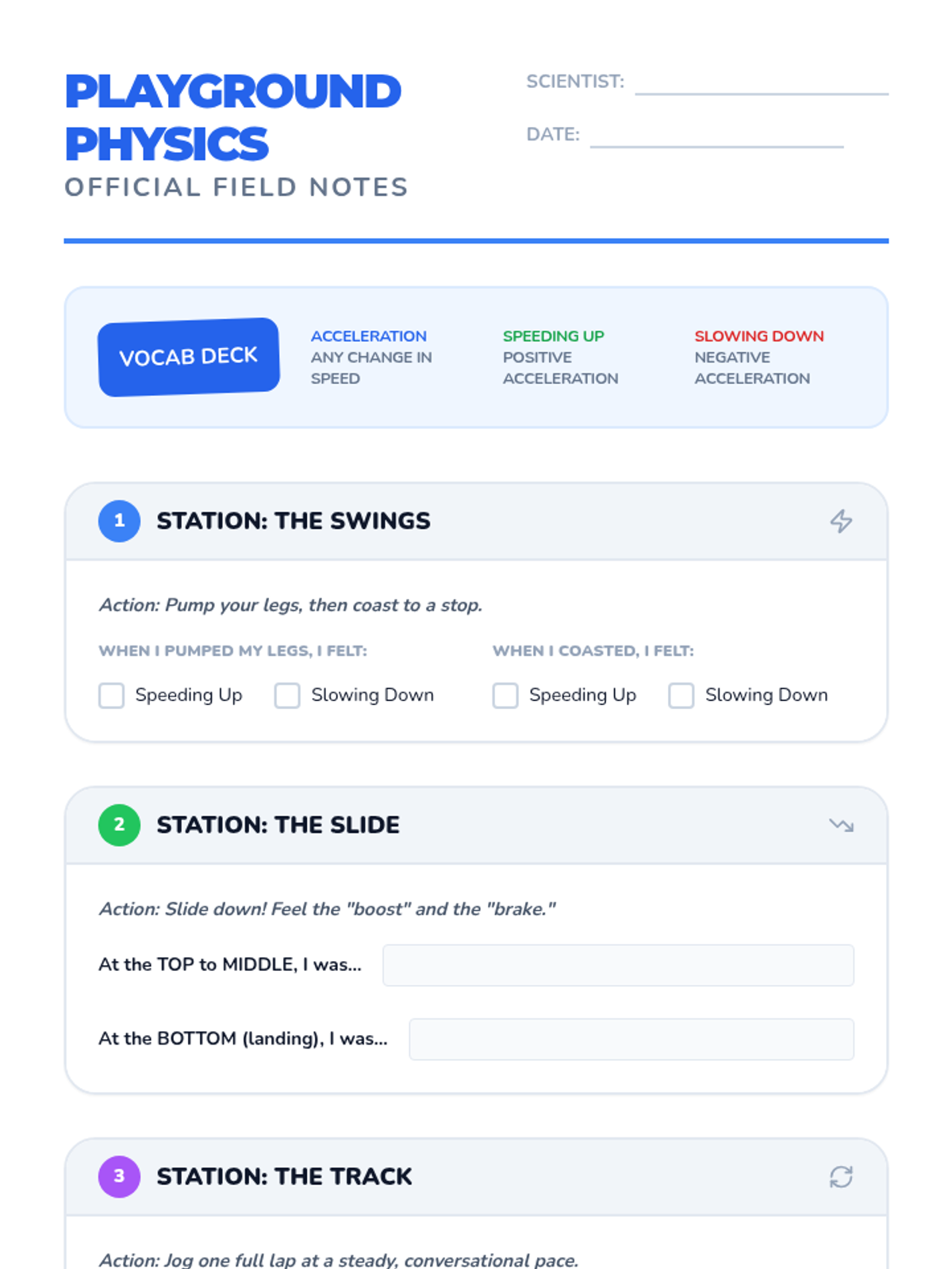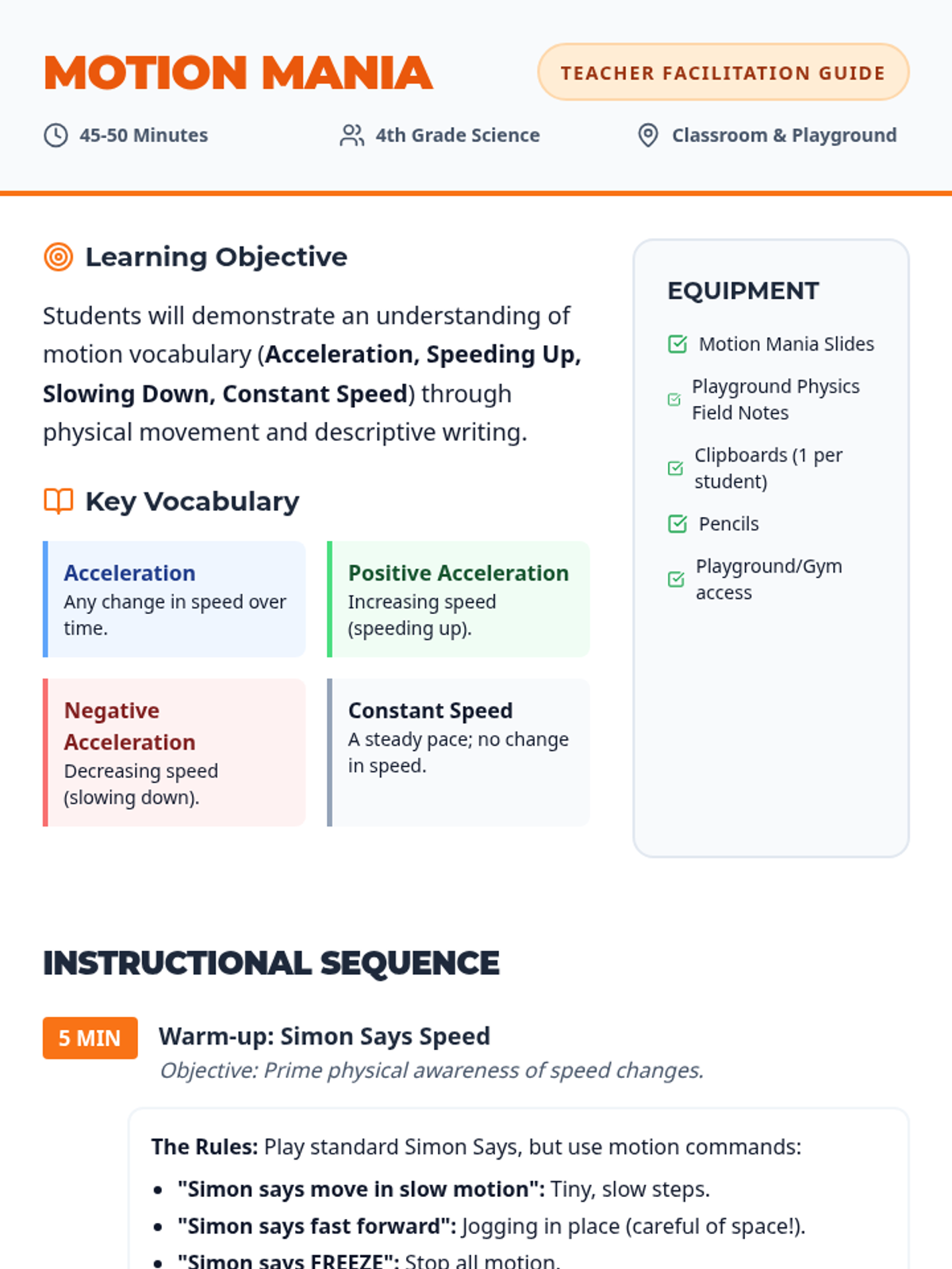 A high-energy 4th-grade physics lesson where students explore acceleration, speeding up, and slowing down through Simon Says and hands-on playground experiments.