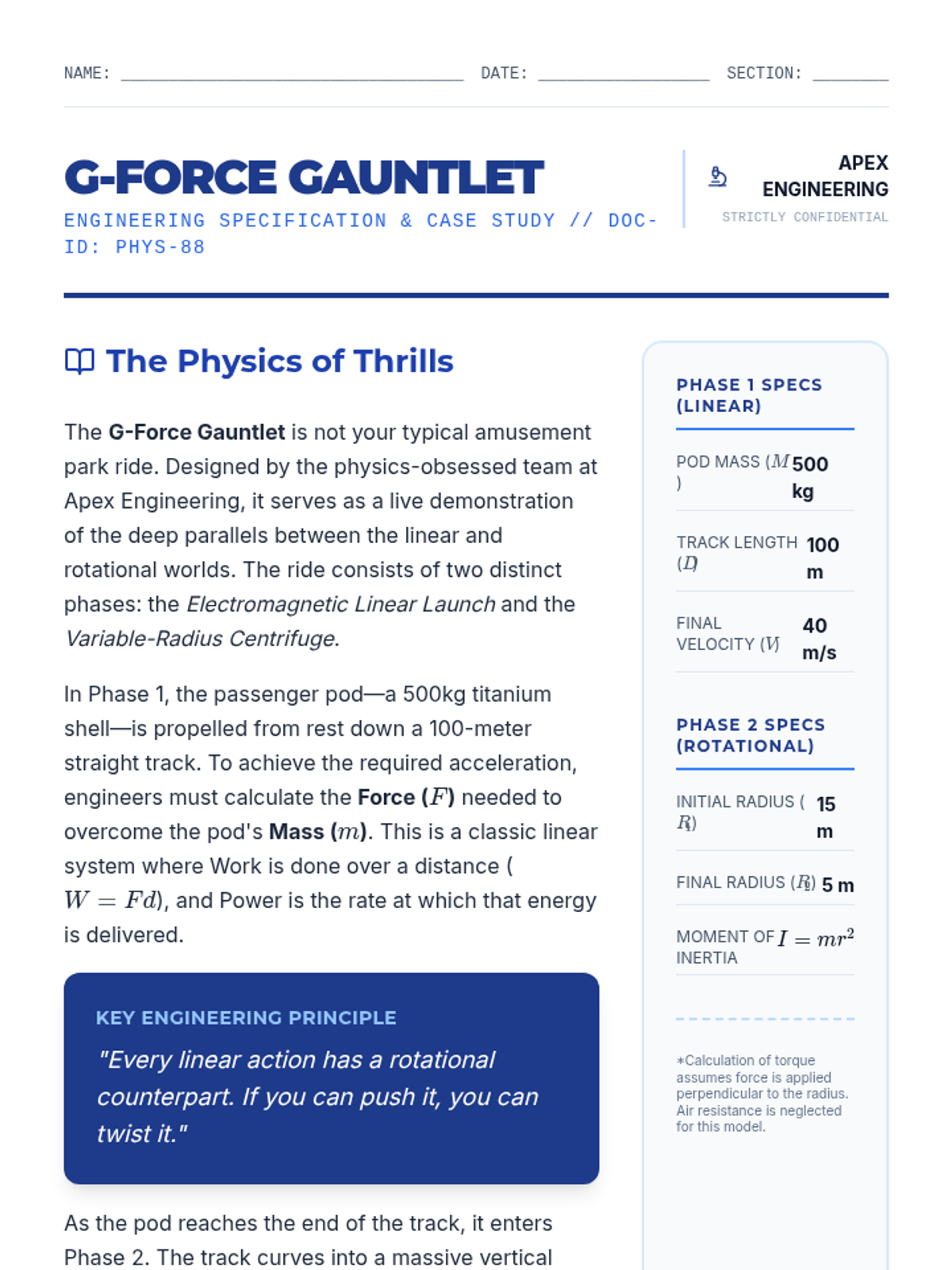 This lesson compares linear and rotational motion through a case study of a high-tech amusement park ride. Students explore the analogies between force and torque, mass and inertia, and work/power/conservation laws in both systems.