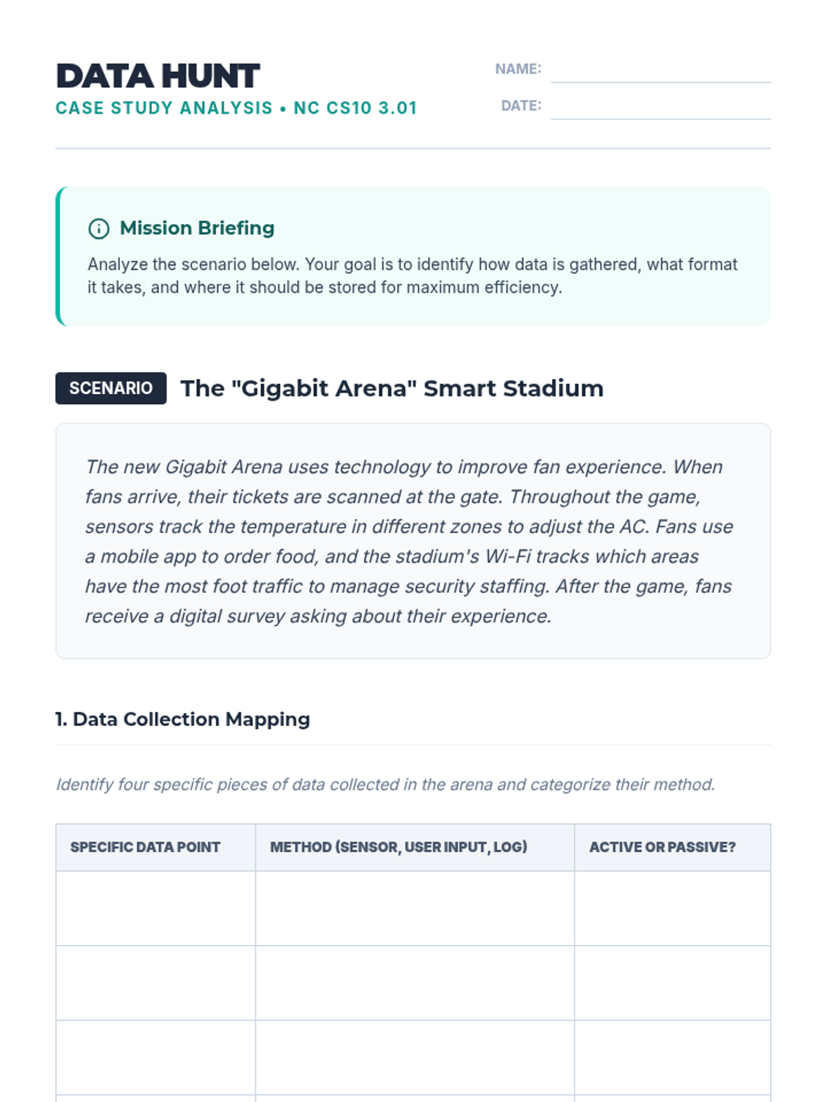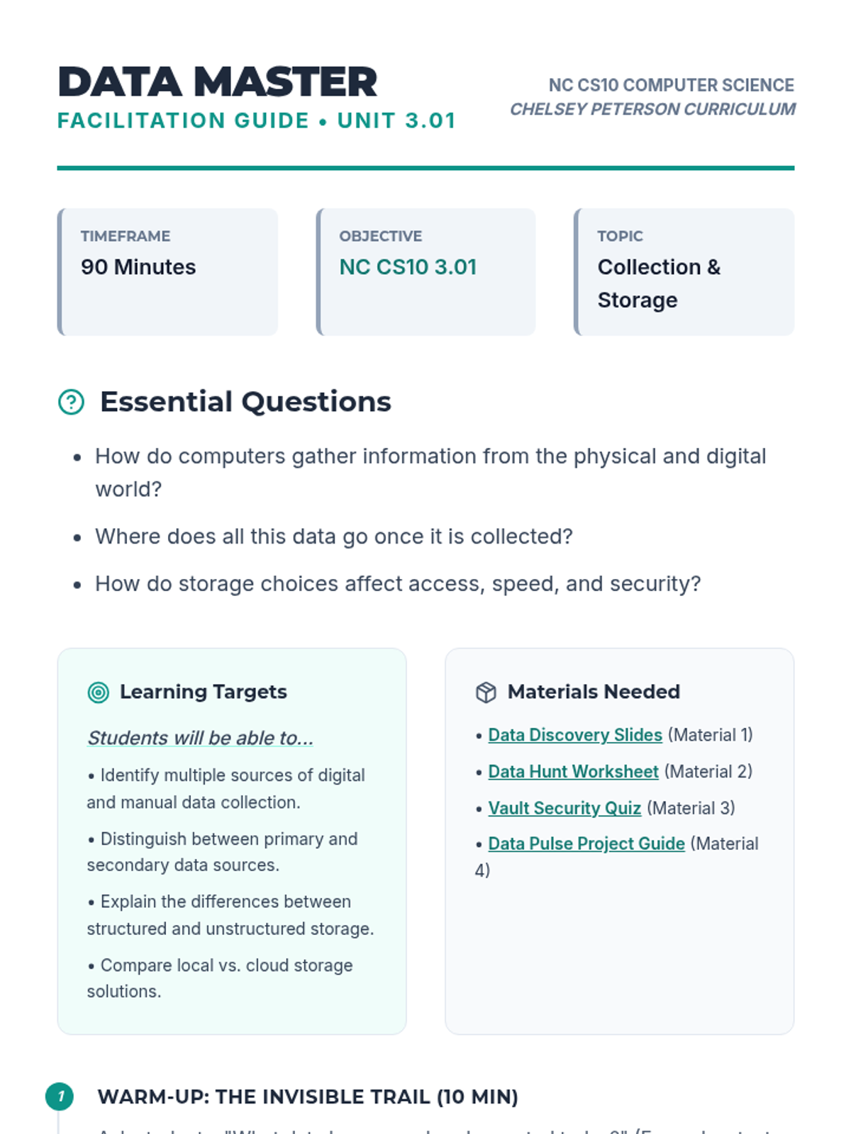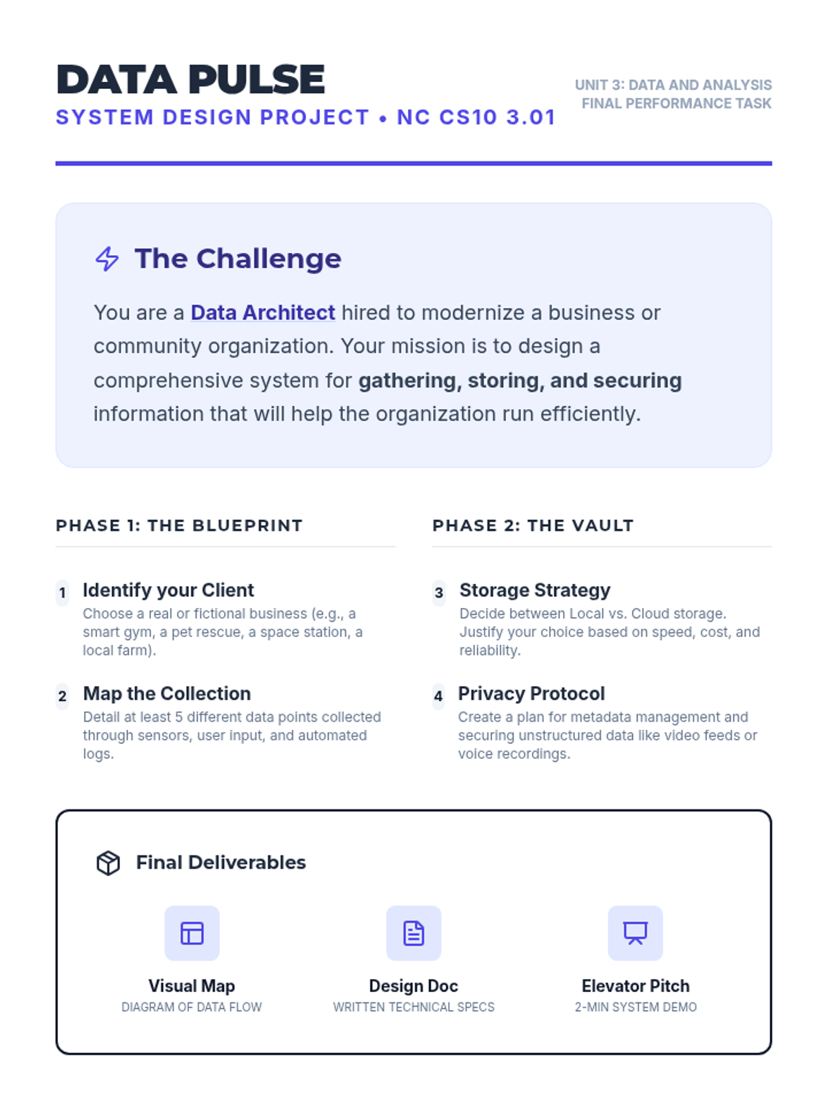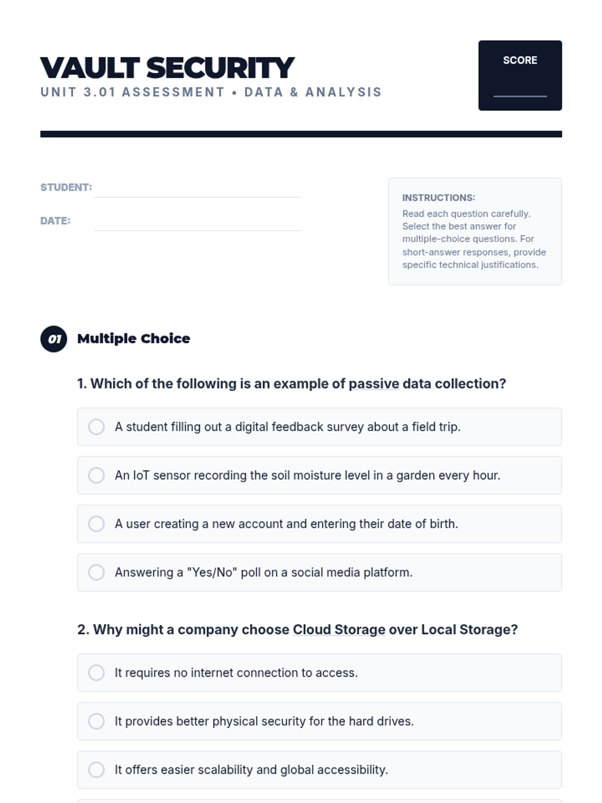 An exploration of data collection methods, storage formats, and the practical implications of data management in computer science. Students will identify data sources and compare storage solutions.