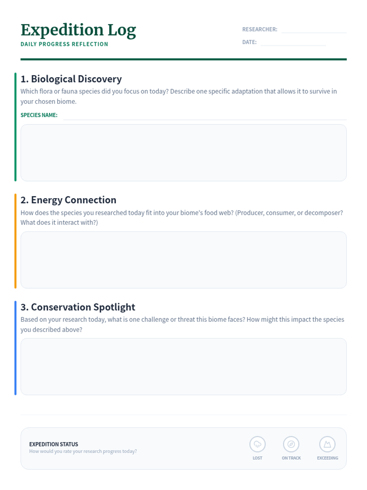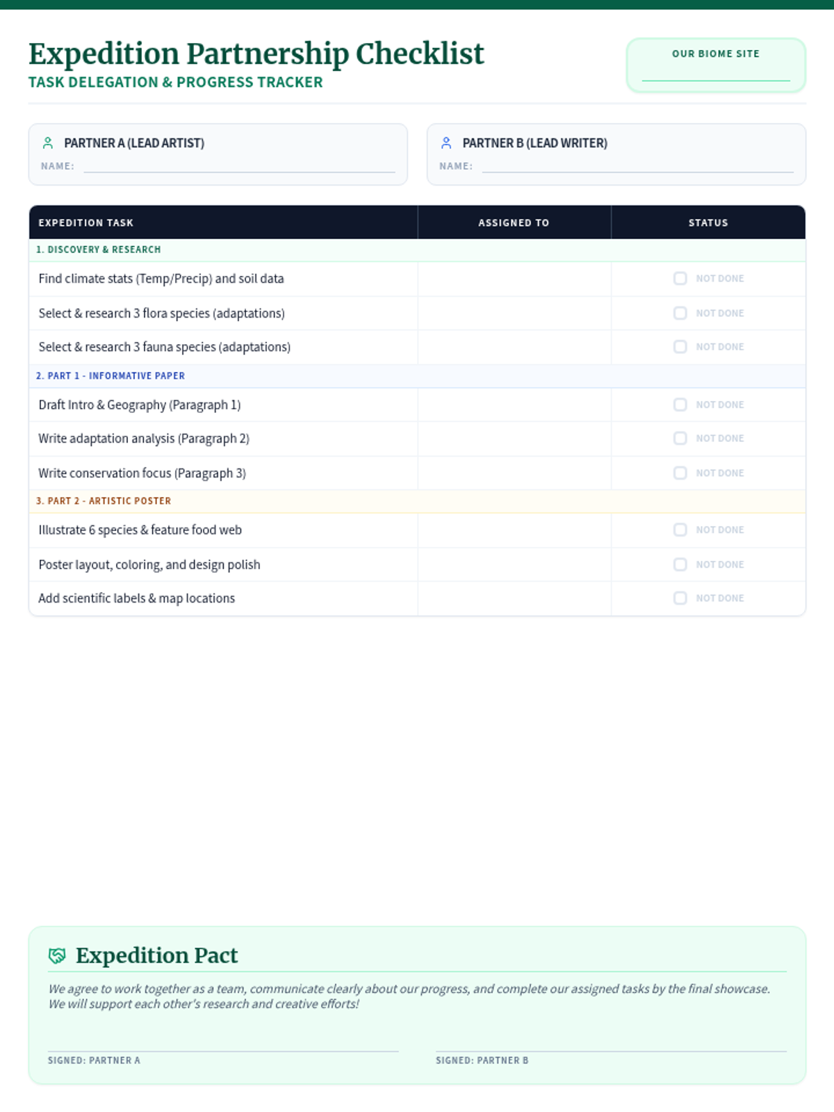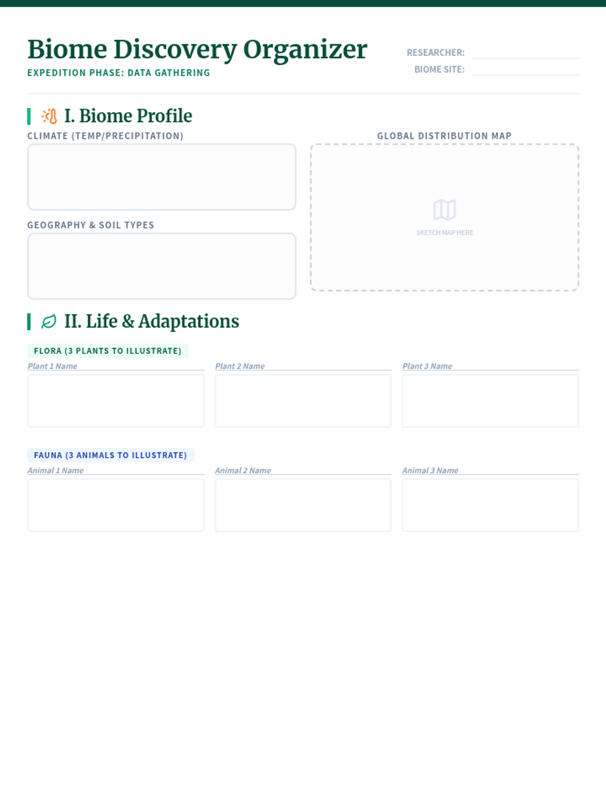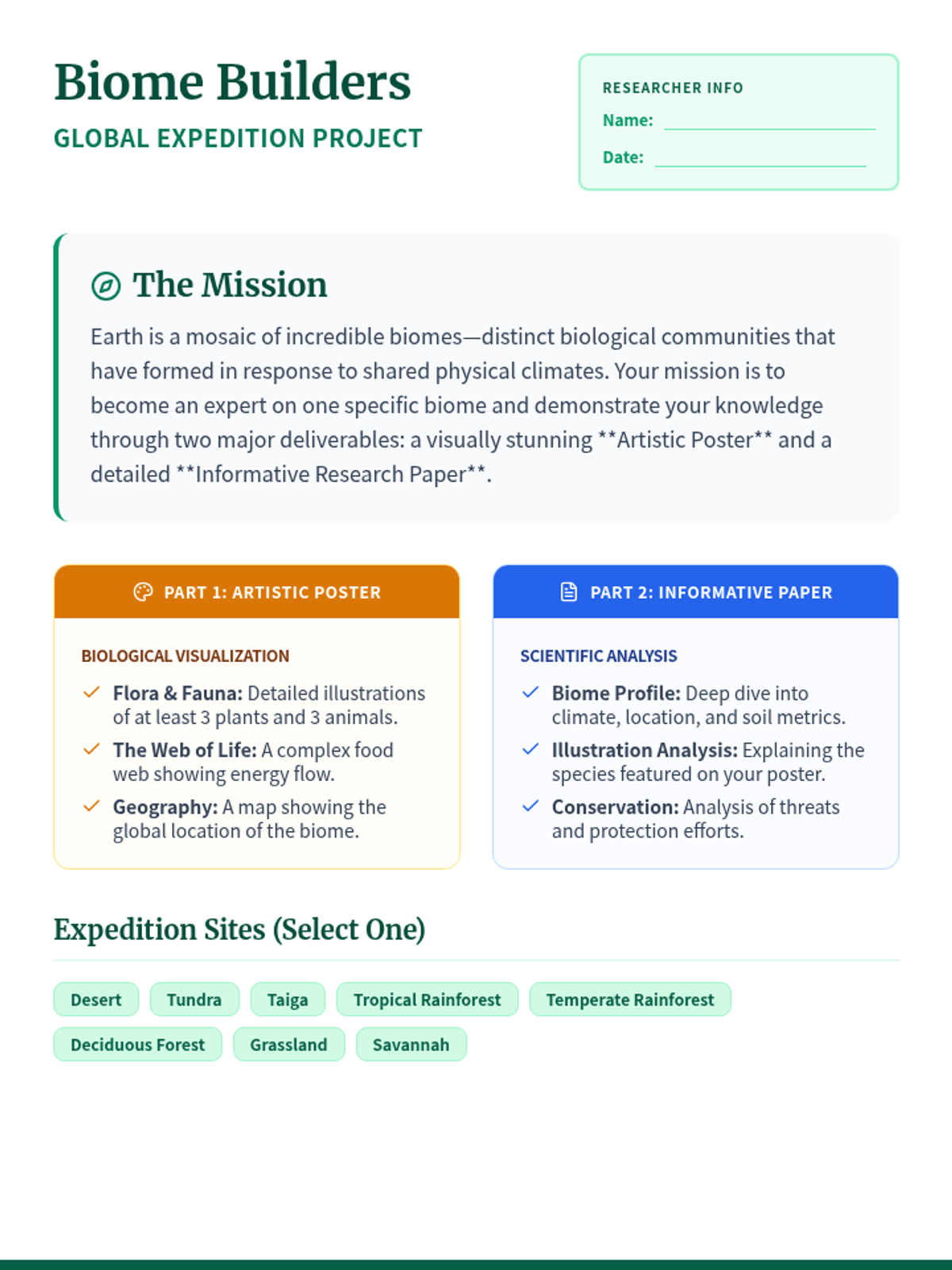 A creative project-based lesson where students research and design an educational poster about a specific global biome, focusing on adaptations, food webs, and conservation. Now expanded to include an informative research paper component.