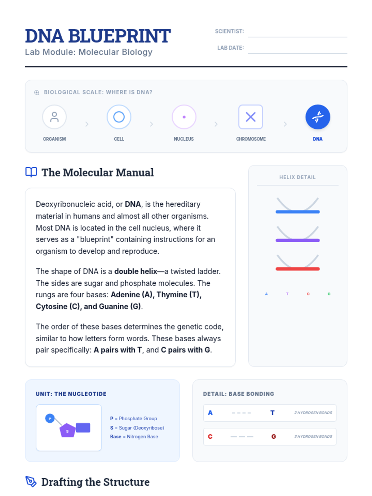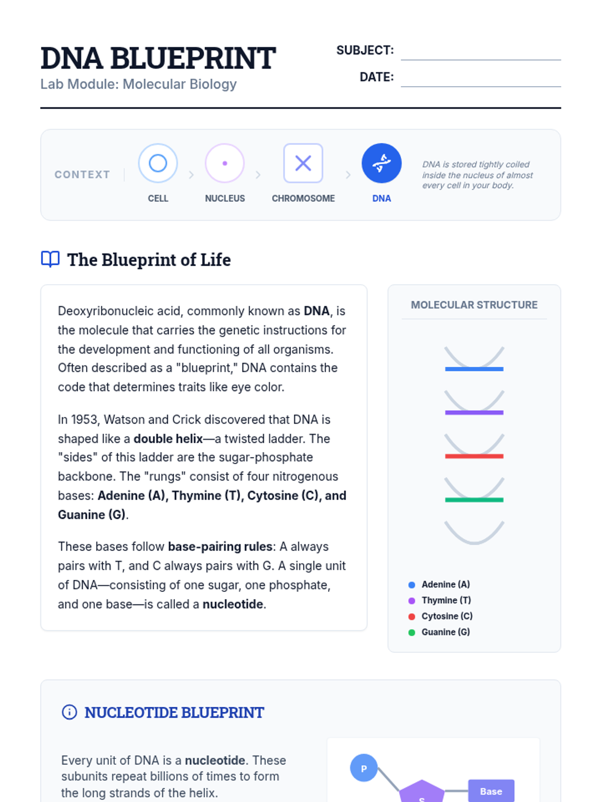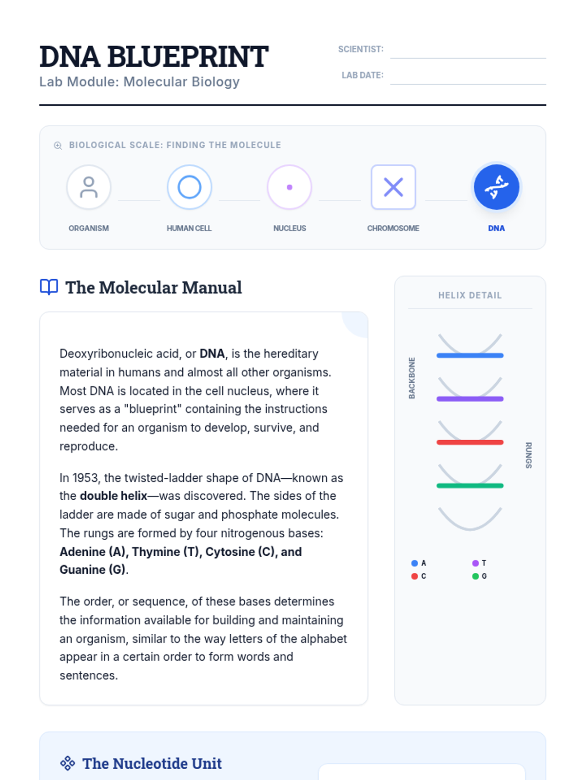 A comprehensive introduction to the structure and function of DNA, featuring reading passages, diagramming activities, and assessment questions.