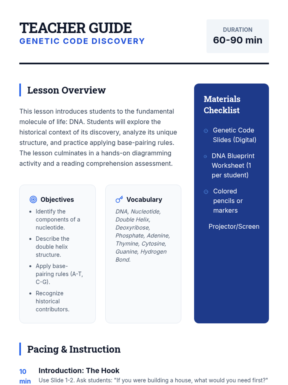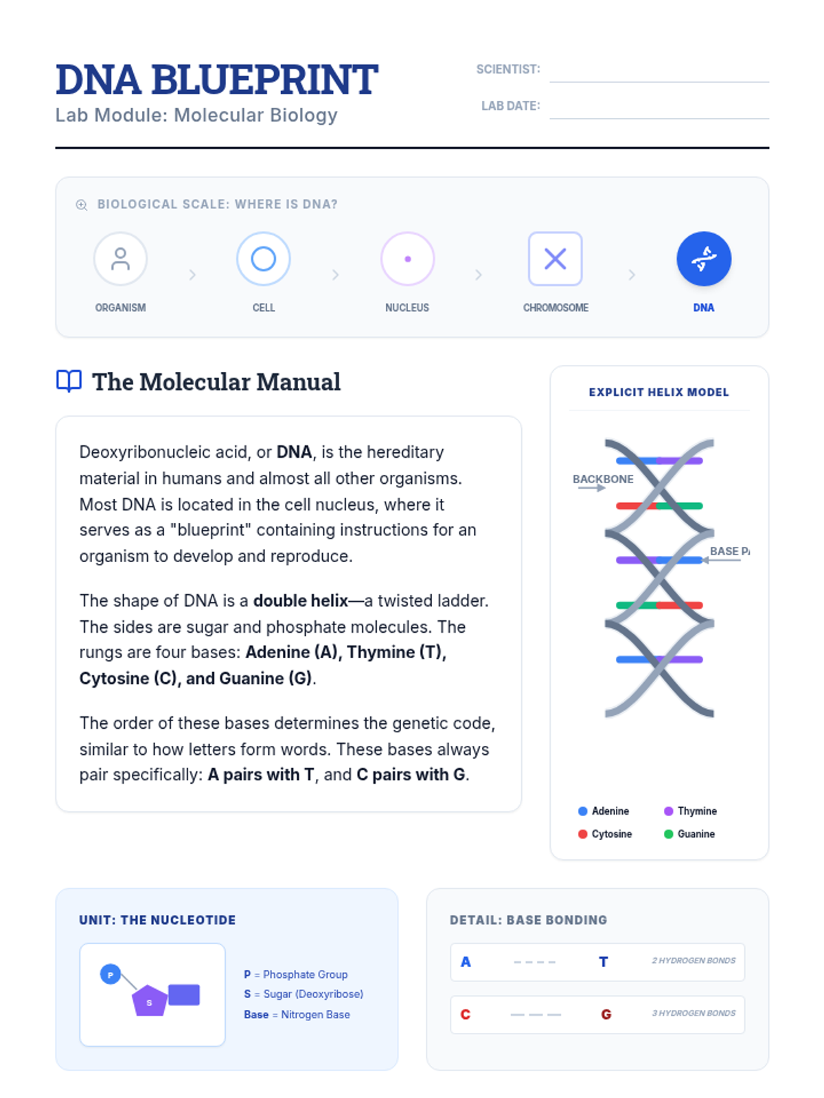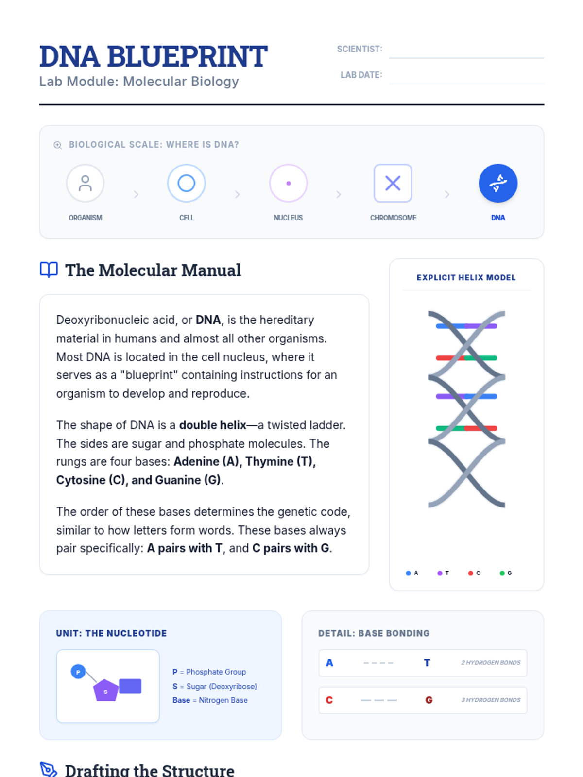 A comprehensive introduction to the structure and function of DNA, featuring reading passages, diagramming activities, and assessment questions.