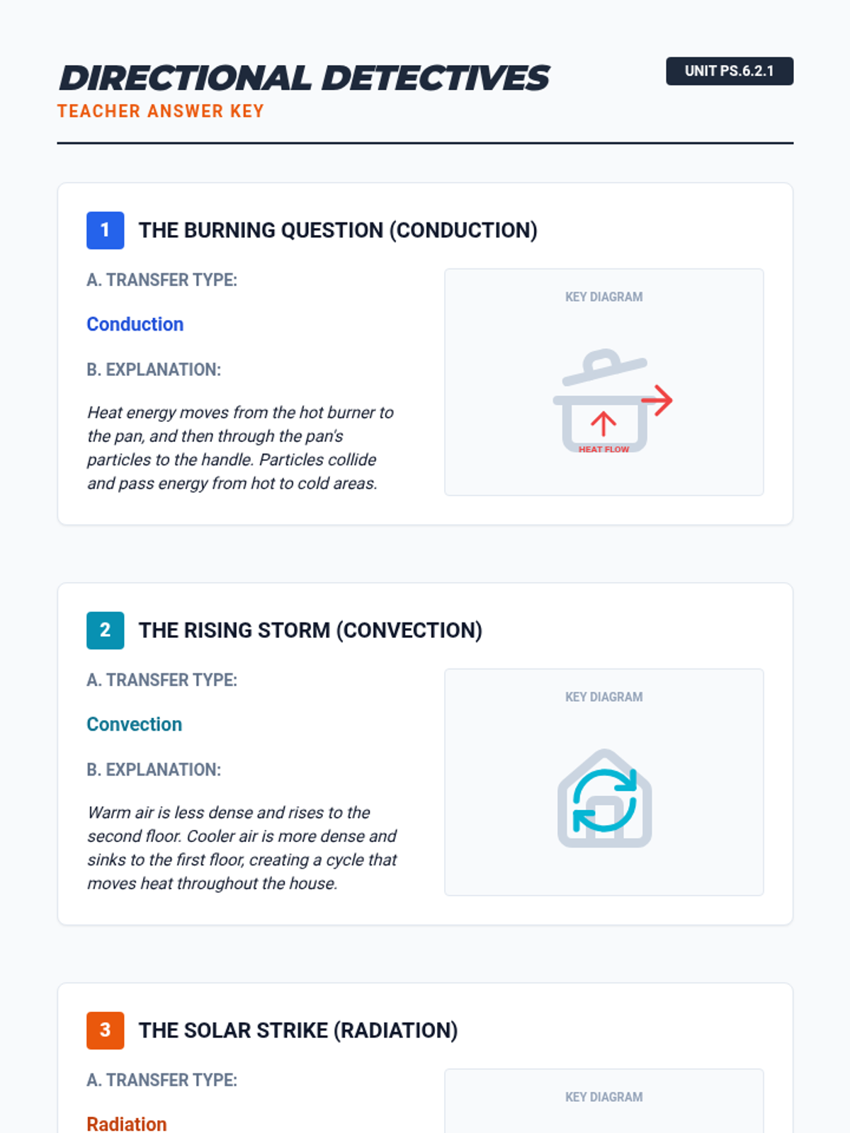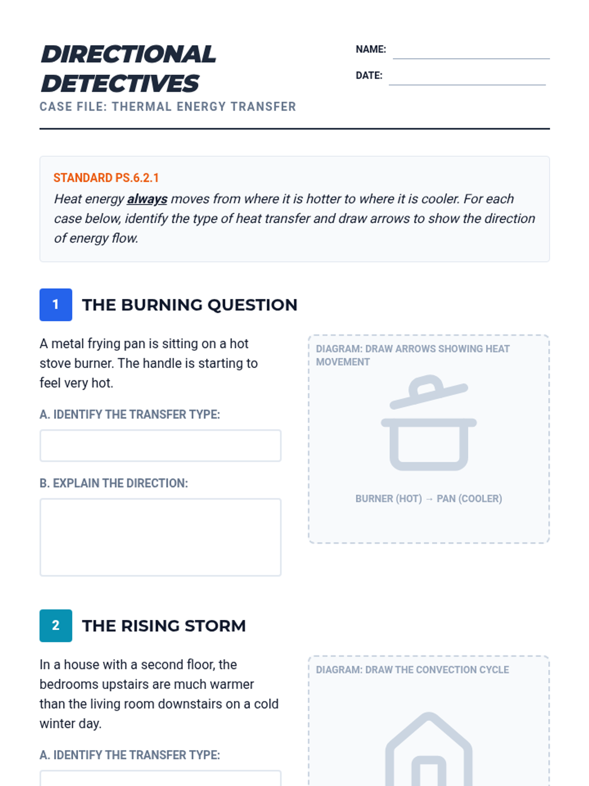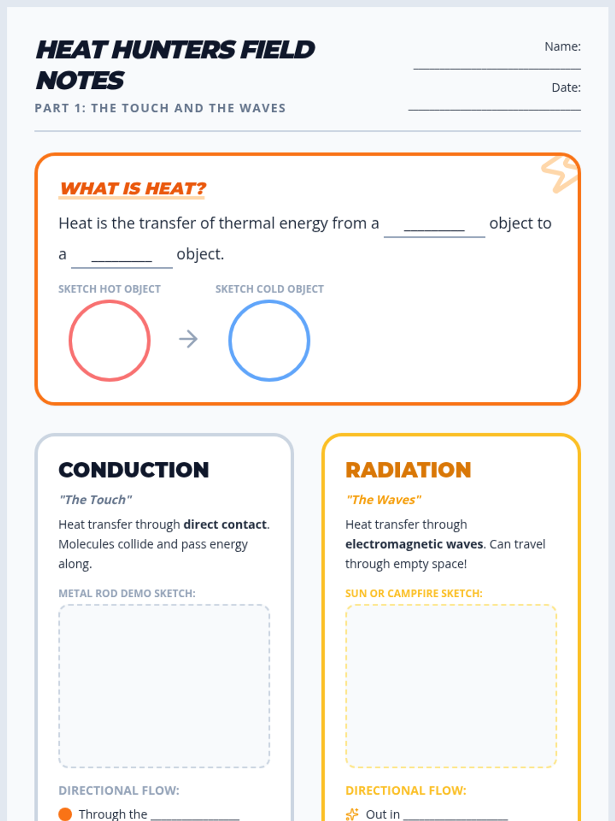 Students identify the three types of heat transfer and explain how thermal energy moves from warmer matter to cooler matter using real-world examples.