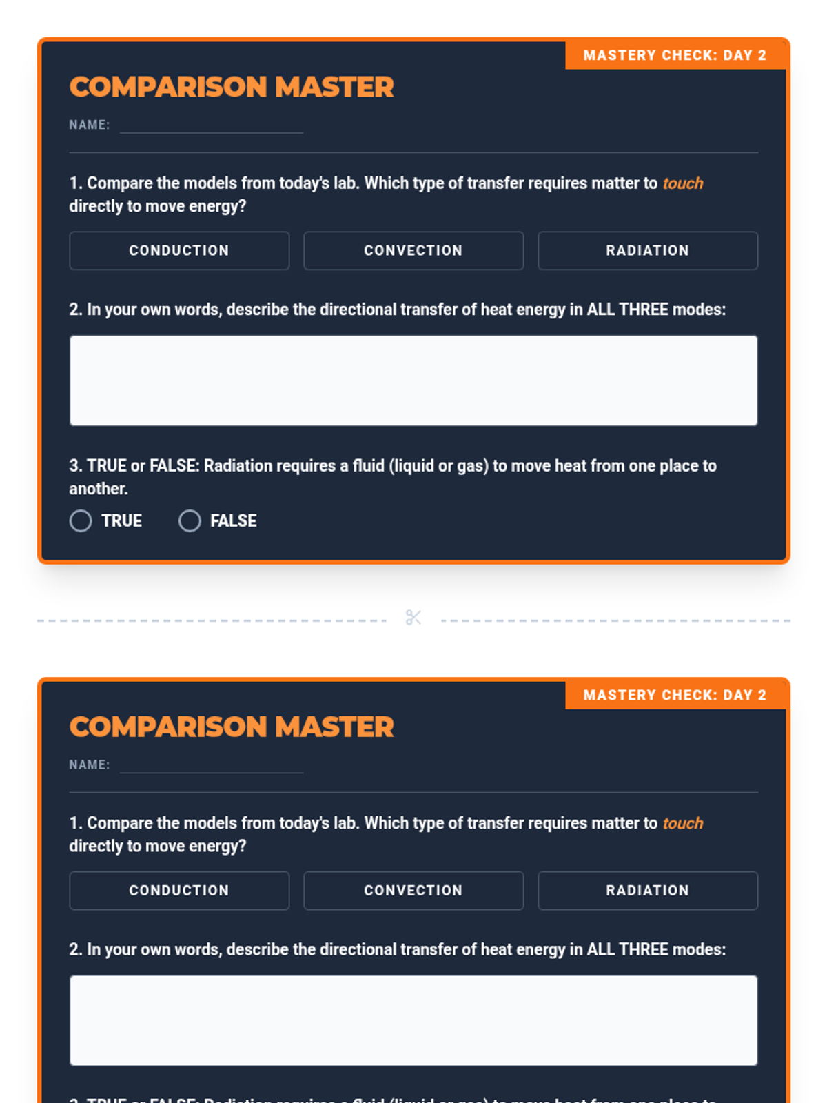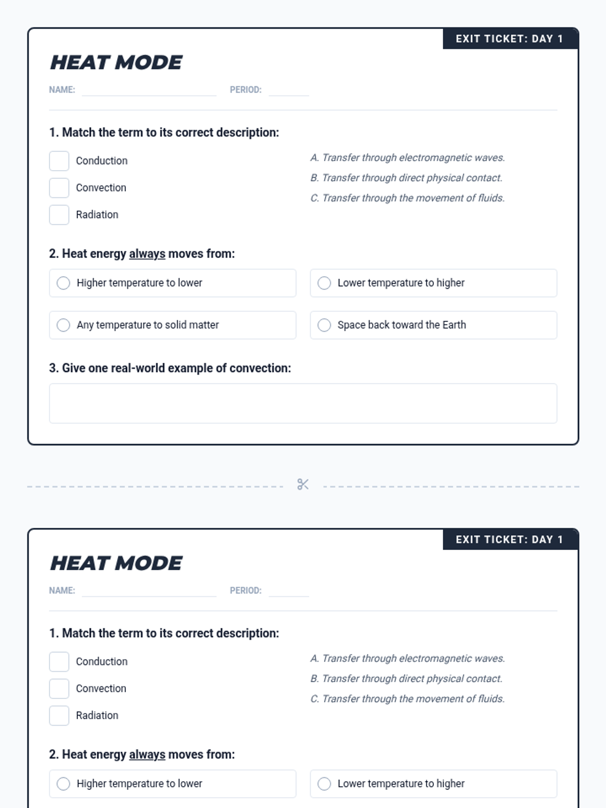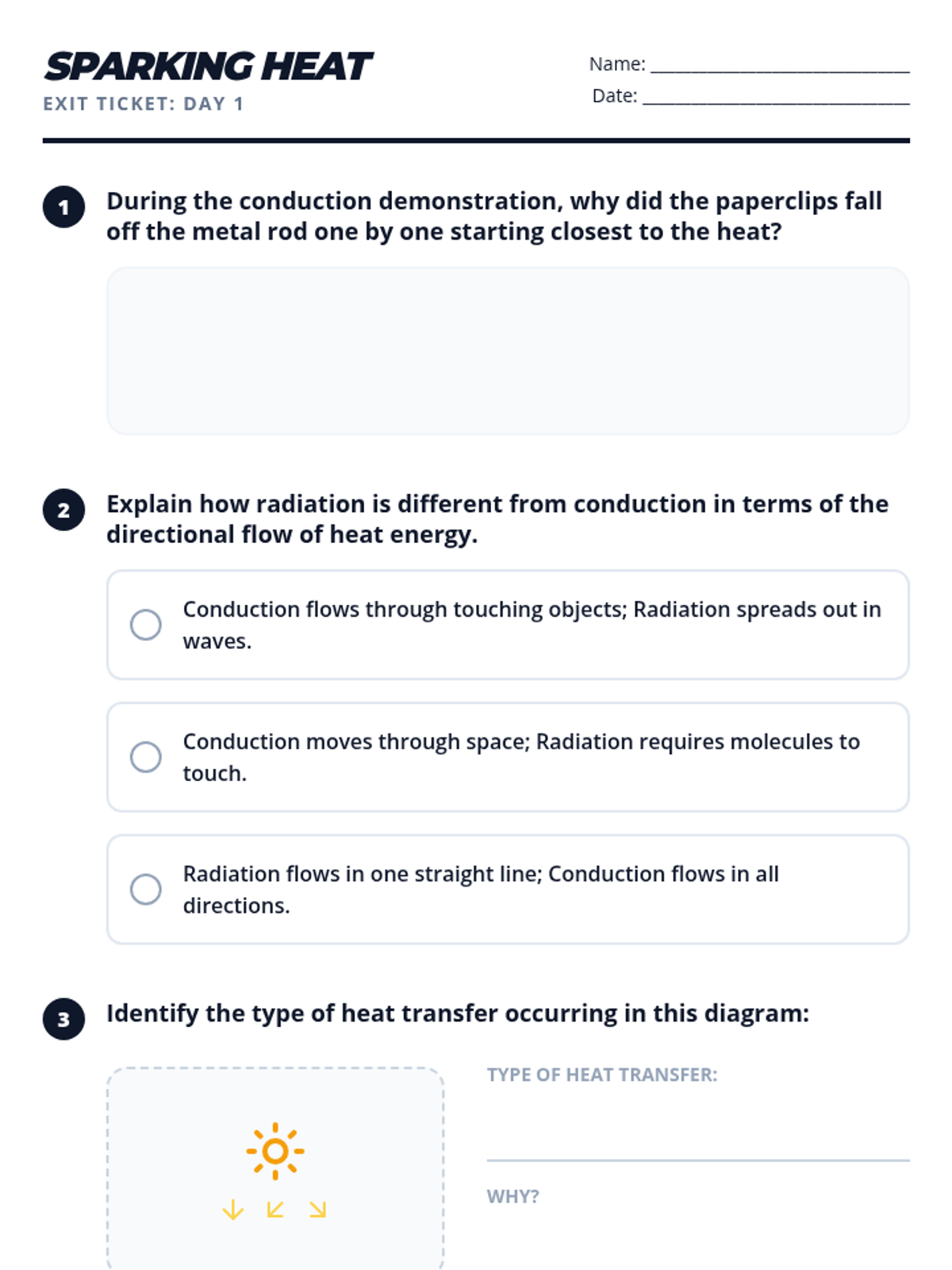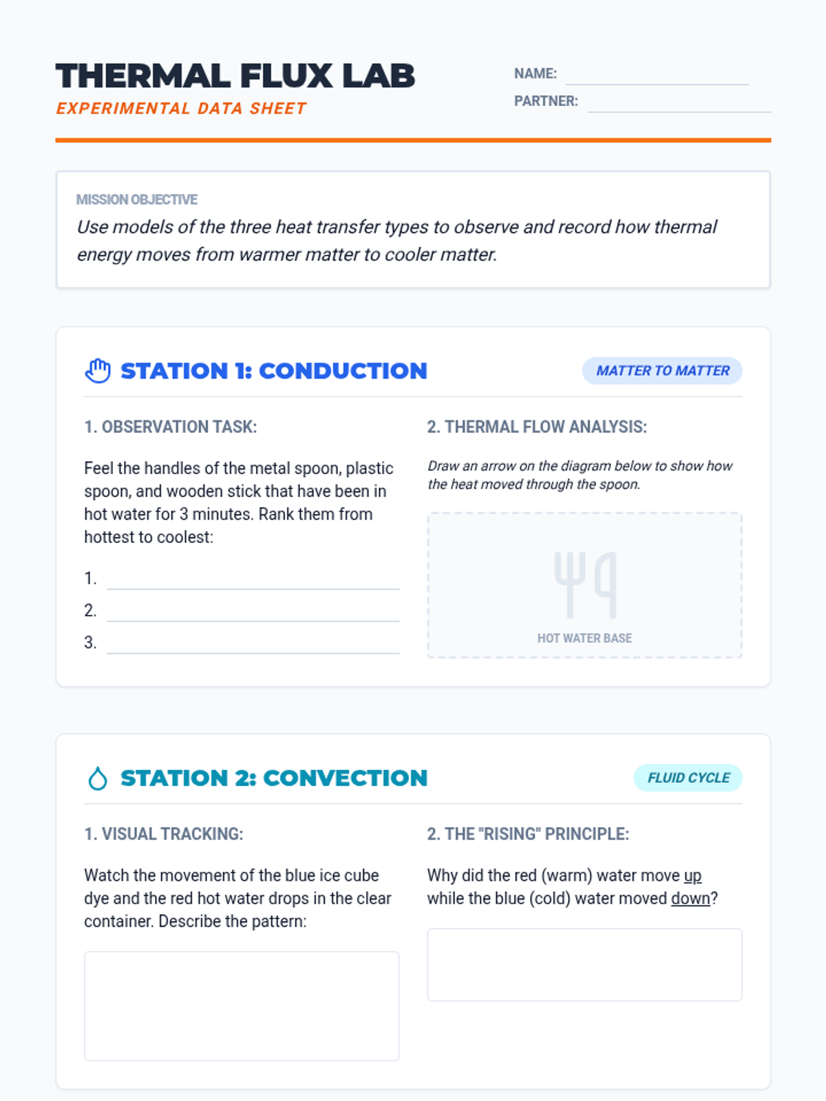 Students identify the three types of heat transfer and explain how thermal energy moves from warmer matter to cooler matter using real-world examples.