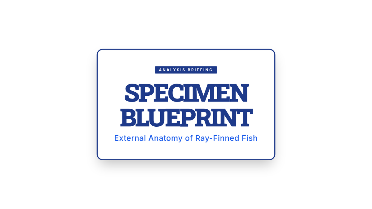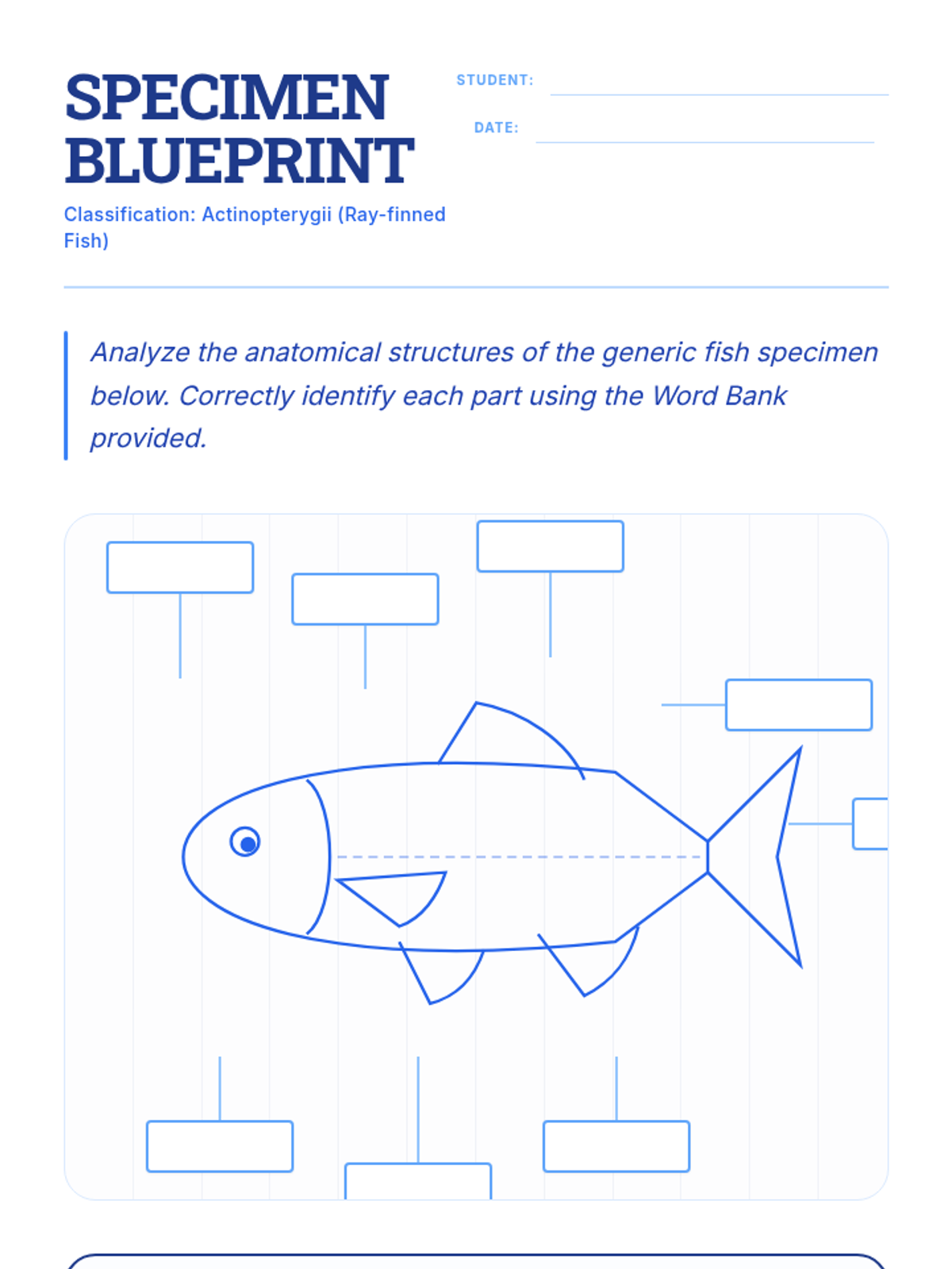 A lesson focusing on the external anatomy of ray-finned fish using a technical blueprint aesthetic. Students will identify key structures like fins, the lateral line, and the operculum.