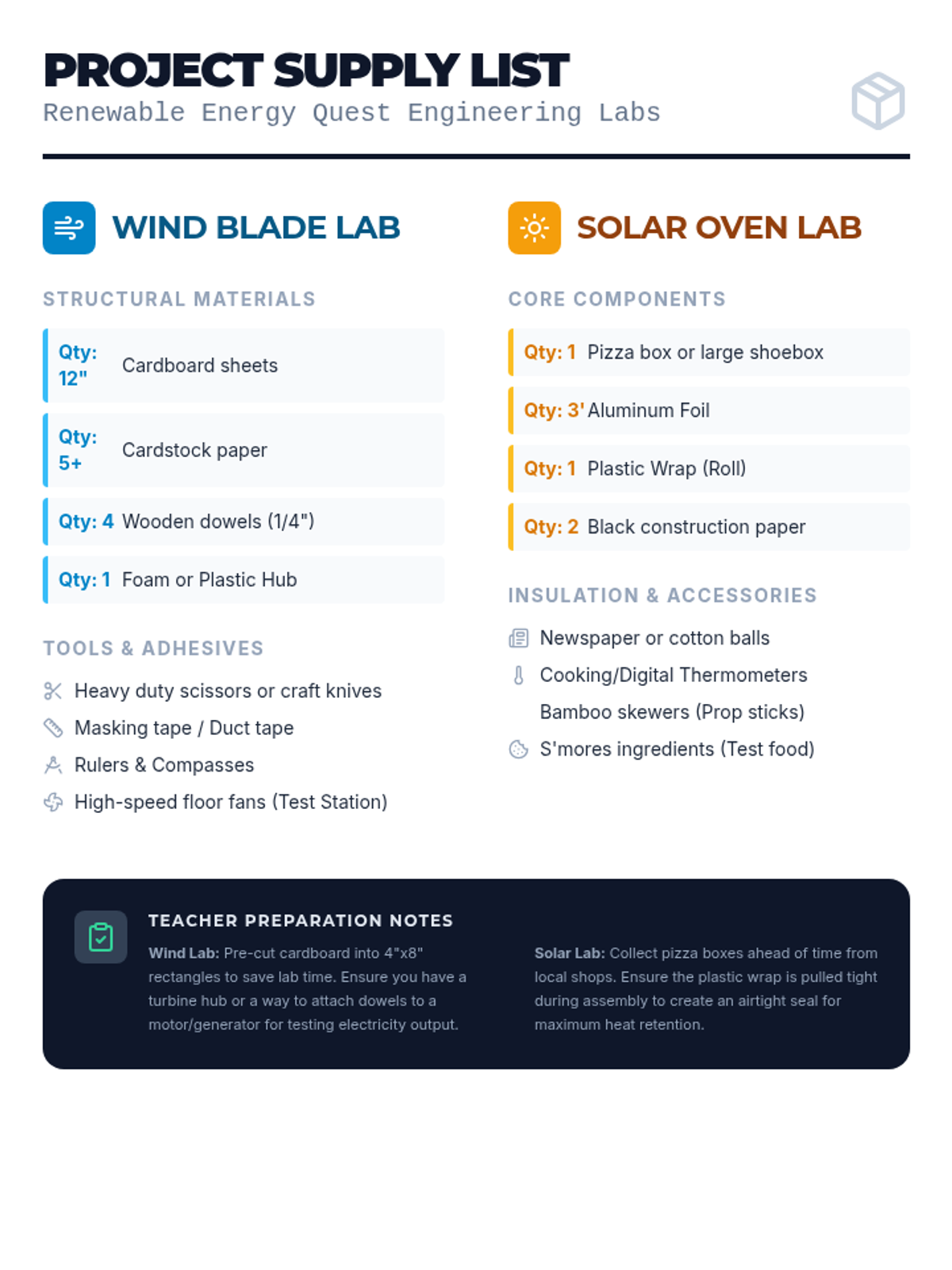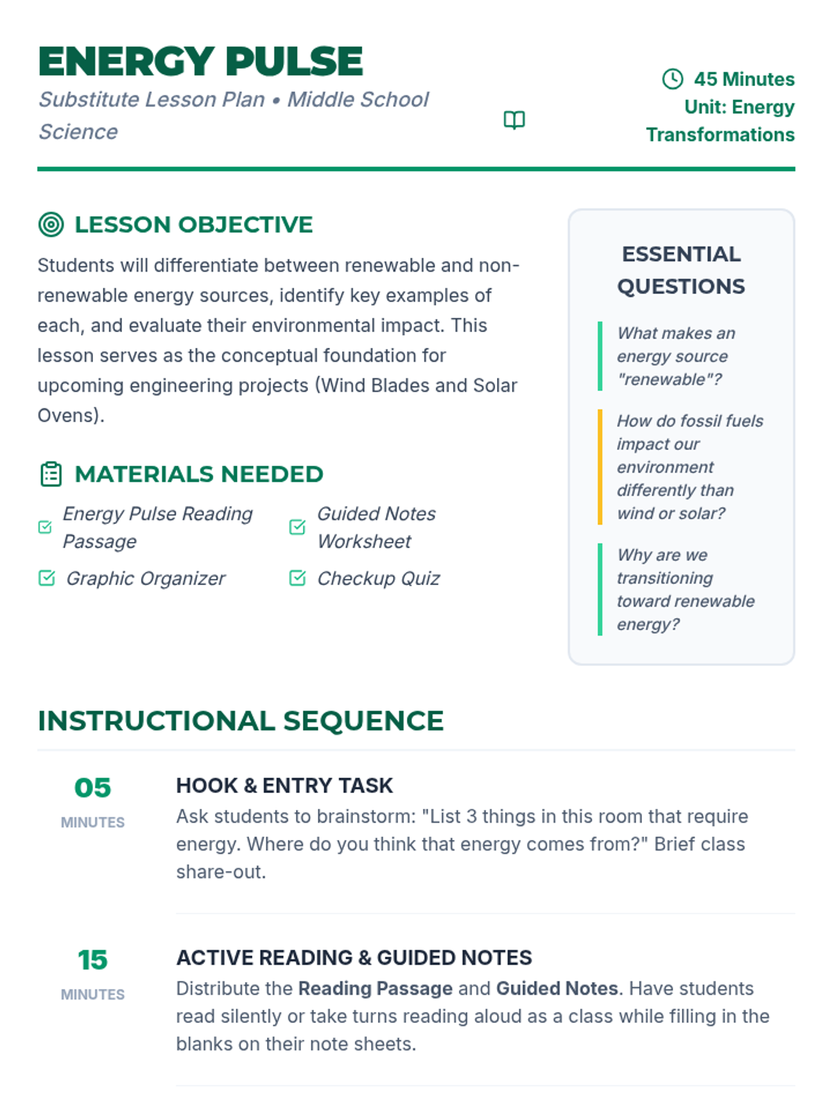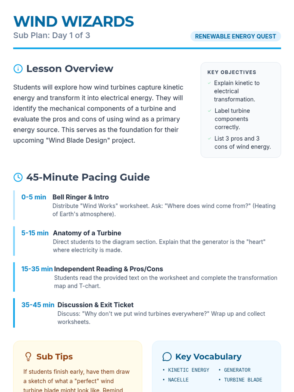 A comprehensive 45-minute introductory lesson on renewable and non-renewable energy sources, designed for a substitute teacher. This lesson prepares middle school students for hands-on engineering projects like wind blades and solar ovens.