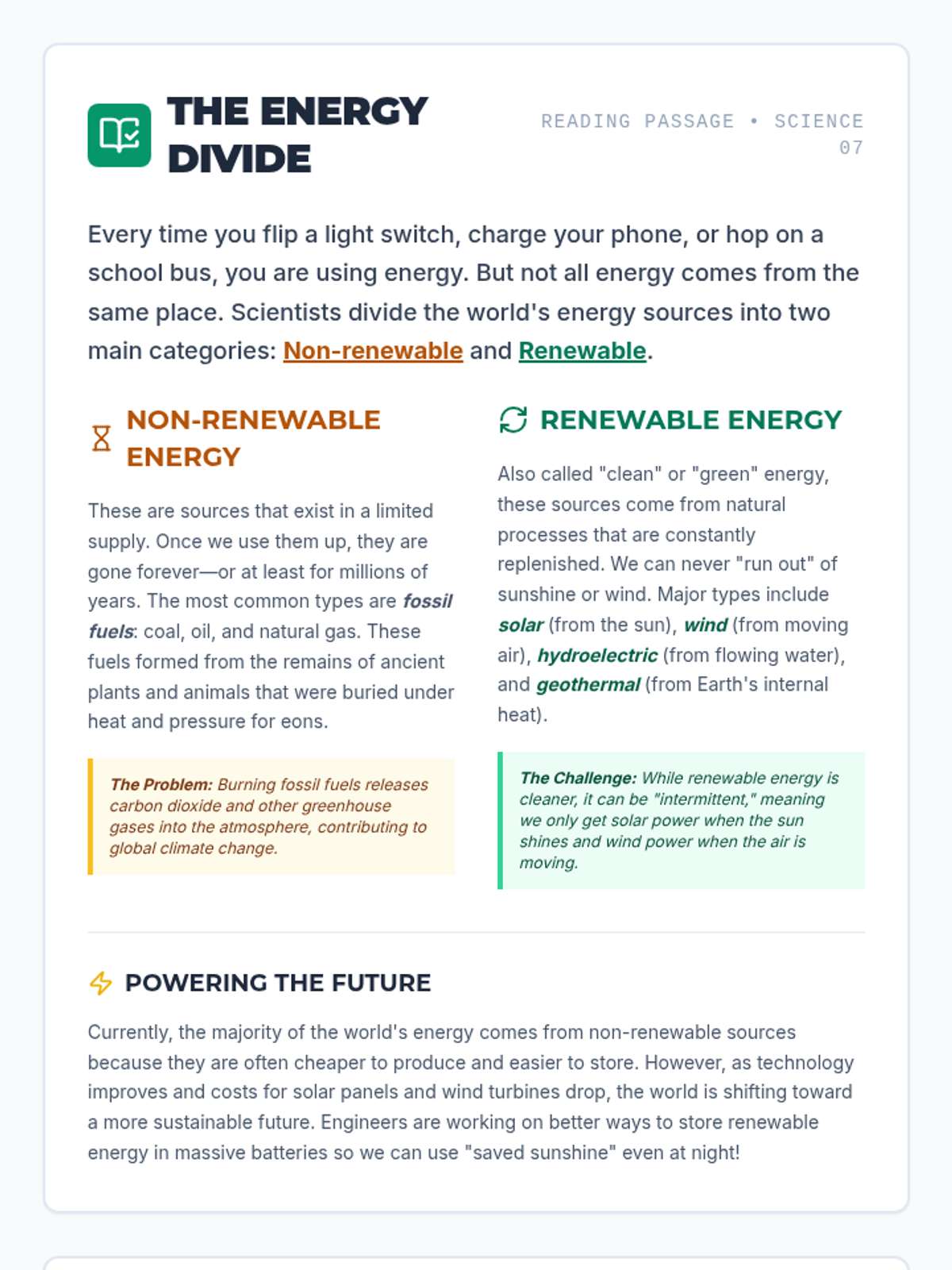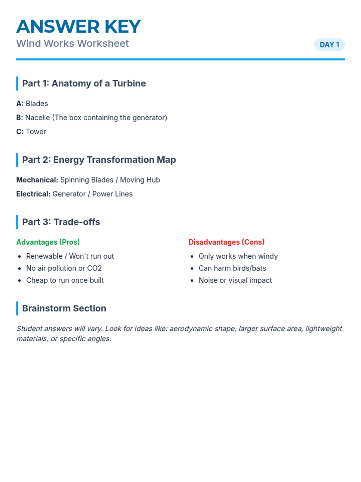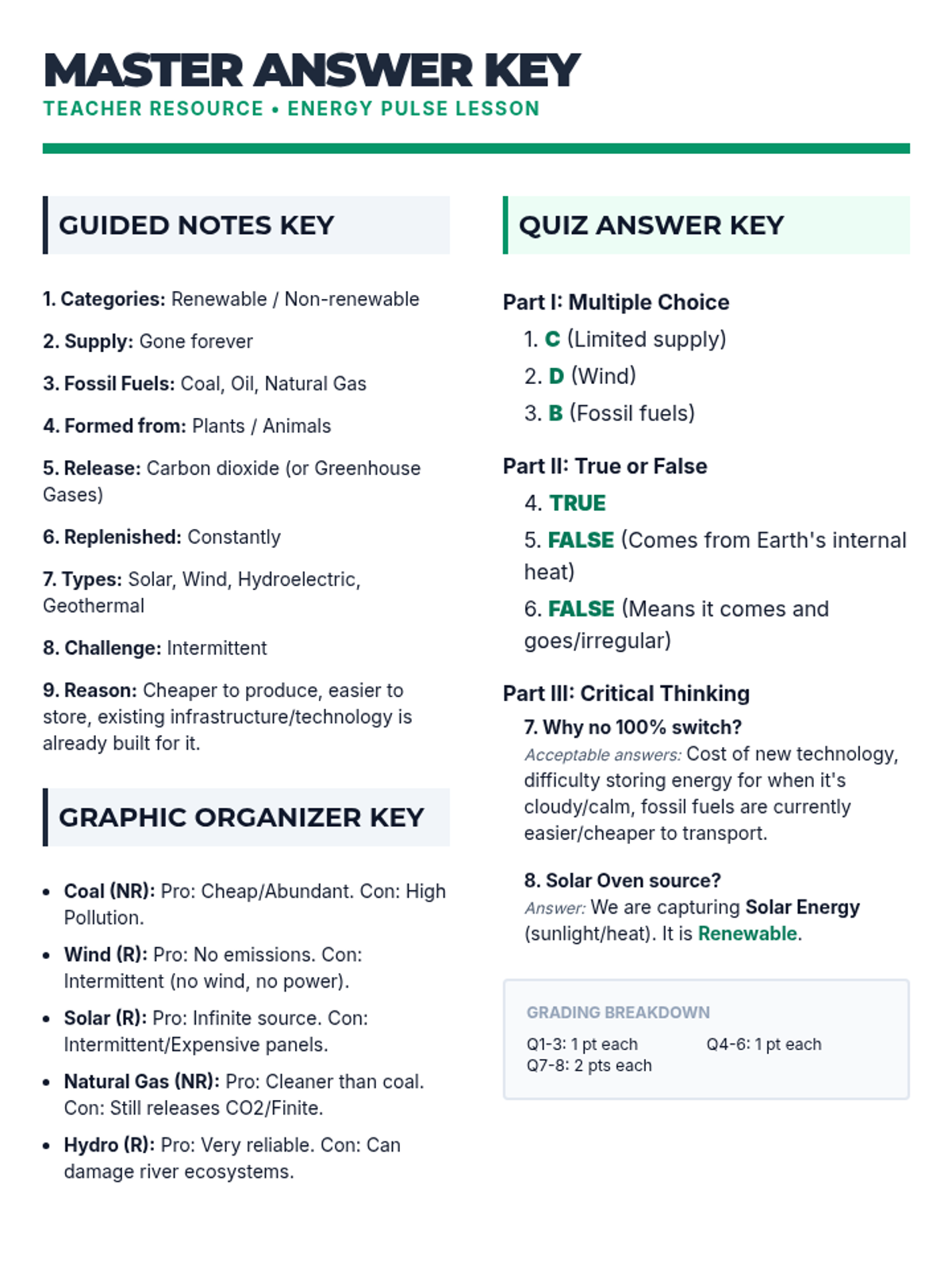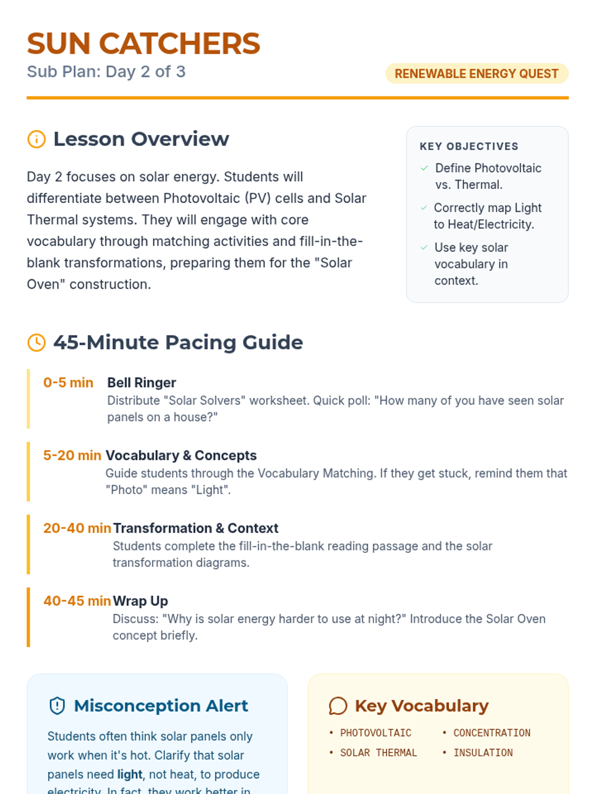 A comprehensive 45-minute introductory lesson on renewable and non-renewable energy sources, designed for a substitute teacher. This lesson prepares middle school students for hands-on engineering projects like wind blades and solar ovens.
