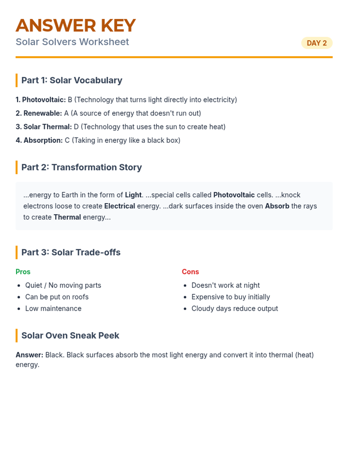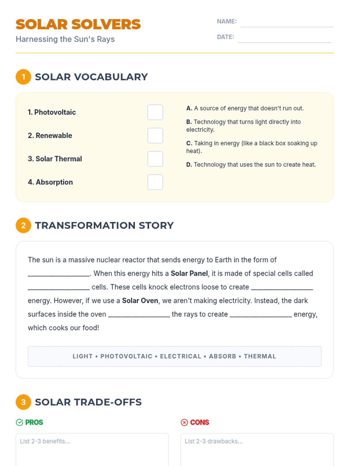 A lesson exploring solar energy technology, including photovoltaic and thermal systems, energy transformation from light to heat/electricity, and solar energy vocabulary.