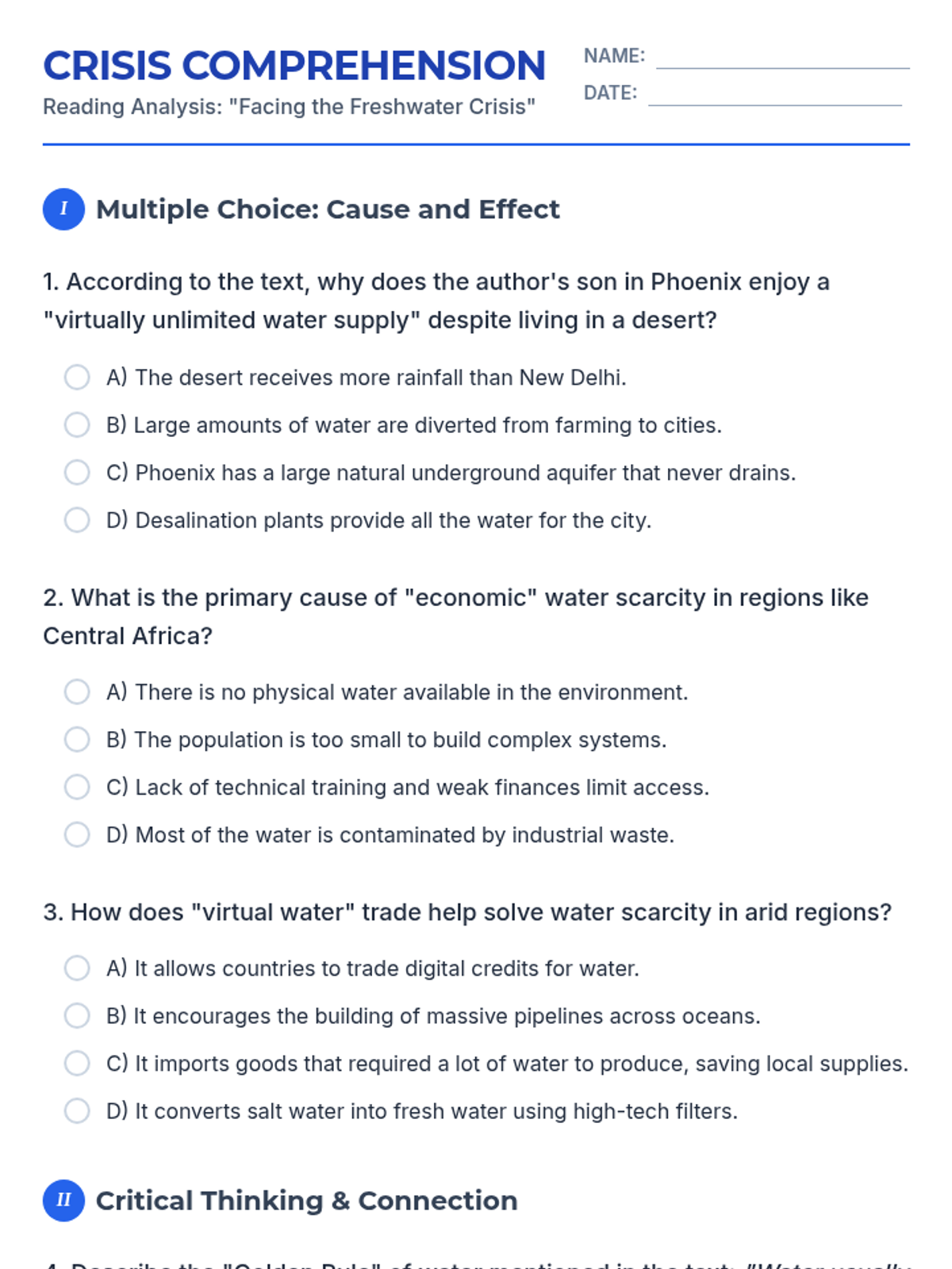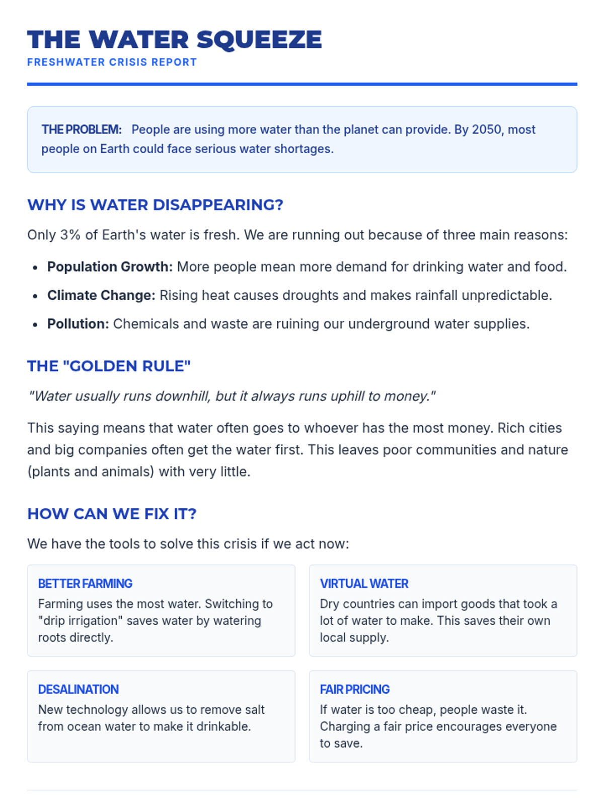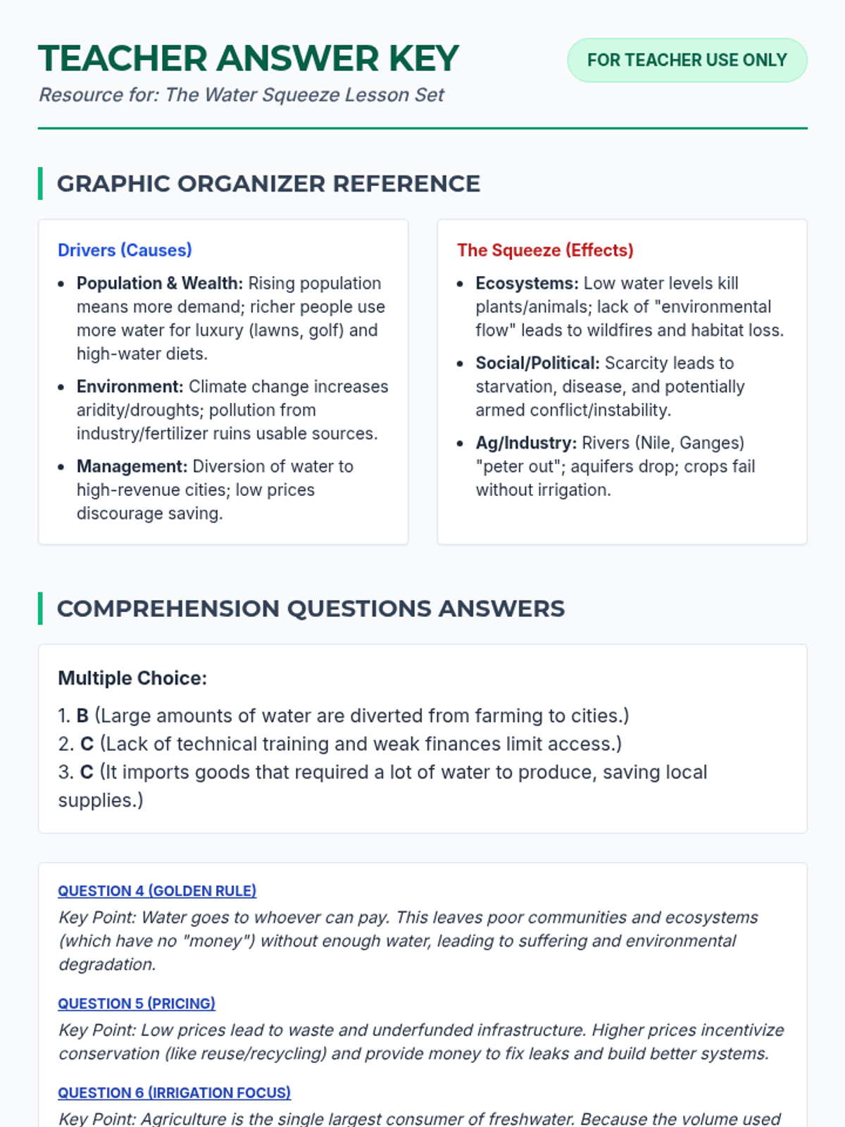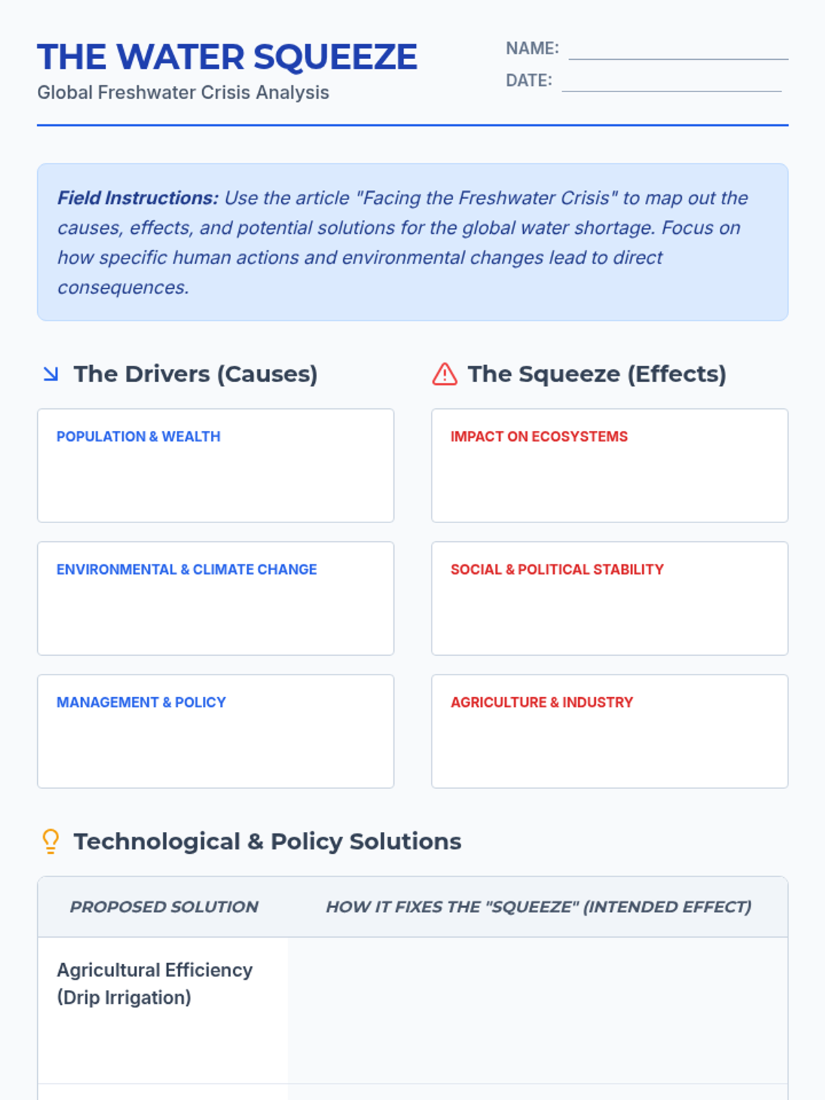 A comprehensive set of materials focusing on the global freshwater crisis, designed to help students identify cause-and-effect relationships within complex environmental systems. Students will analyze the drivers of water scarcity, its global impact, and potential technological and policy solutions.