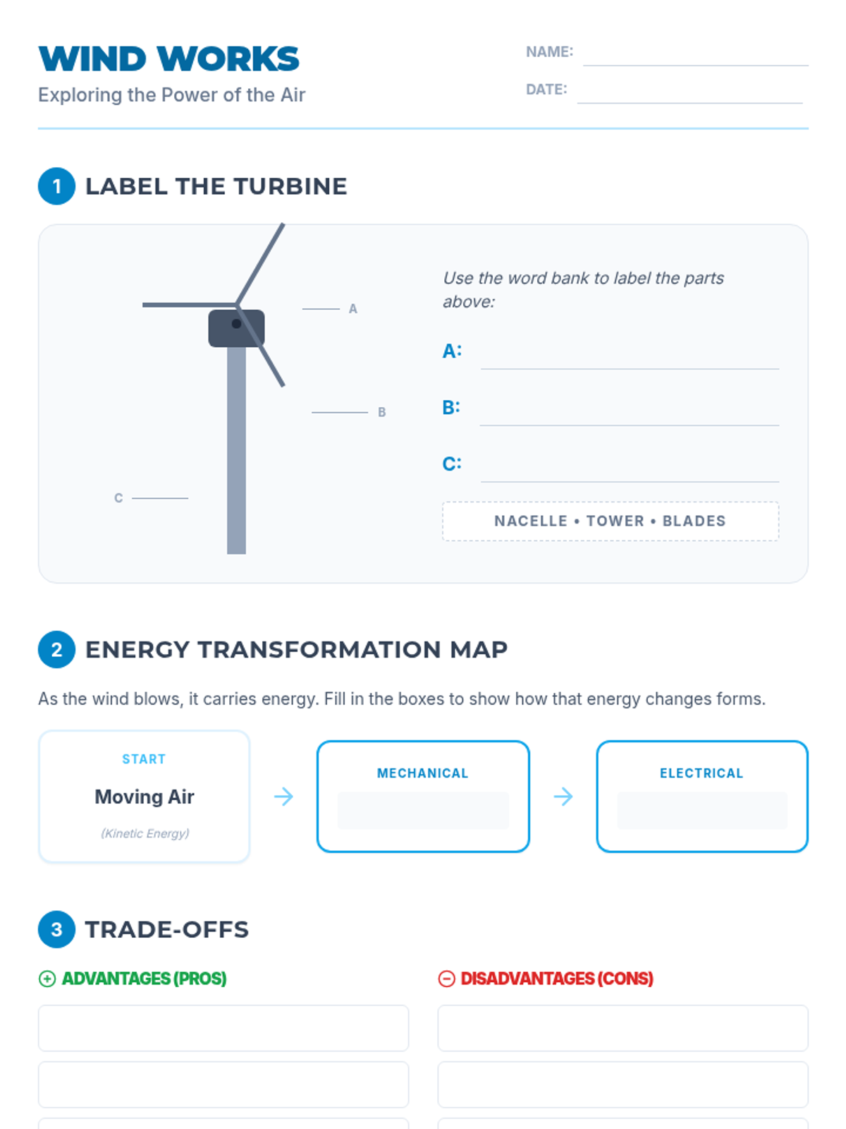 An introductory lesson on wind energy focusing on the mechanics of turbines, energy transformations from kinetic to electrical, and the trade-offs of wind power.