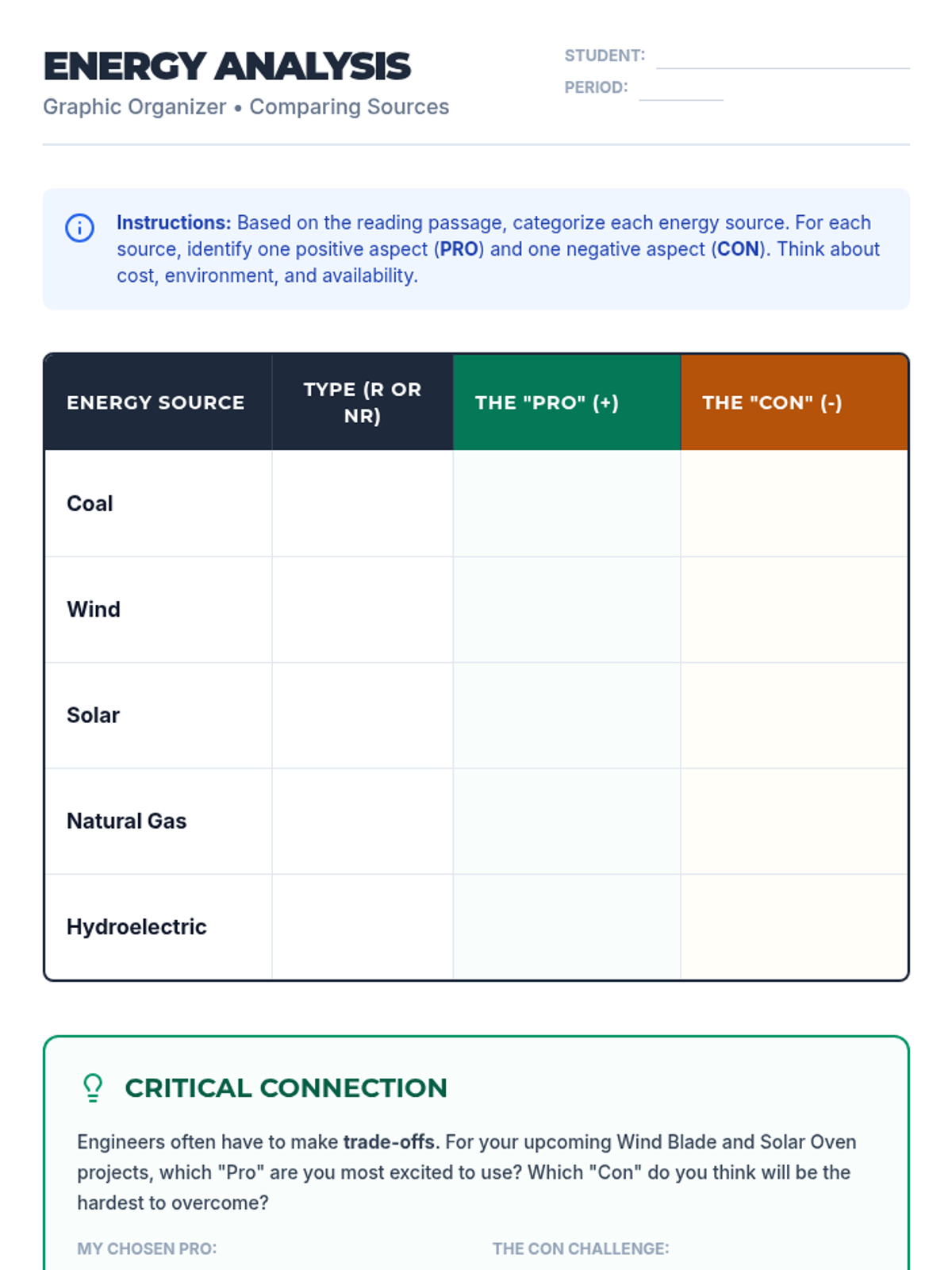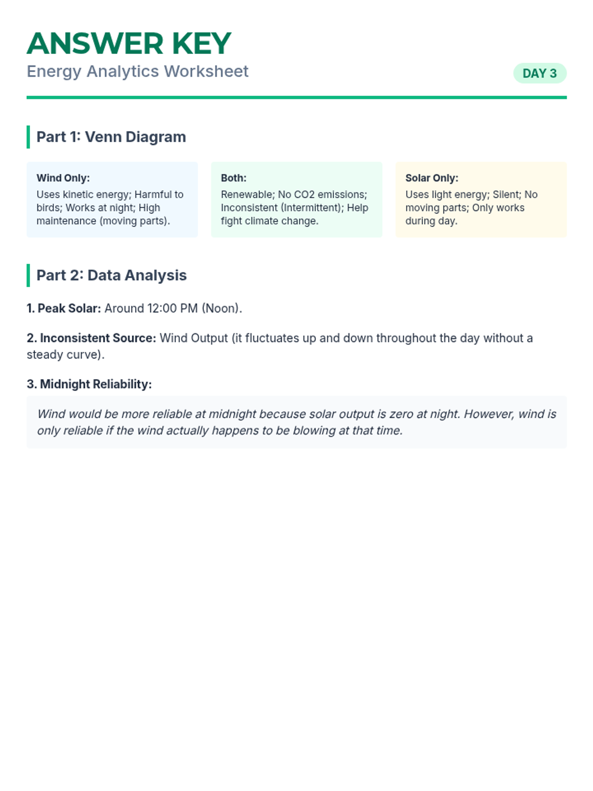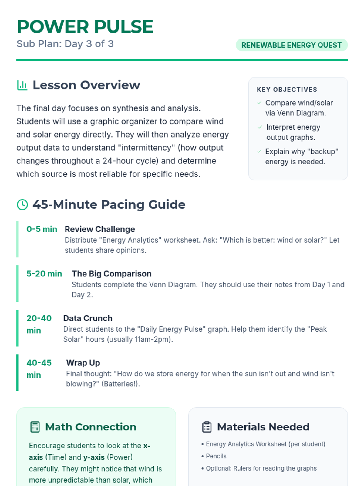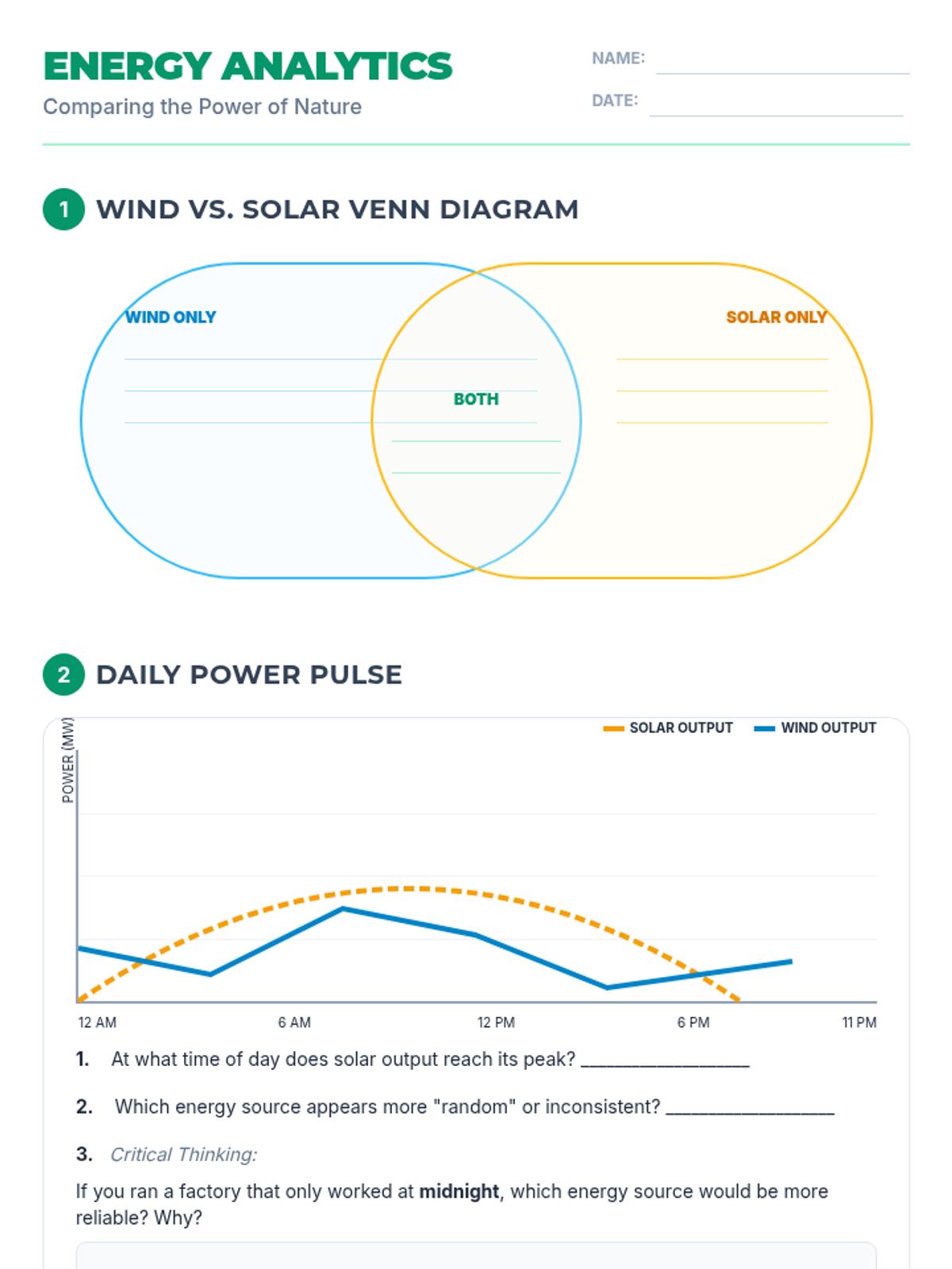 A culminating lesson where students compare wind and solar energy using graphic organizers and analyze real-world energy output data to understand reliability and efficiency.