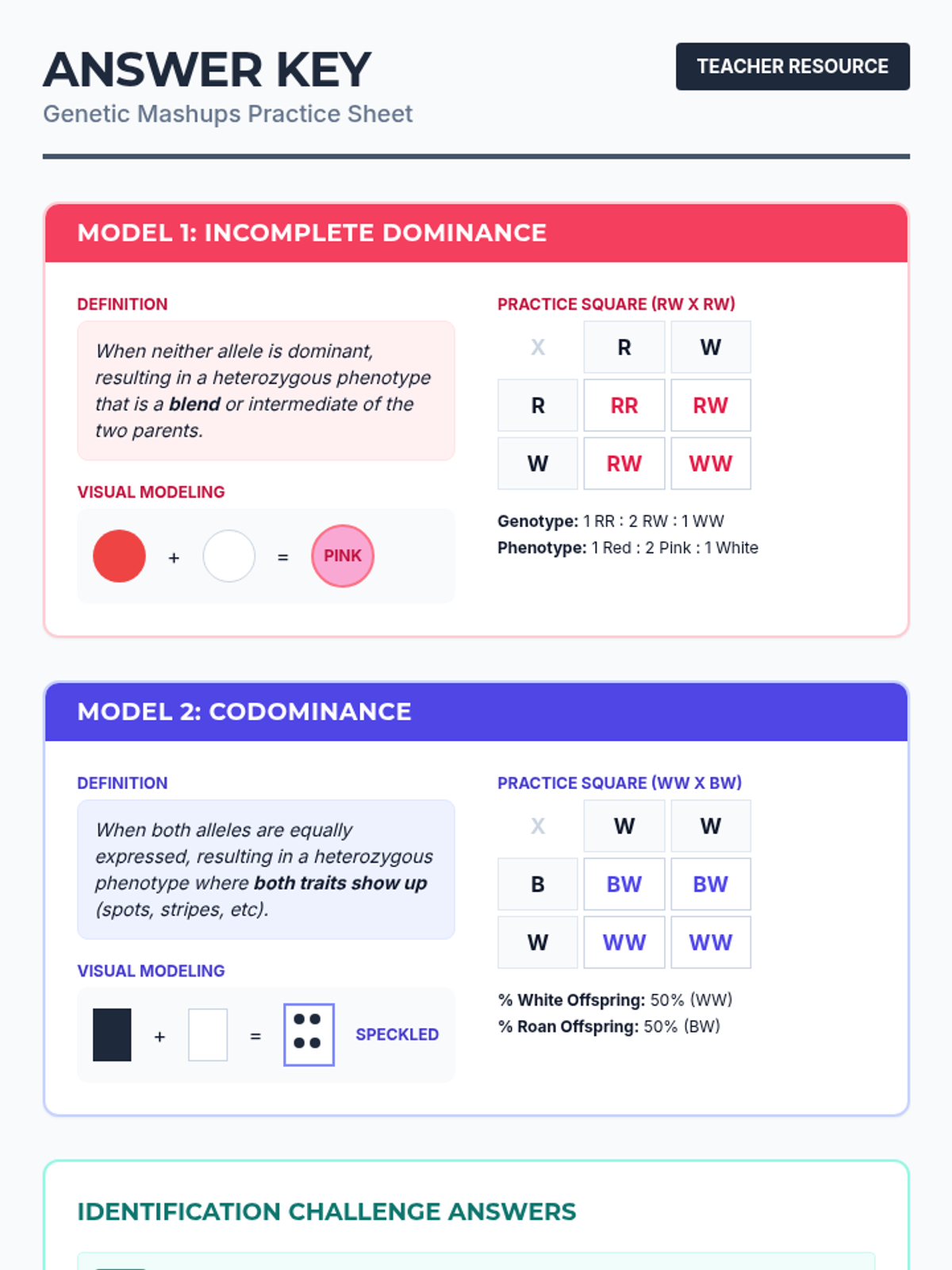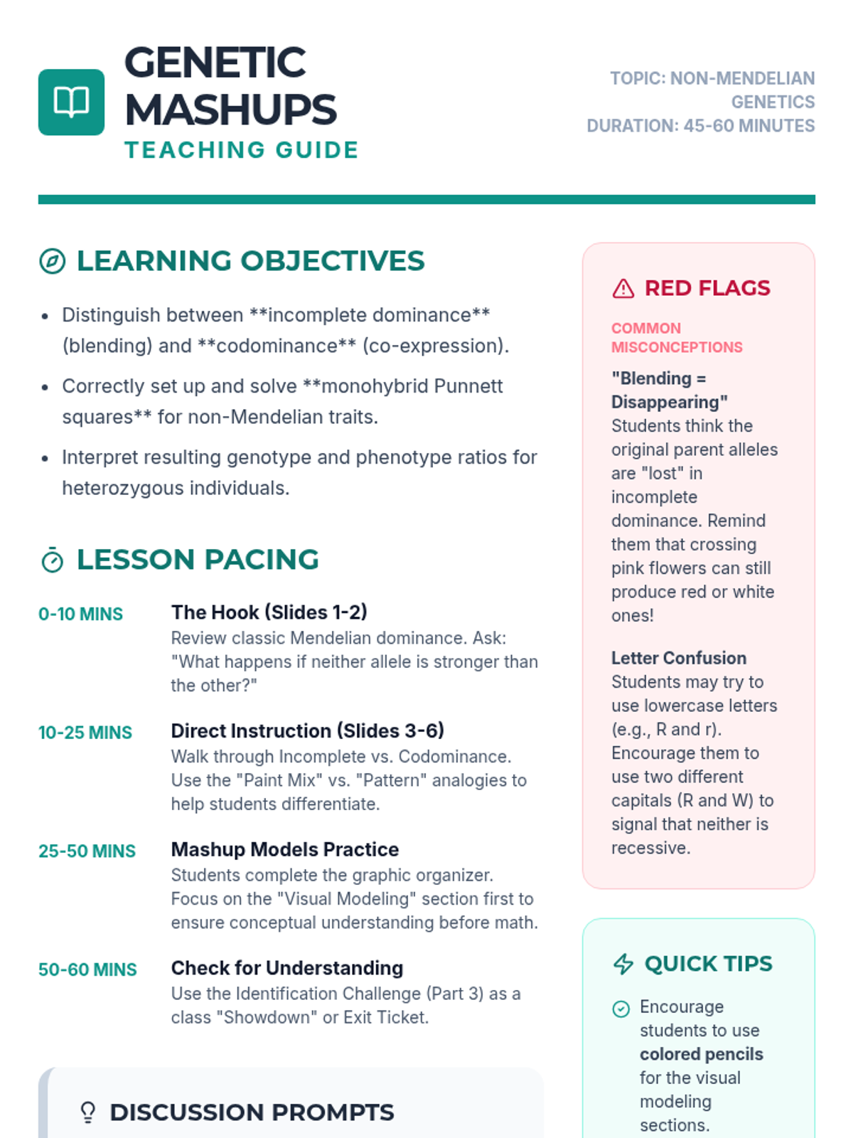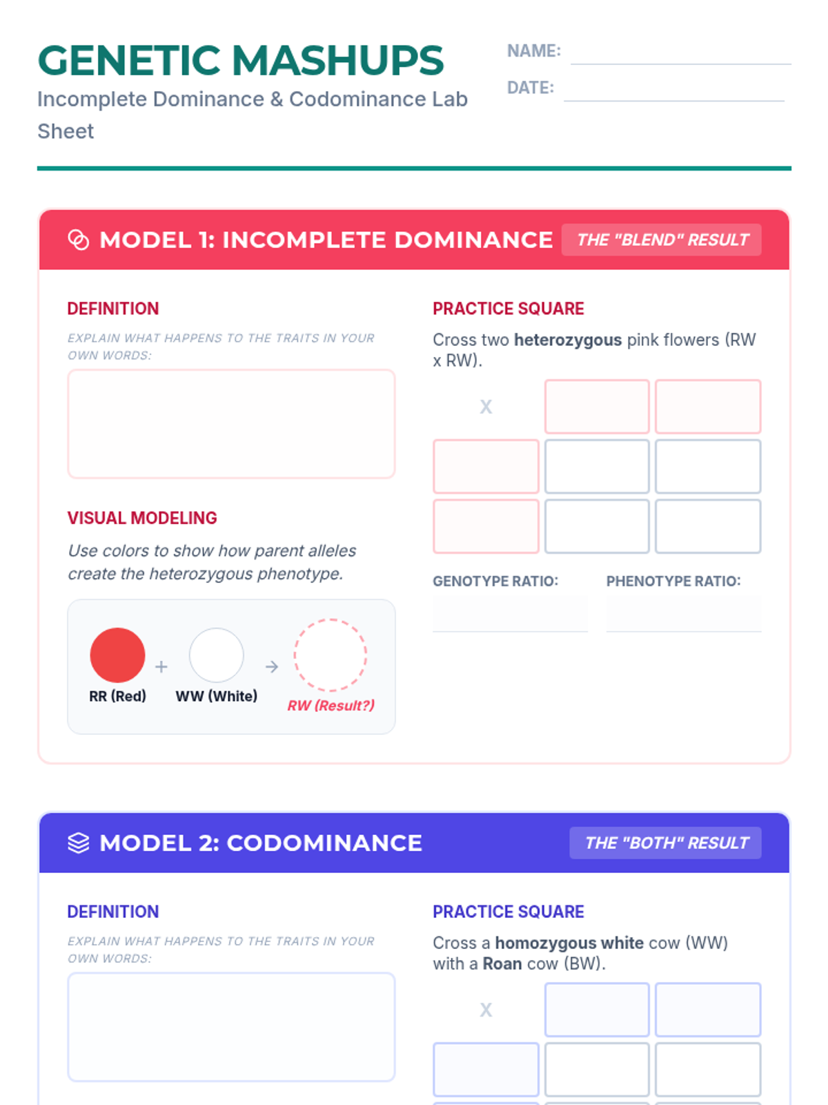 A lesson exploring non-Mendelian inheritance patterns, specifically focusing on how alleles interact in incomplete dominance and codominance through visual modeling and Punnett squares.