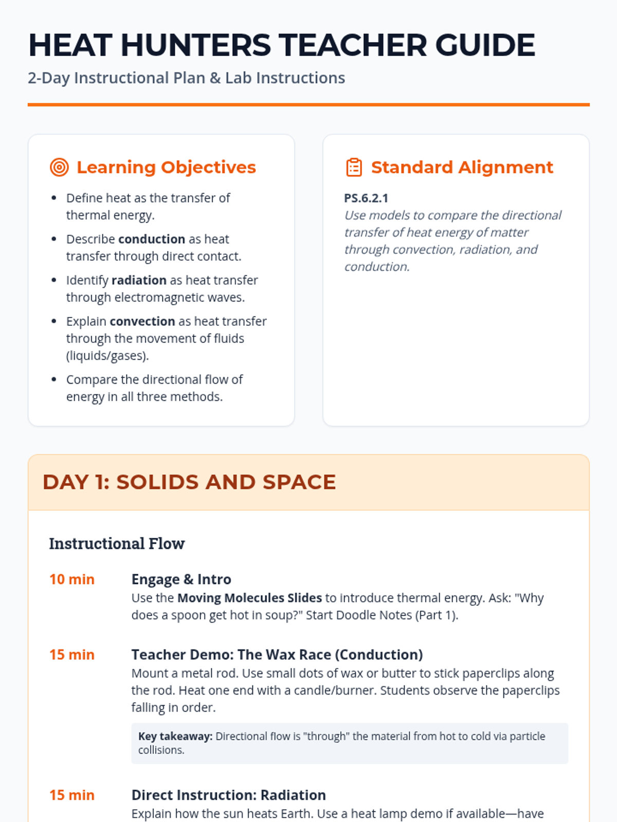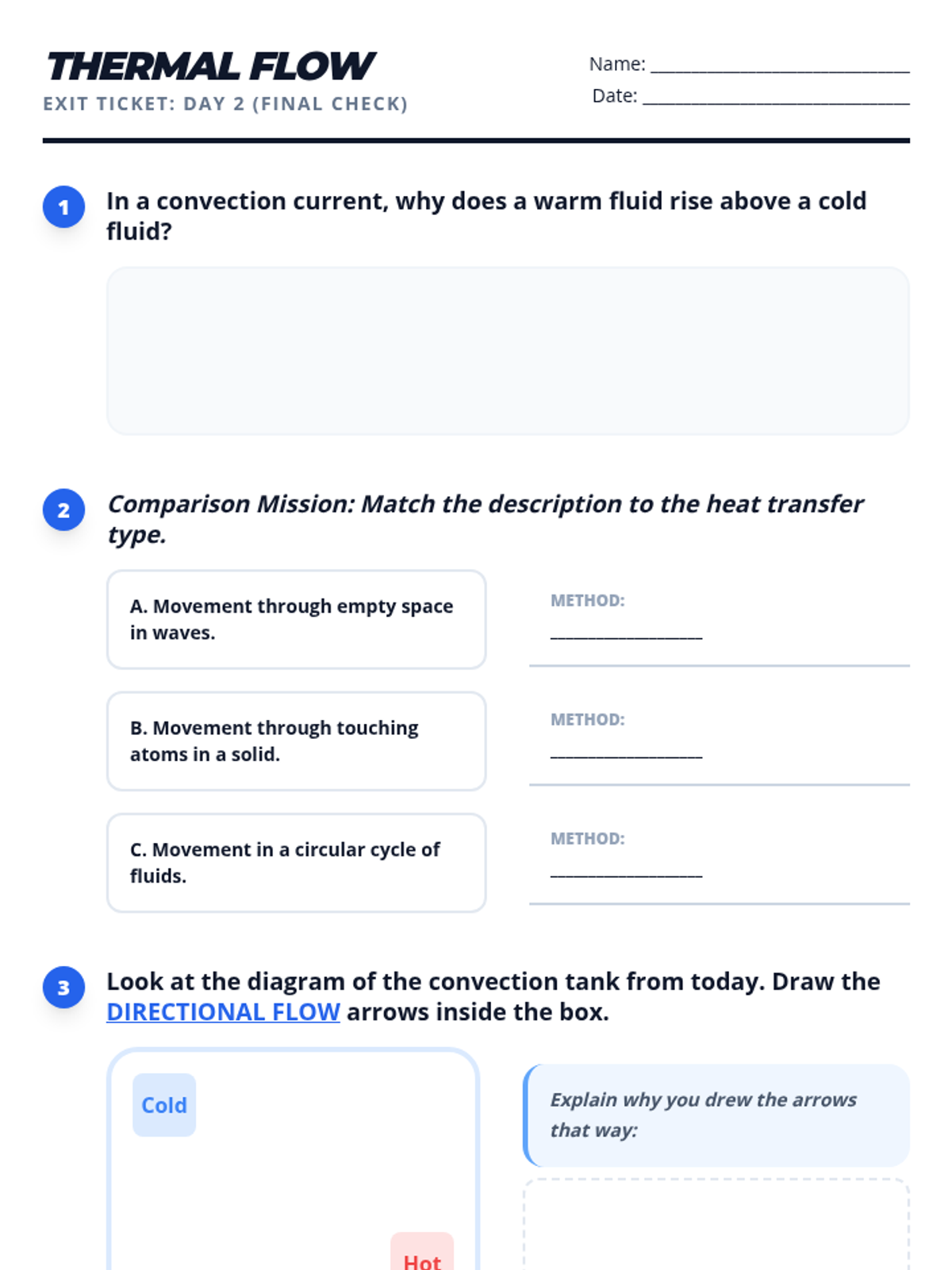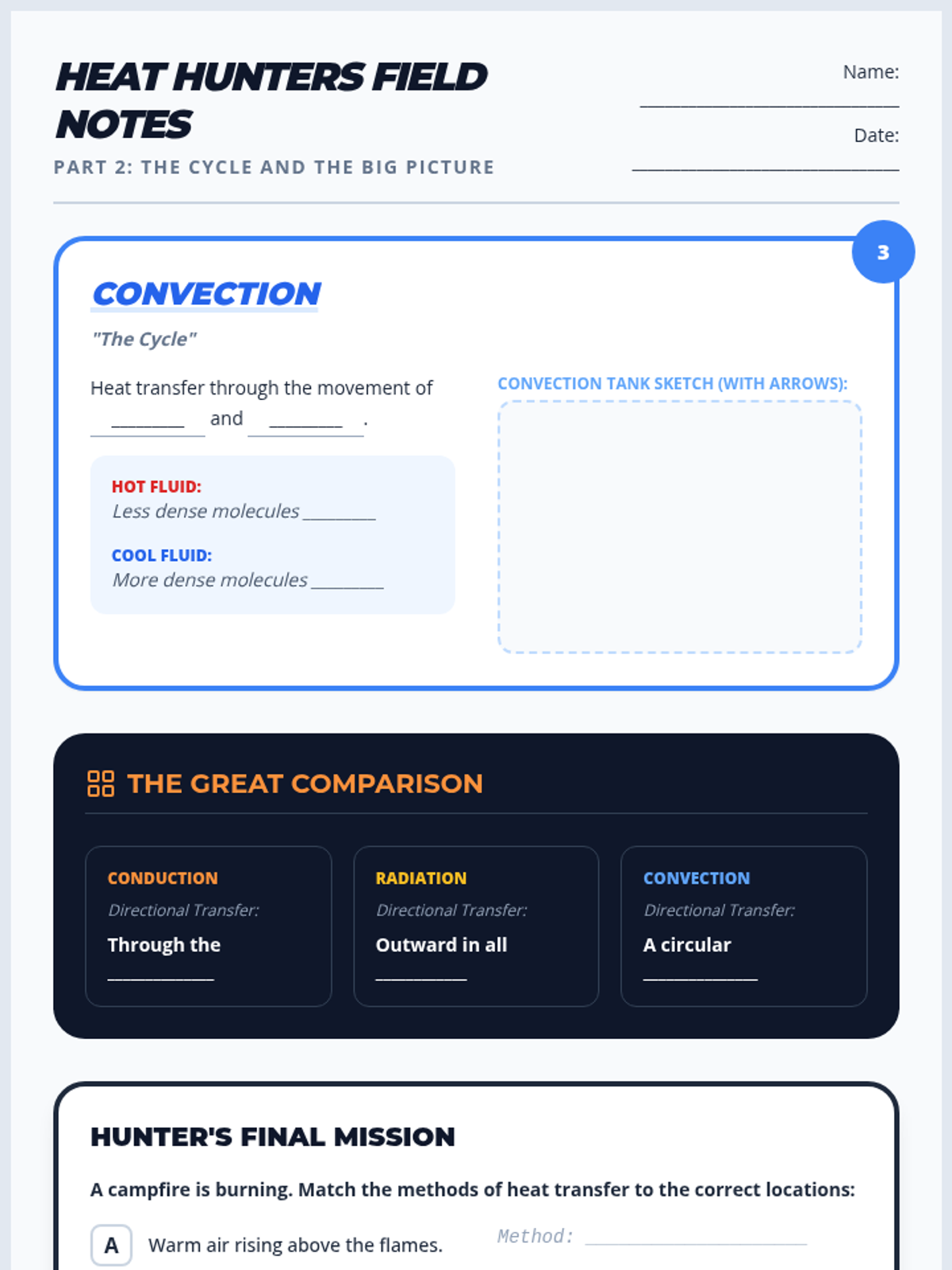 Exploration of convection currents in fluids and a final comparison of all three heat transfer methods. Includes a teacher-led demonstration of convection in water and a summary activity.