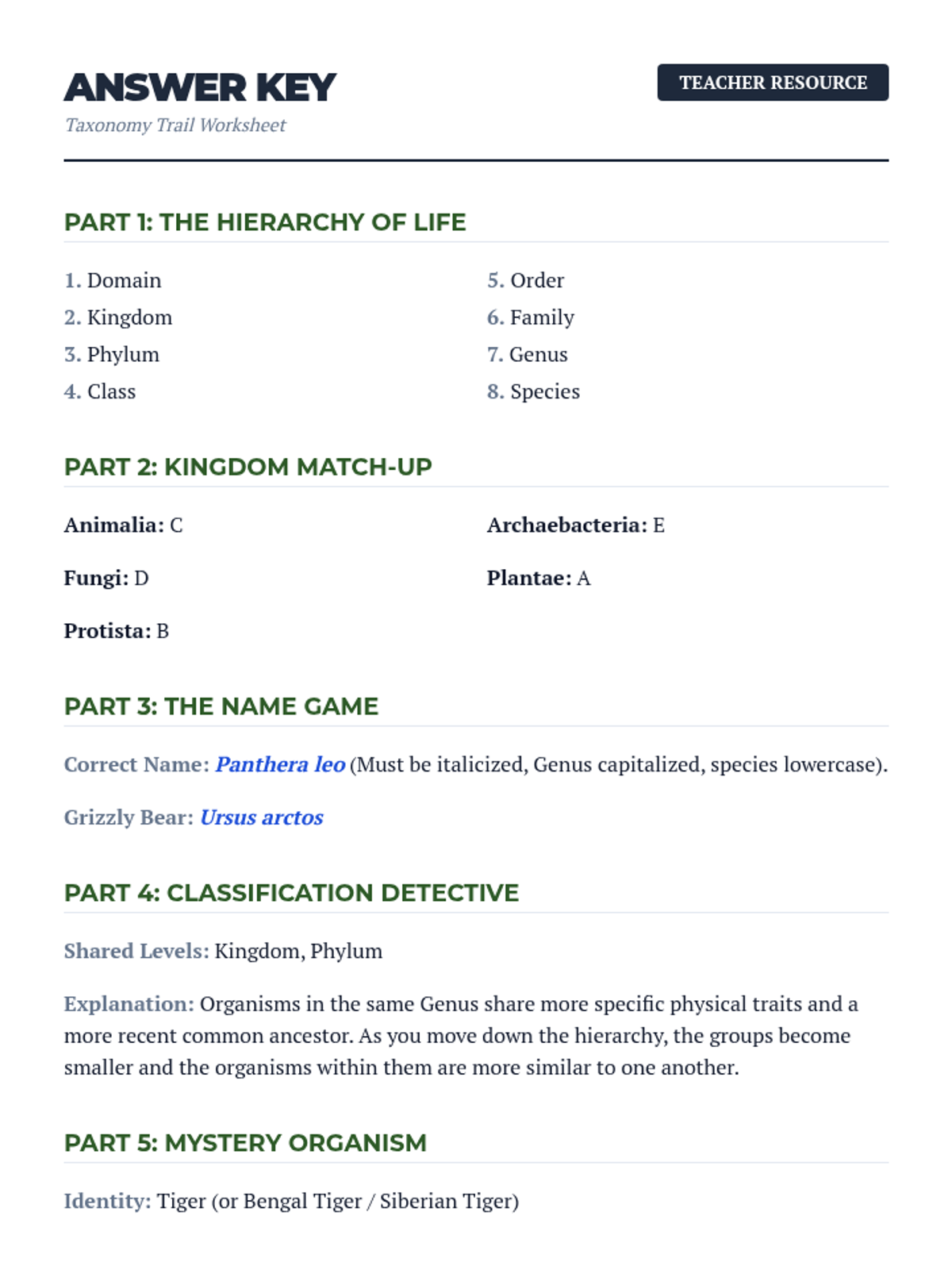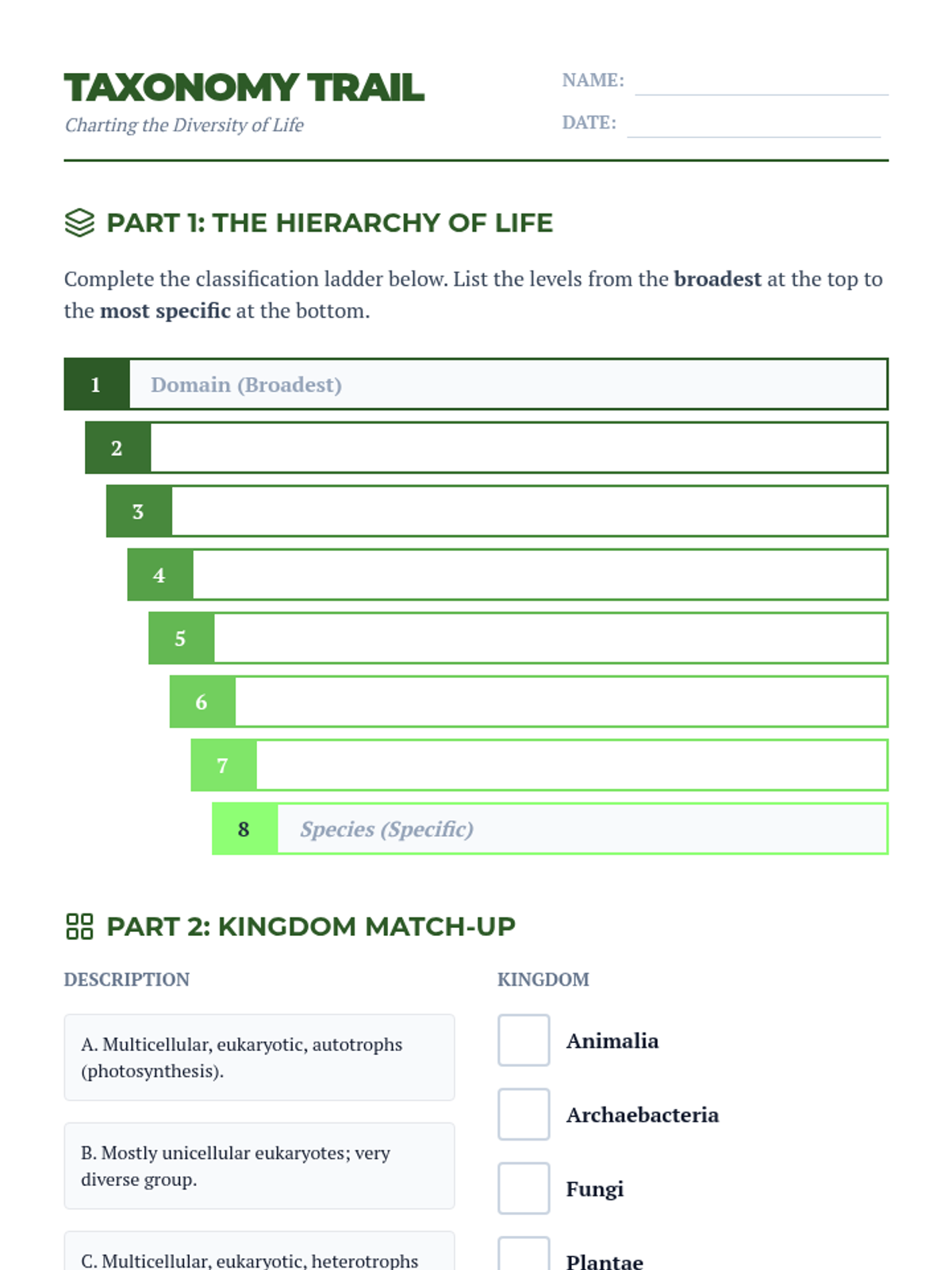 An introduction to biological classification, covering the three domains of life, the six kingdoms, and the hierarchical levels of taxonomy from domain to species.