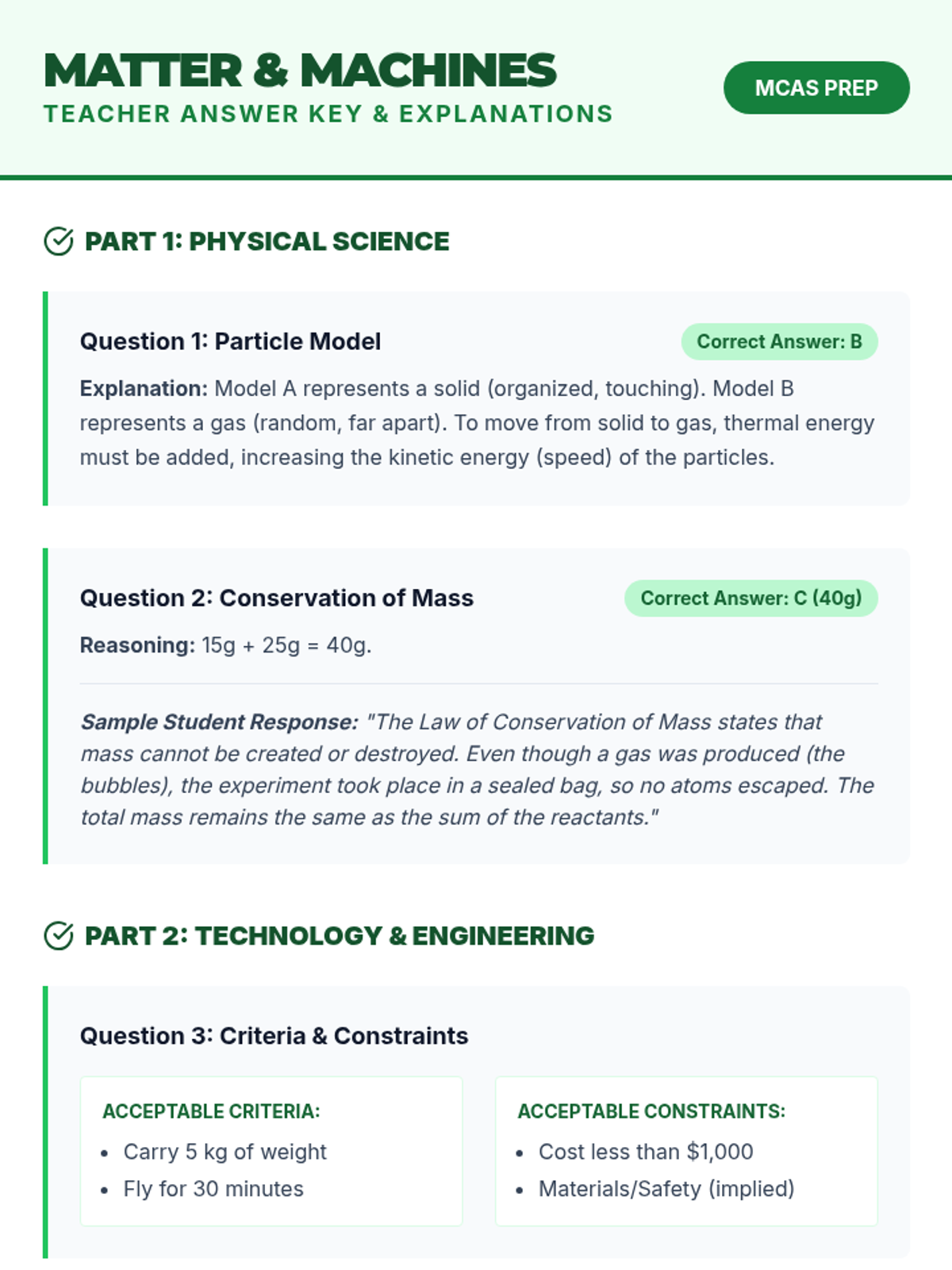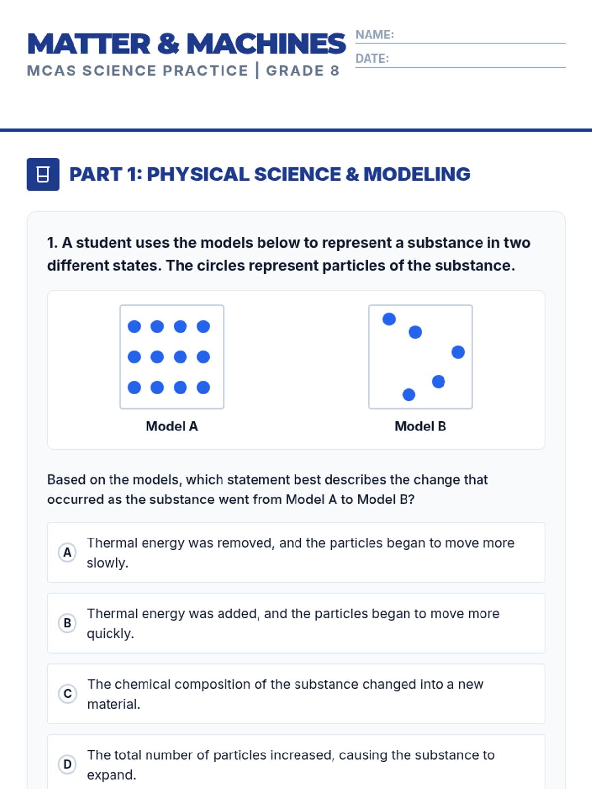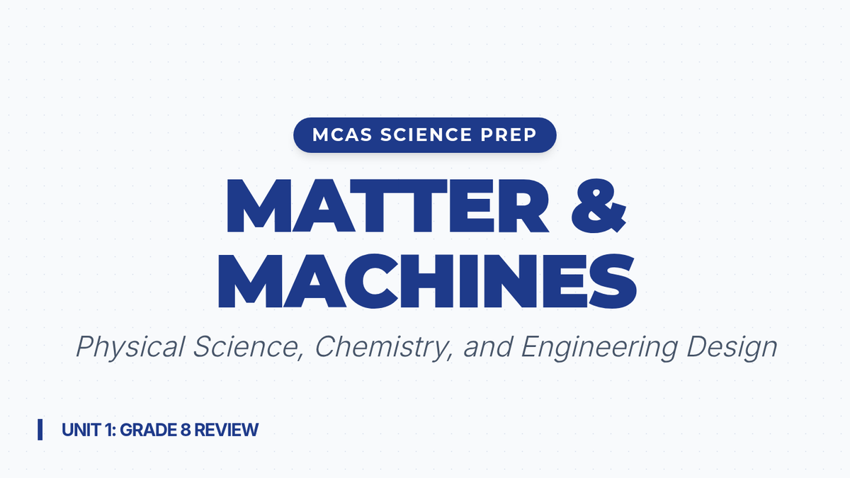 This lesson prepares 8th-grade students for the Massachusetts MCAS Science exam, focusing on physical science, chemistry, and technology/engineering through model-based reasoning and experimental design analysis.