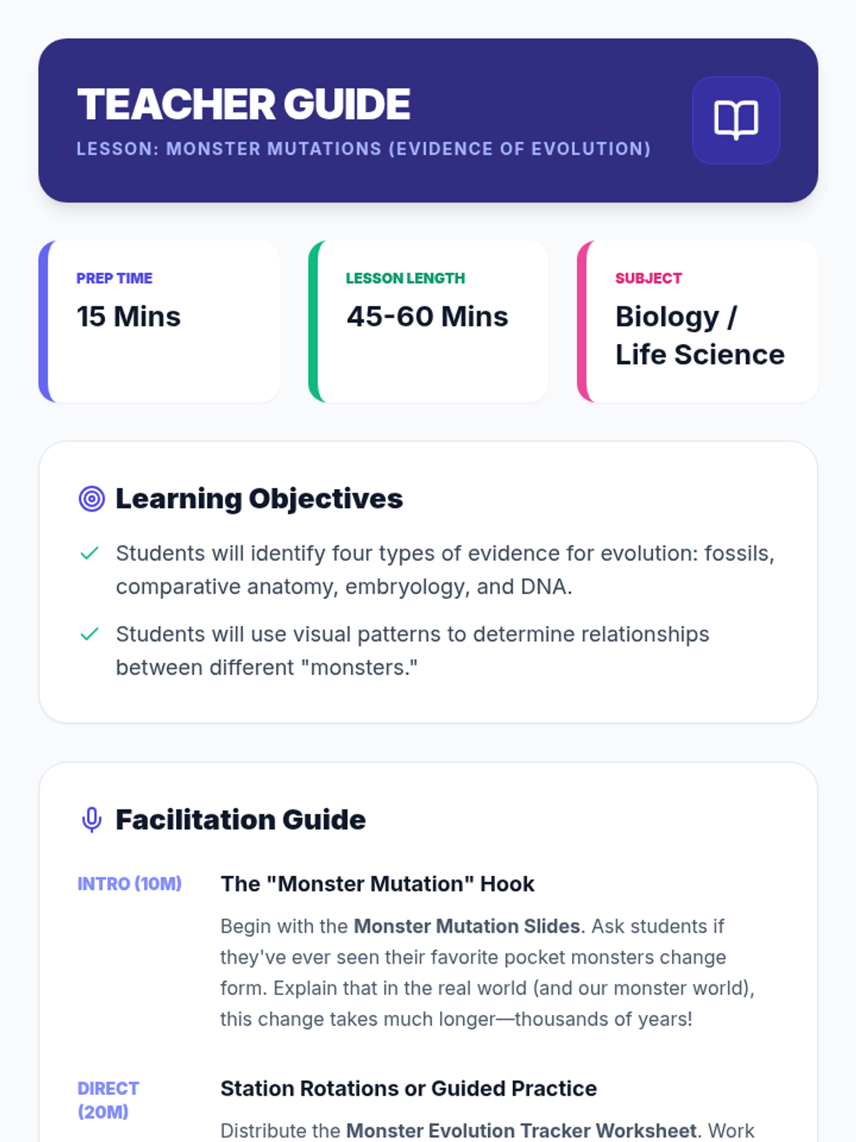 An engaging special education lesson exploring the evidence of evolution through the lens of pocket monsters. Students examine fossils, body structures, and DNA to understand how monsters change over time.
