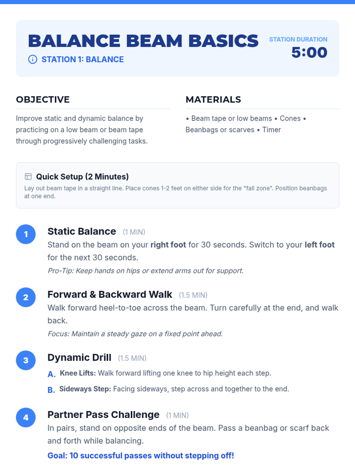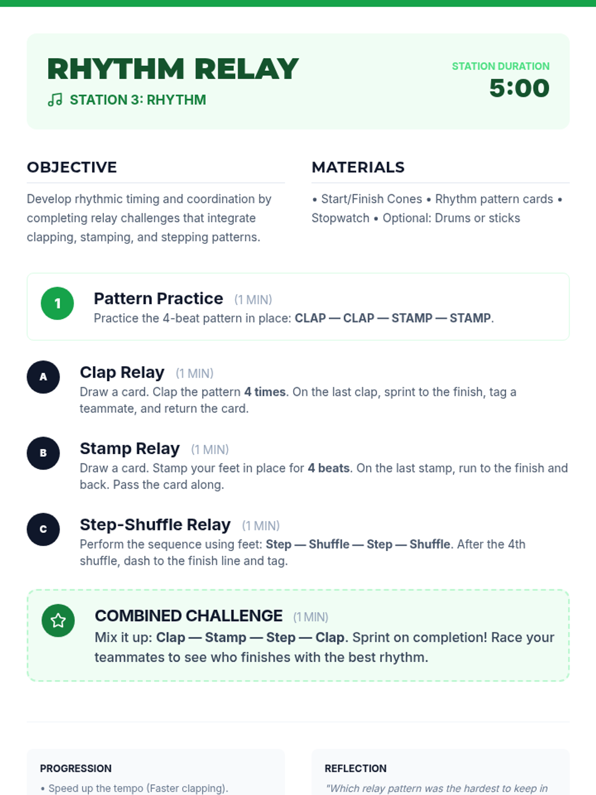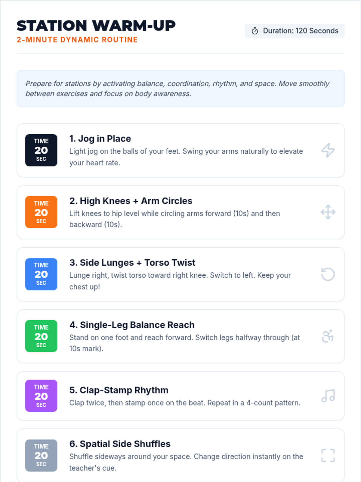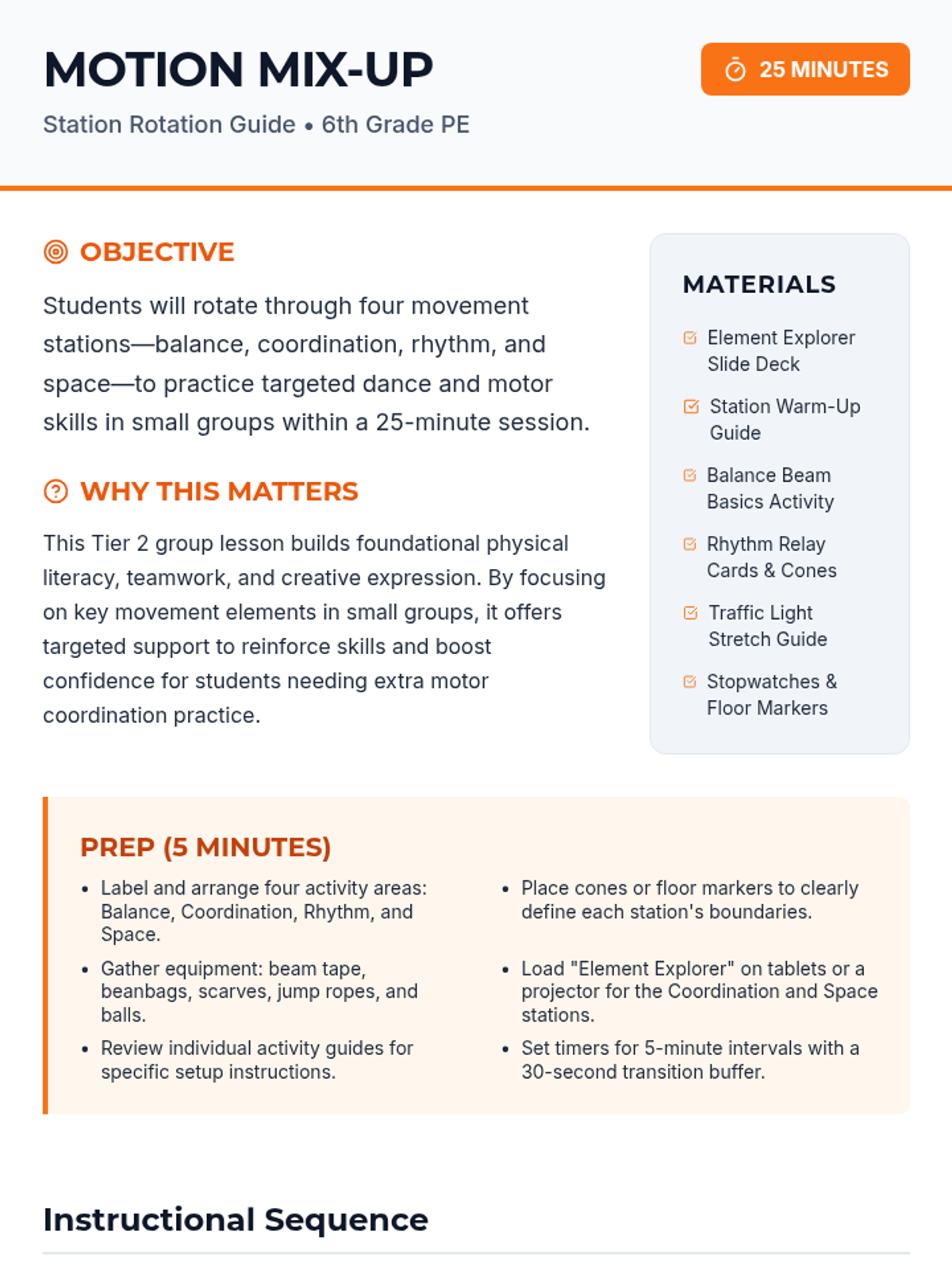 A 25-minute station rotation lesson focusing on balance, coordination, rhythm, and space through dynamic movement tasks. Designed for Tier 2 support, it emphasizes physical literacy and creative expression.