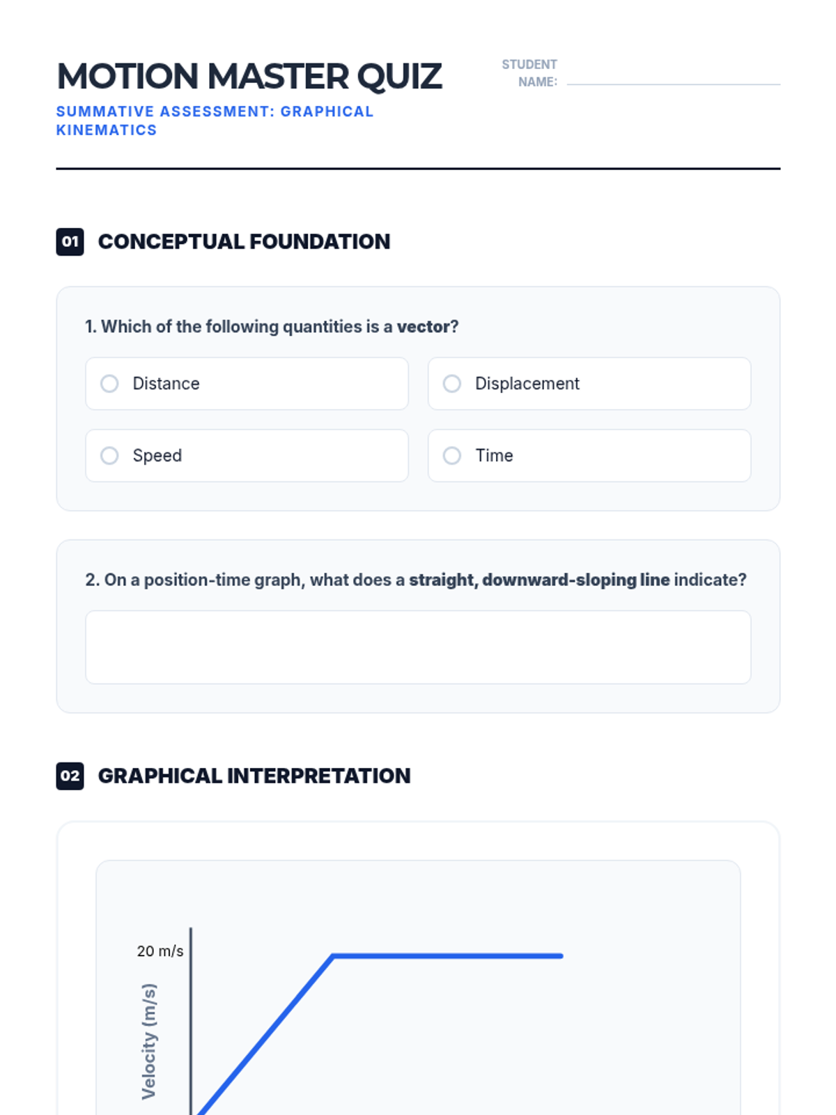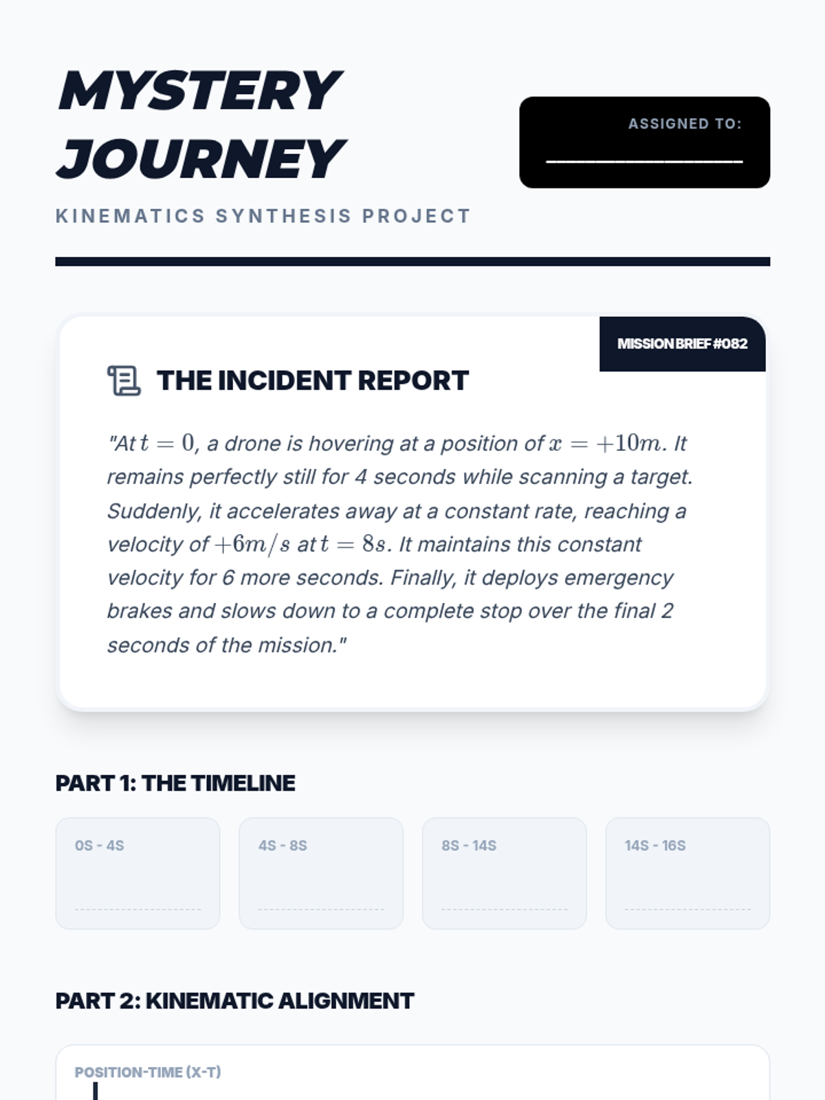 Students translate complex word problems and stories into stacked x-t, v-t, and a-t graphs. Peer review identifies inconsistencies in the alignment of kinematic variables.