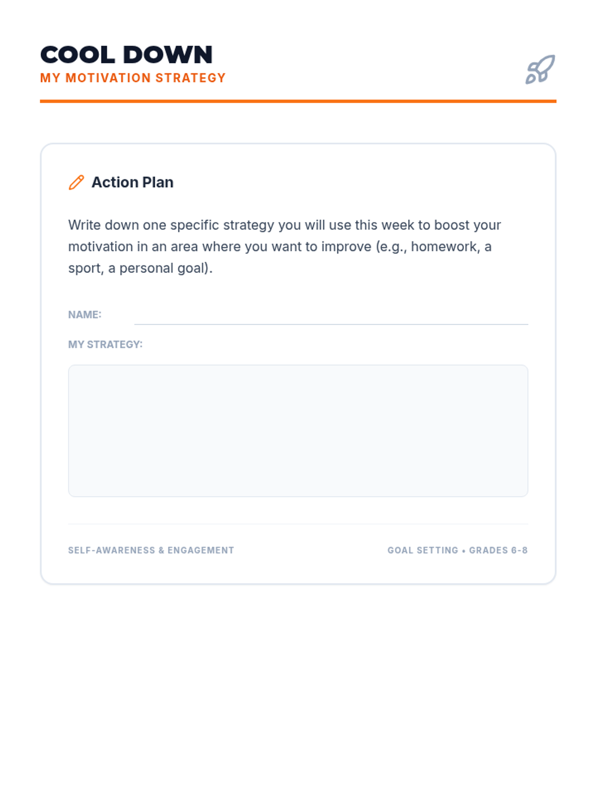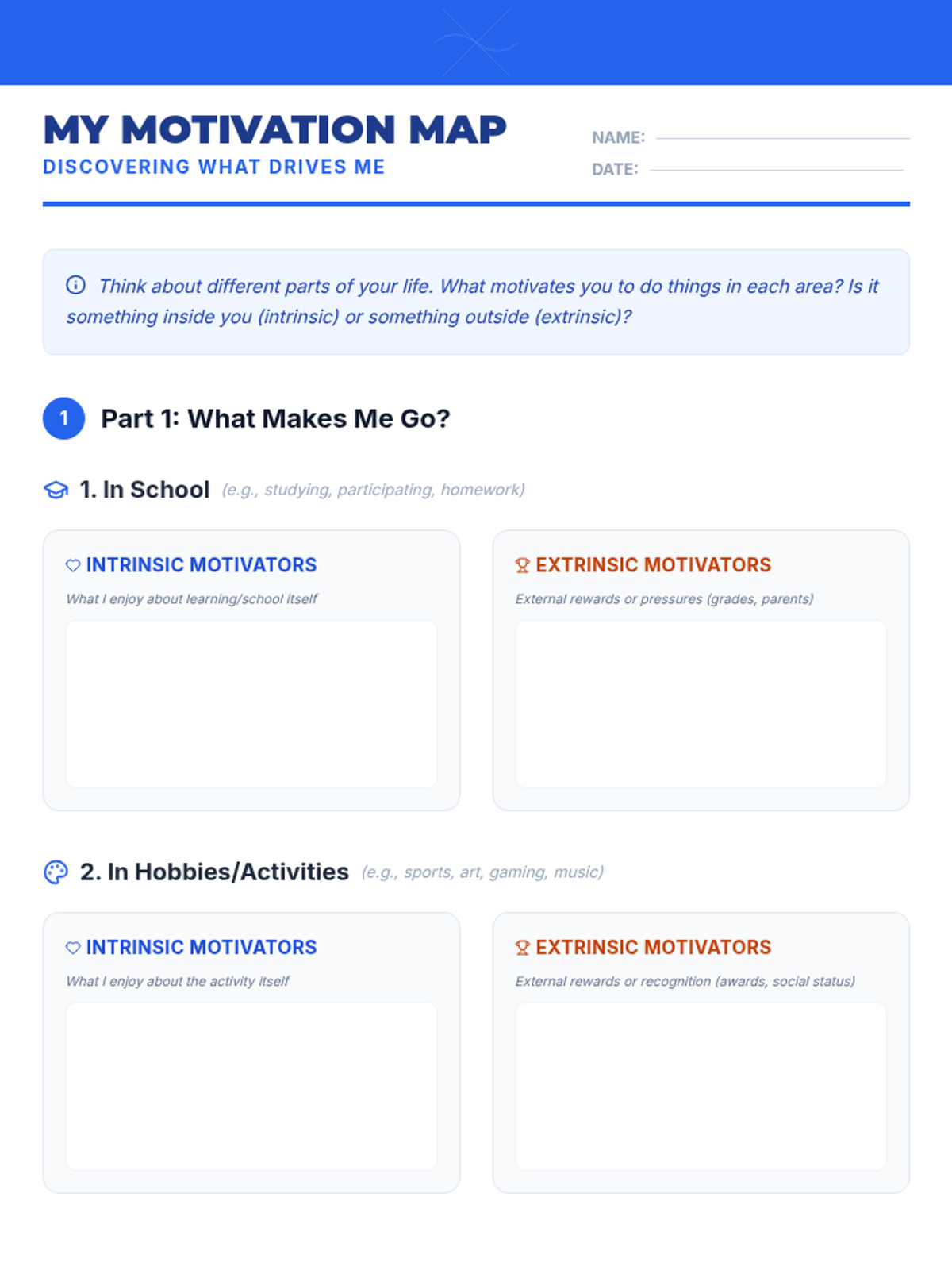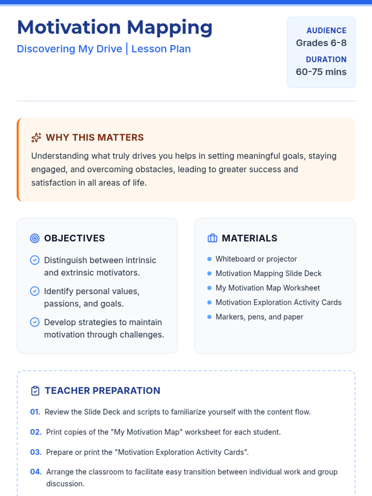 A comprehensive lesson for middle schoolers to explore intrinsic and extrinsic motivation, identify personal drivers, and develop strategies for staying engaged in academics and personal goals.
