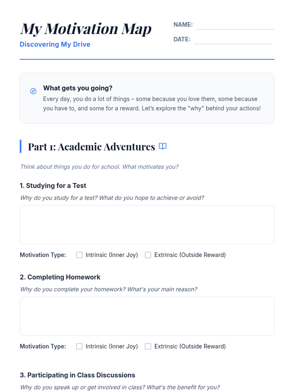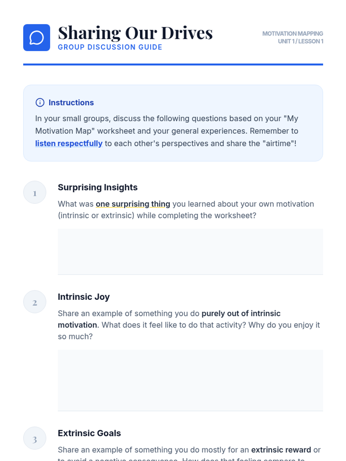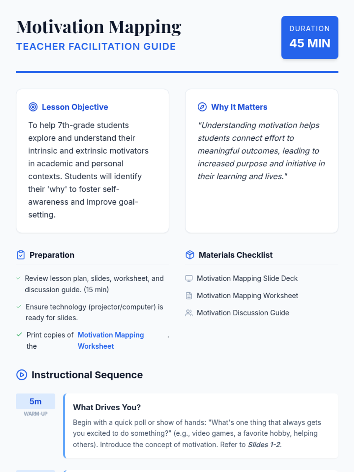 A 45-minute lesson for 7th-grade students to explore intrinsic and extrinsic motivation, identify their personal 'why', and connect their efforts to meaningful goals.