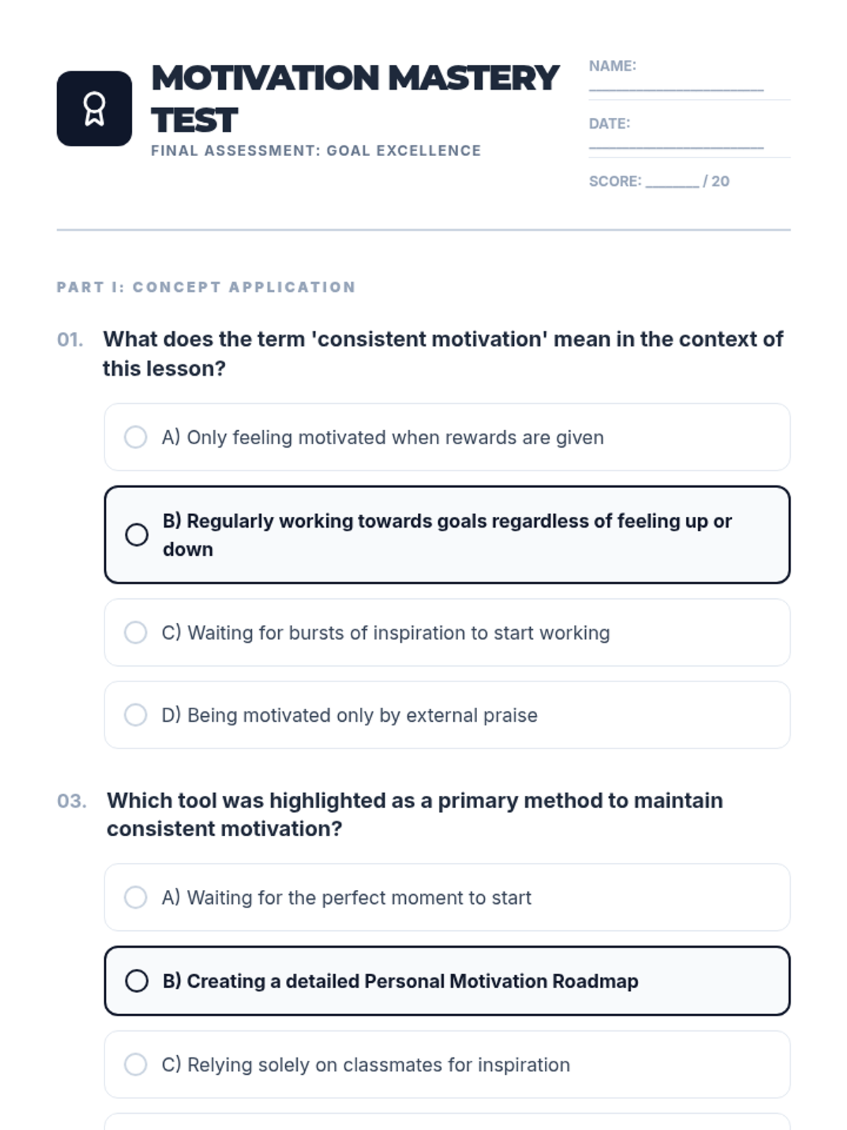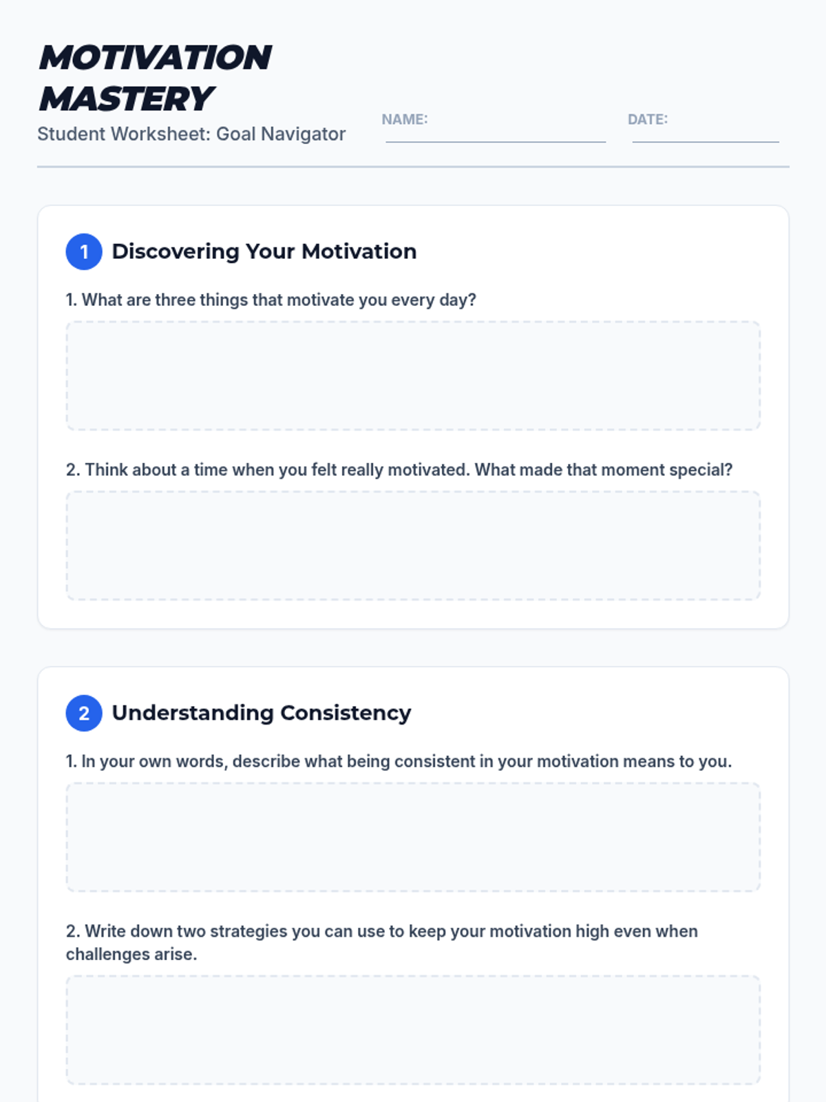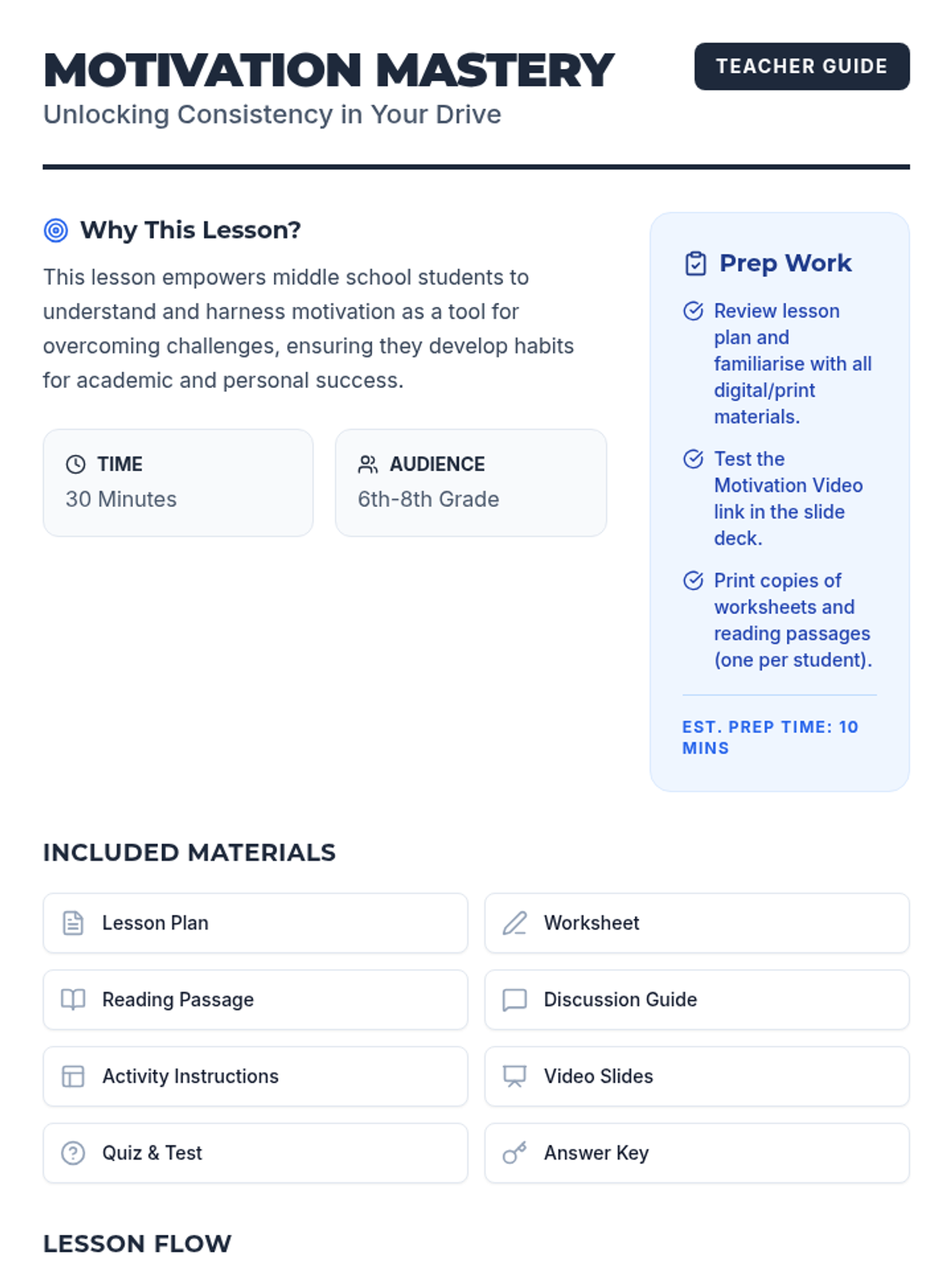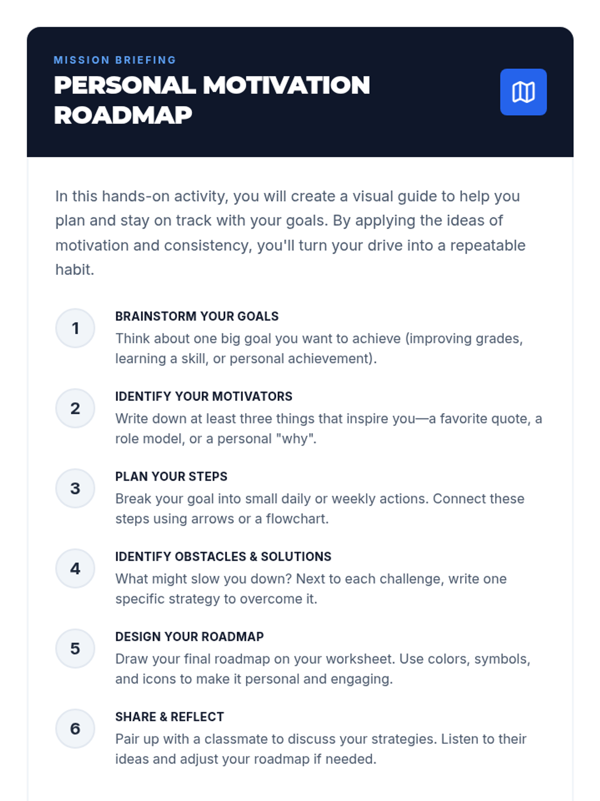 This lesson for middle schoolers explores the science and habit of motivation, focusing on the critical role of consistency in achieving long-term goals. Students will analyze real-life scenarios, create a personal motivation roadmap, and develop strategies to overcome obstacles.