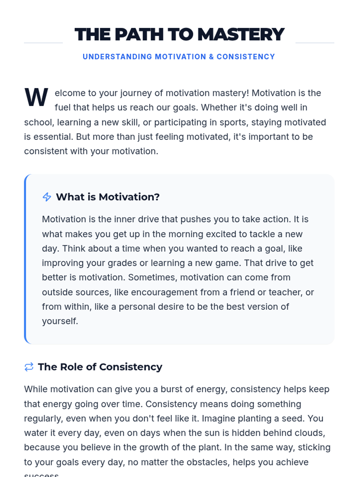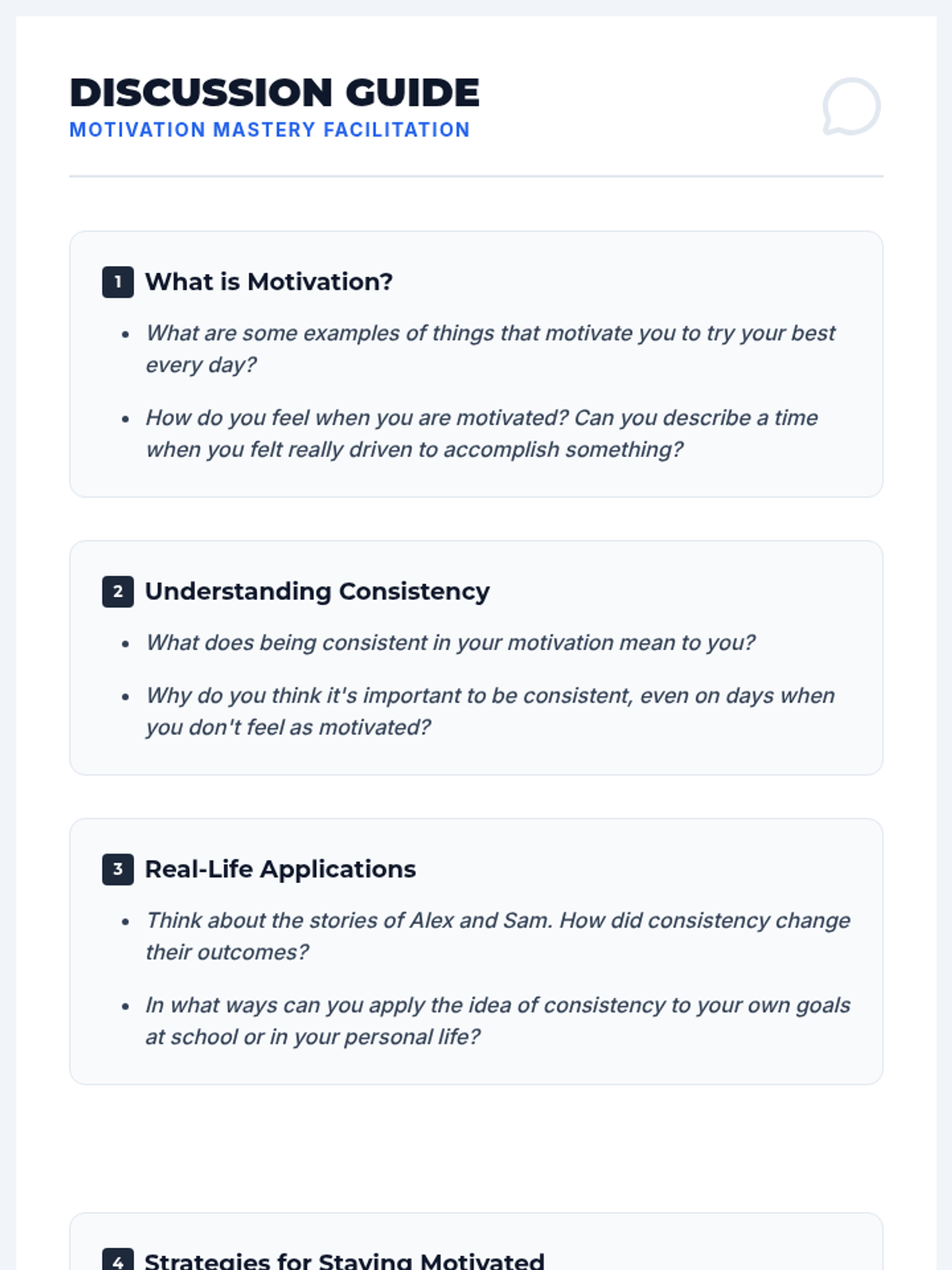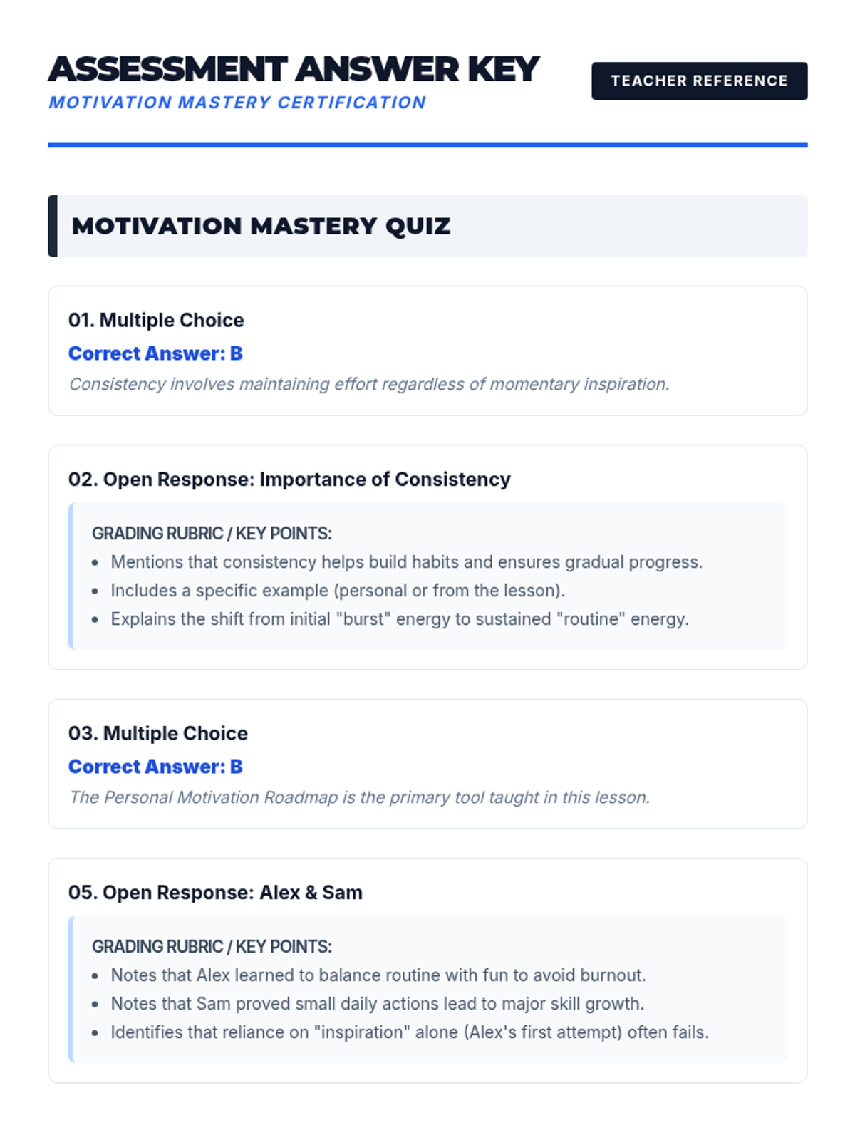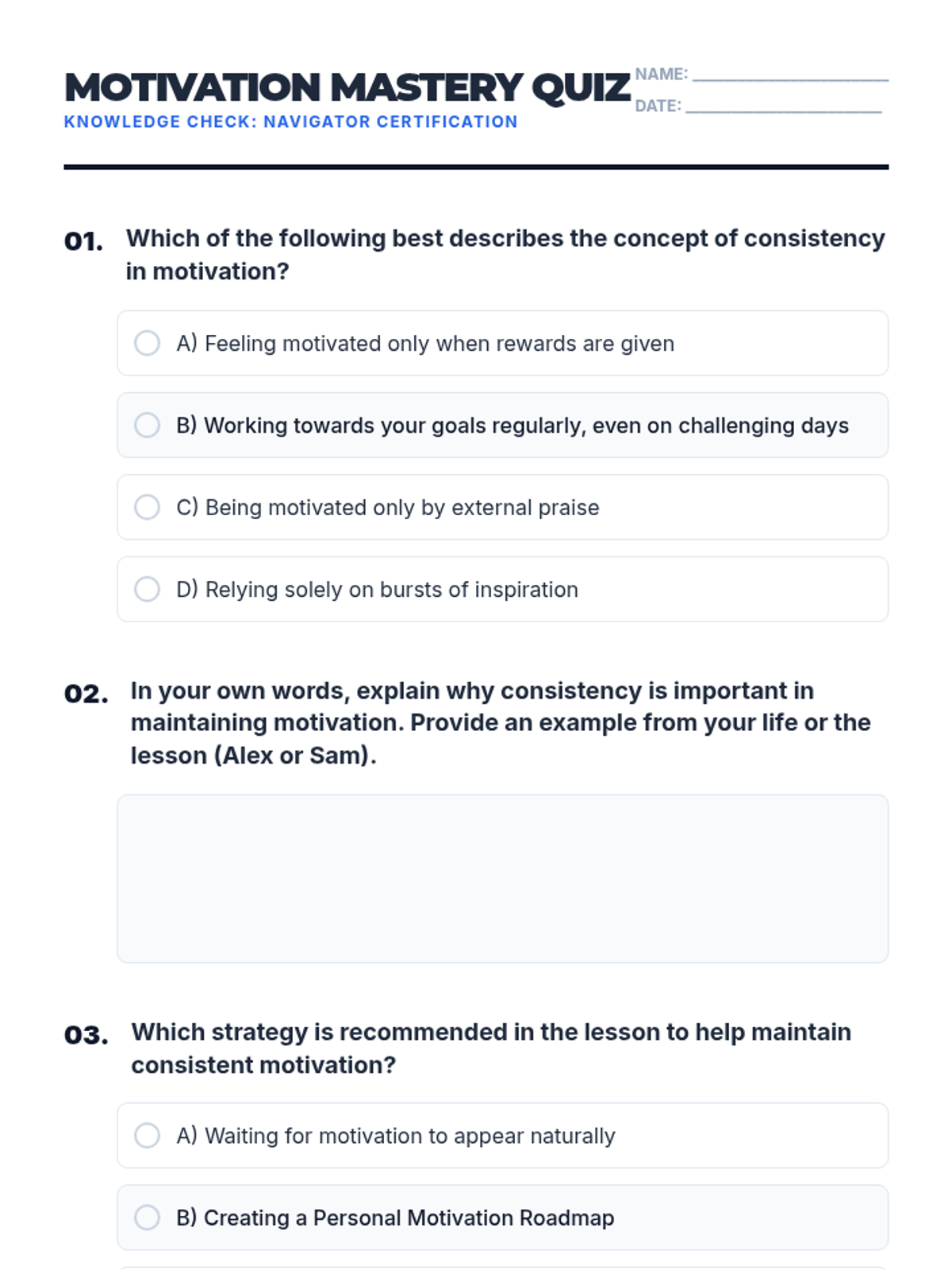 This lesson for middle schoolers explores the science and habit of motivation, focusing on the critical role of consistency in achieving long-term goals. Students will analyze real-life scenarios, create a personal motivation roadmap, and develop strategies to overcome obstacles.