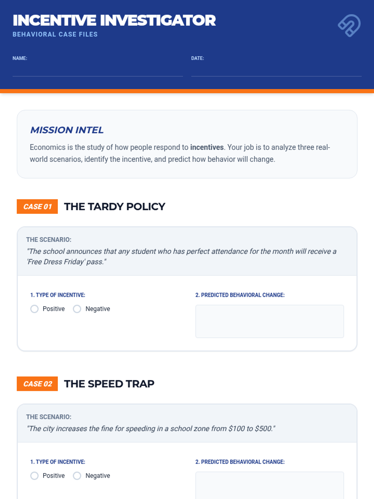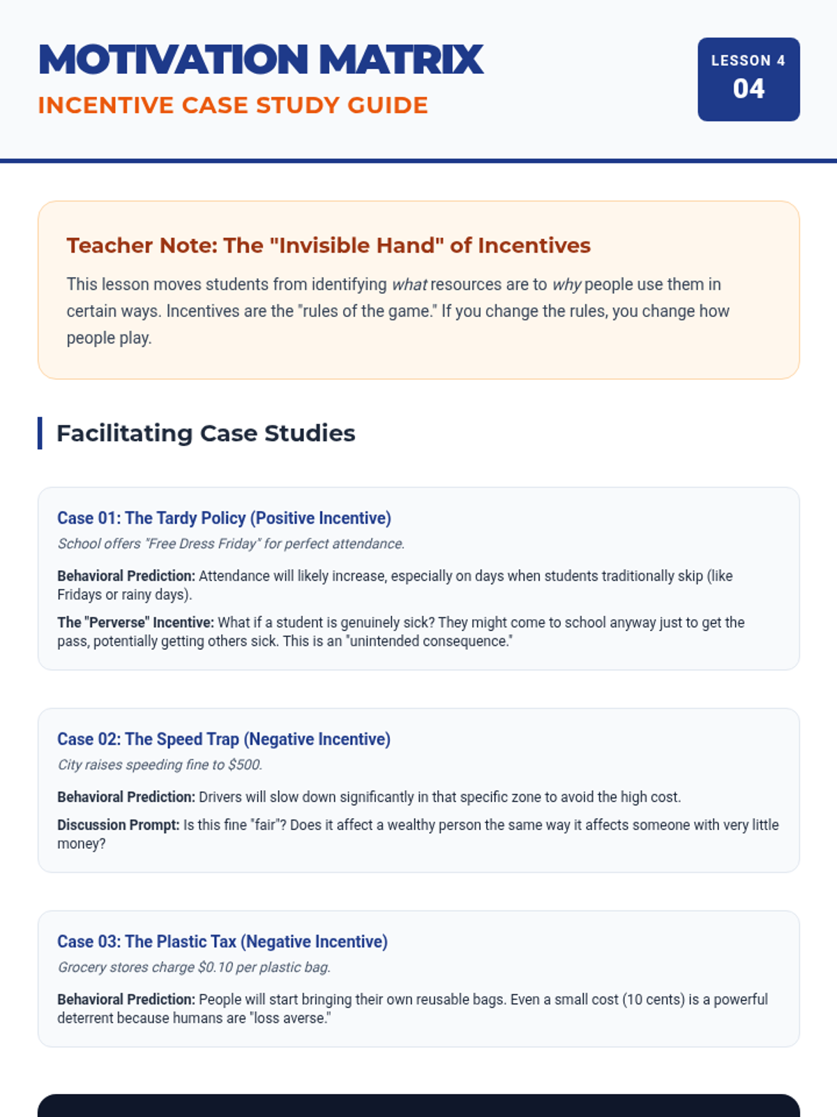 Students investigate how positive and negative incentives shape behavior in schools, households, and markets. Through a series of behavioral scenarios, they predict how changing a reward or penalty alters the outcome.